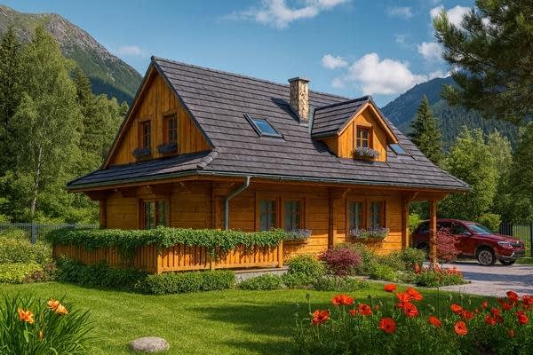 Projekt domu A-100 „DOM SŁODKA” – niewielki dom jednorodzinny w stylu górskim Projekt A-100 „DOM SŁODKA” to propozycja dla osób marzących o kameralnym domu jednorodzinnym nawiązującym do architektury górskiej. Niewielka, prosta bryła wzbogacona została o charakterystyczne przydaszki i lukarny, które dodają całości tradycyjnego uroku. Praktyczny układ pomieszczeń Na parterze zaplanowano duże pomieszczenia gospodarcze z osobnym wejściem z zewnątrz. To wygodne rozwiązanie, które pozwala na swobodne przechowywanie sprzętu ogrodowego, rowerów czy narzędzi, bez potrzeby korzystania z części mieszkalnej. Poddasze mieszkalne oferuje funkcjonalny i wygodny układ – znajduje się tu sypialnia rodziców z garderobą, co zapewnia komfort i prywatność, a także dodatkowe pokoje dla domowników. Centralnym punktem poddasza jest łazienka z lukarną, która dzięki naturalnemu światłu zyskuje wyjątkowy klimat. Projekt dla osób ceniących wygodę i tradycję Projekt domu A-100 „DOM SŁODKA” to idealny wybór dla tych, którzy szukają niewielkiego, funkcjonalnego domu jednorodzinnego w stylu górskim. Estetyczna bryła, praktyczne pomieszczenia gospodarcze i komfortowa strefa nocna czynią ten projekt doskonałym rozwiązaniem zarówno na działkę miejską, jak i podmiejską.Rzuty