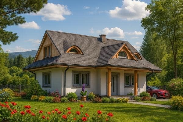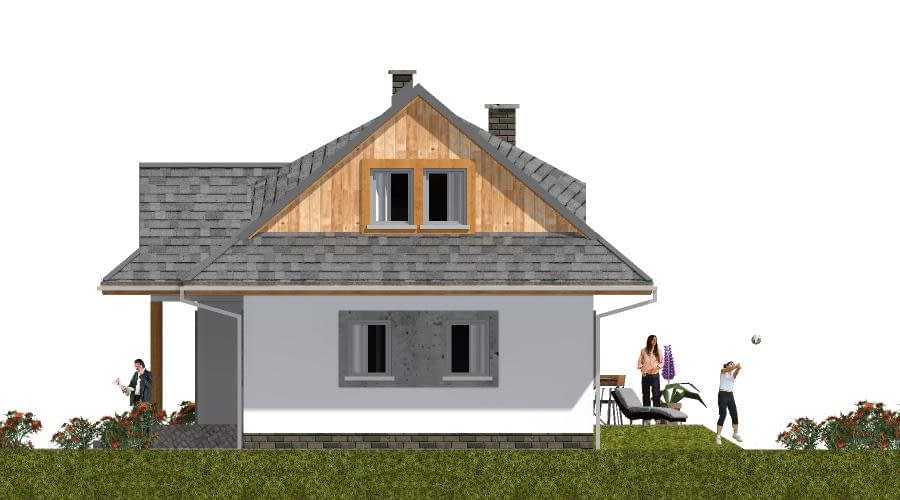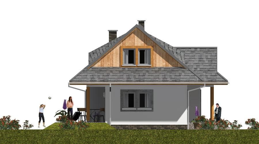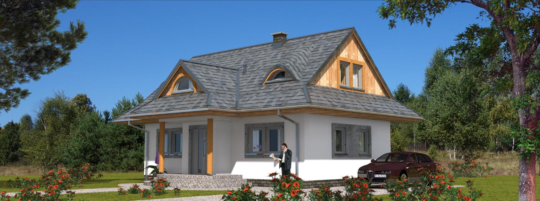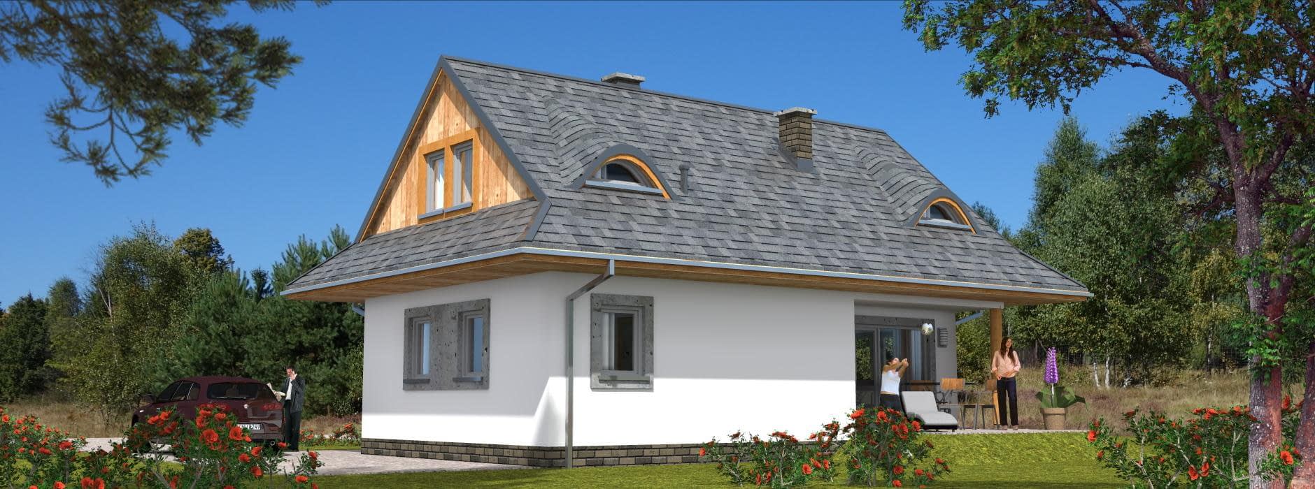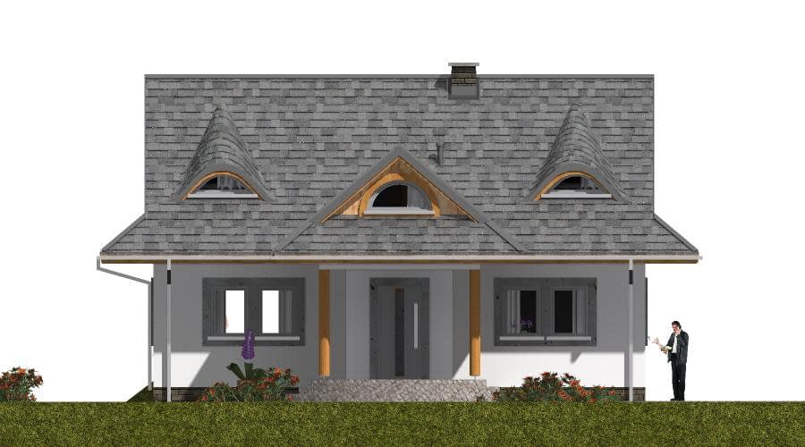 Projekt domu A-102 „DOM WRONIA” – tradycyjny dom parterowy z poddaszem i czterema sypialniami Projekt A-102 „DOM WRONIA” to wyjątkowy przykład, jak niewielki dom jednorodzinny parterowy z poddaszem mieszkalnym może łączyć tradycyjny styl góralski z nowoczesnymi rozwiązaniami funkcjonalnymi. Bryła budynku jest prosta i elegancka, a jej charakter podkreślają wolie oczka i przydaszki, które nadają całości klimatu inspirowanego góralską architekturą. Parter – strefa życia rodzinnego Parter domu został przeznaczony na wspólne życie domowników. Znajduje się tutaj przestronny salon z dużymi przeszkleniami, jadalnia z widokiem na ogród oraz funkcjonalna kuchnia. Dzięki otwartemu układowi przestrzeń sprzyja integracji i wspólnemu spędzaniu czasu. Parter uzupełniają pomieszczenia pomocnicze, które zwiększają wygodę użytkowania domu. Poddasze – prywatna przestrzeń mieszkańców Cała strefa nocna została zlokalizowana na poddaszu. Projekt przewiduje cztery komfortowe sypialnie, które można dostosować do potrzeb domowników – jako pokoje dla dzieci, sypialnia główna czy dodatkowy pokój gościnny. Na poddaszu znajduje się także wygodna łazienka, w której można zmieścić zarówno wannę, jak i prysznic. Styl góralski w nowoczesnym wydaniu Projekt „DOM WRONIA” A-102 to doskonała propozycja dla osób ceniących kameralne domy jednorodzinne z charakterem. Dach z wolimi oczkami i przydaszkami sprawia, że dom nawiązuje do tradycji góralskiej, a jednocześnie wygląda elegancko i ponadczasowo. To dom, który łączy klimatyczną estetykę z praktycznym układem wnętrz, zapewniając wygodę rodzinie 4–5-osobowej.Rzuty
