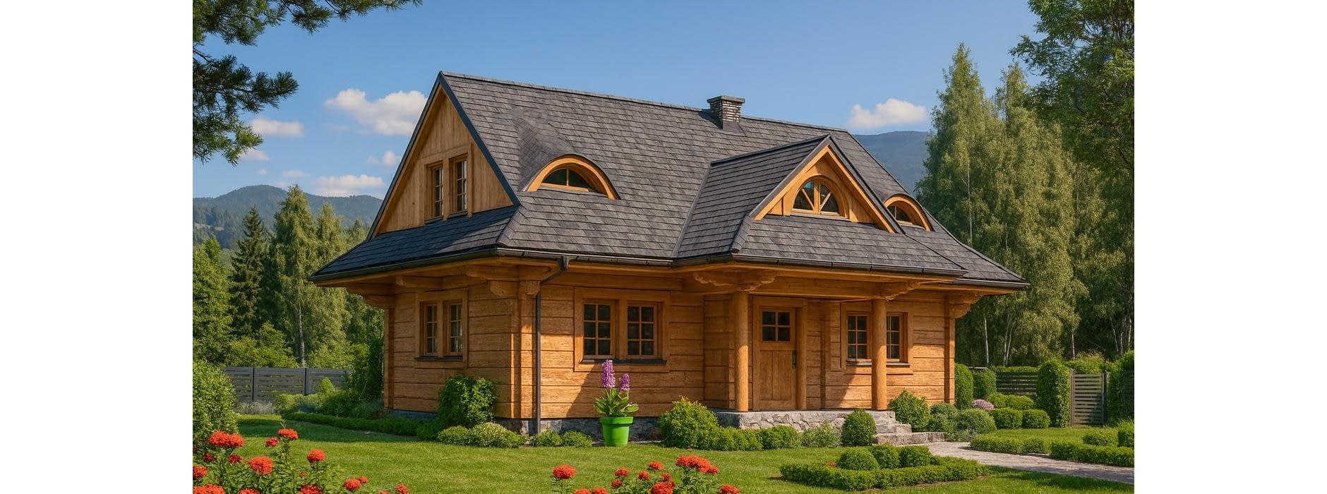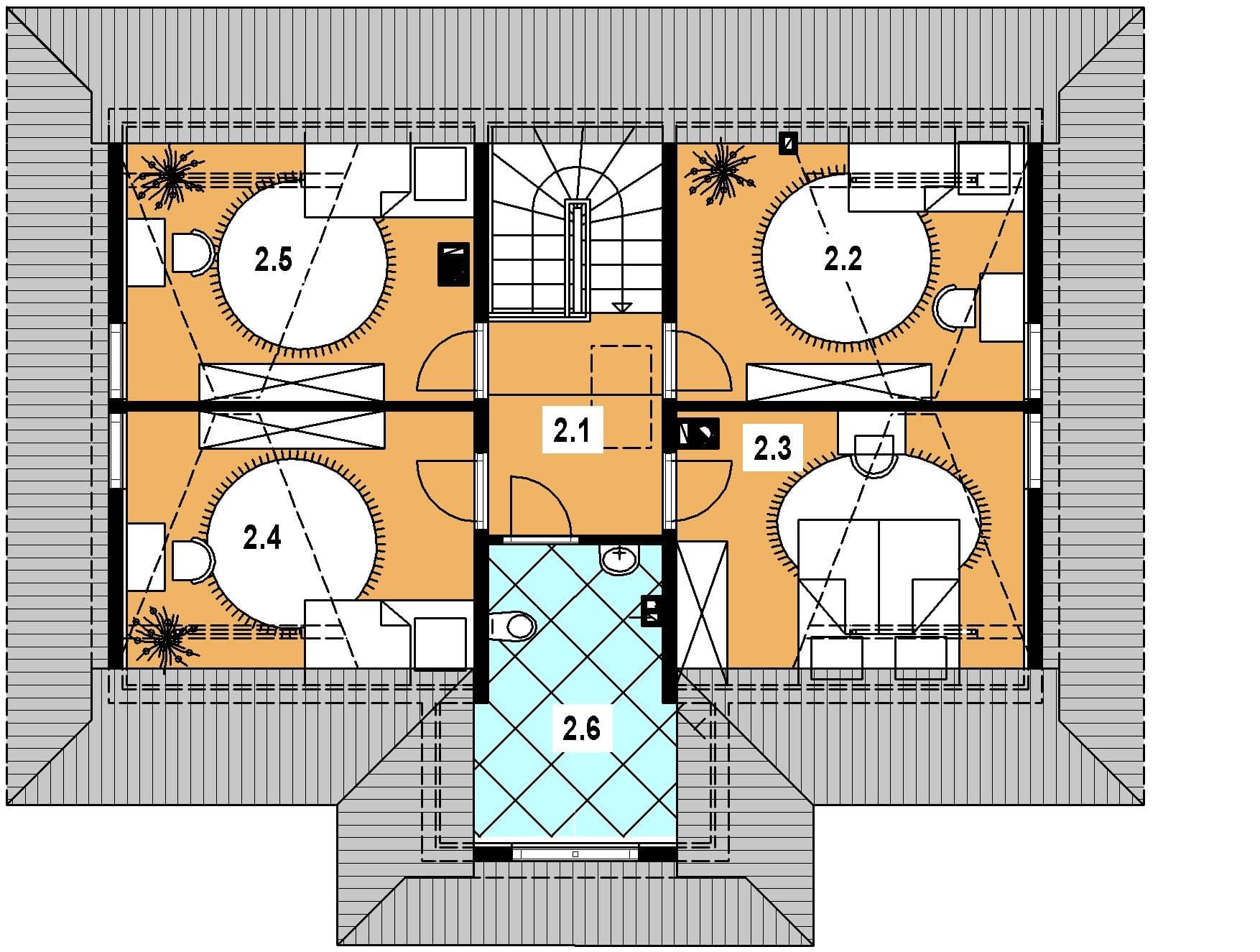 Projekt domu A-102 „DOM WRONIA” – niewielki dom parterowy z poddaszem w stylu góralskim Projekt A-102 „DOM WRONIA” to propozycja dla osób poszukujących niewielkiego domu jednorodzinnego z poddaszem mieszkalnym, w którym tradycyjna forma łączy się z nowoczesnym układem funkcjonalnym. Budynek parterowy, niepodpiwniczony, został zaprojektowany w stylu góralskim. Szczególną uwagę przyciąga charakterystyczny dach z wolimi oczkami i przydaszkami, które nadają mu wyjątkowego uroku. Parter – otwarta strefa dzienna Na parterze zaplanowano przestrzeń wspólną dla całej rodziny. Centralnym punktem jest salon z wyjściem na ogród, połączony z jadalnią i funkcjonalną kuchnią. Układ pomieszczeń uzupełniają pomieszczenia pomocnicze i komunikacja, co czyni tę kondygnację praktyczną i wygodną w codziennym użytkowaniu. Poddasze – cztery wygodne sypialnie Cała strefa nocna została umieszczona na poddaszu mieszkalnym. Zaprojektowano tam cztery ustawne i dobrze doświetlone sypialnie, które zapewniają mieszkańcom komfort i prywatność. Na tej kondygnacji przewidziano także wygodną łazienkę z możliwością aranżacji zarówno wanny, jak i prysznica. Dom z góralskim charakterem Projekt domu „DOM WRONIA” A-102 nawiązuje do architektury góralskiej – dach z wolimi oczkami i przydaszkami sprawia, że budynek wyróżnia się niepowtarzalnym stylem i świetnie komponuje się z działką w otoczeniu natury. To idealna propozycja dla osób marzących o kameralnym, tradycyjnym domu jednorodzinnym z wygodnym poddaszem.Rzuty