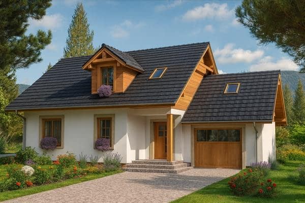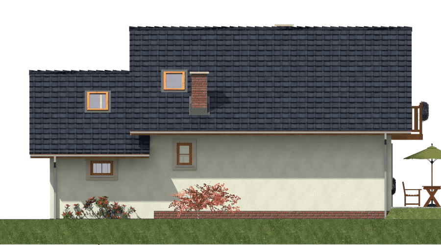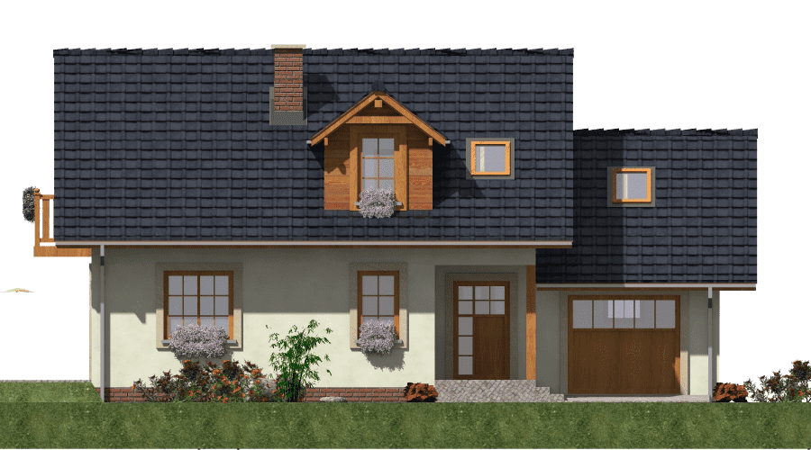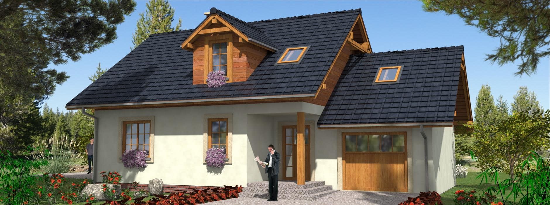 Projekt domu parterowego z poddaszem A-103 „DOM JARZĘBATA” – tradycyjny styl, poddasze użytkowe i garaż Projekt domu A-103 „DOM JARZĘBATA” to propozycja dla rodzin poszukujących funkcjonalnego domu parterowego z poddaszem mieszkalnym i garażem jednostanowiskowym. Prosta bryła w tradycyjnym stylu, dach dwuspadowy oraz praktyczny układ pomieszczeń sprawiają, że dom spełni oczekiwania osób ceniących komfort i estetykę. Strefa dzienna na parterze została zaprojektowana z myślą o wspólnym życiu rodziny. Salon z dużymi przeszkleniami otwiera się na ogród i taras, a jadalnia połączona z kuchnią tworzy przyjazną przestrzeń do wspólnych posiłków. Obok znajduje się dodatkowy pokój – idealny jako gabinet, sypialnia gościnna lub pokój hobby. W bryle budynku uwzględniono garaż jednostanowiskowy połączony bezpośrednio z domem, co stanowi duże udogodnienie, szczególnie w chłodniejsze miesiące i deszczowe dni. Garaż dopełnia funkcjonalność projektu i podnosi jego praktyczną wartość. Poddasze użytkowe to prywatna strefa mieszkańców – trzy ustawne sypialnie i przestronna łazienka zapewniają komfort i swobodę. Łazienka została zaplanowana tak, aby pomieścić zarówno wannę, jak i prysznic, co odpowiada potrzebom całej rodziny. Projekt domu A-103 „DOM JARZĘBATA” to połączenie tradycyjnej architektury z nowoczesnymi rozwiązaniami, które gwarantują wygodę na co dzień. Garaż w bryle budynku, pięć pokoi oraz funkcjonalne poddasze sprawiają, że jest to idealny dom dla rodziny marzącej o przestronnym, a jednocześnie przytulnym miejscu do życia.Rzuty