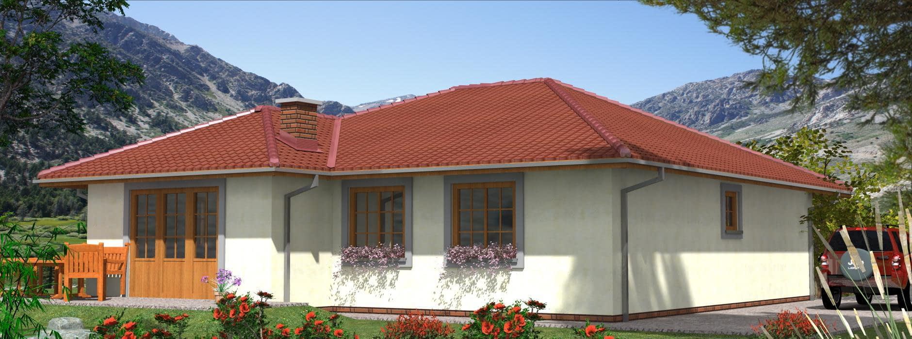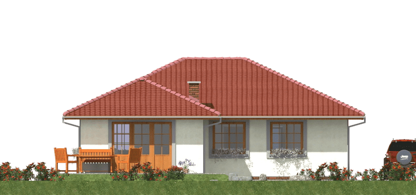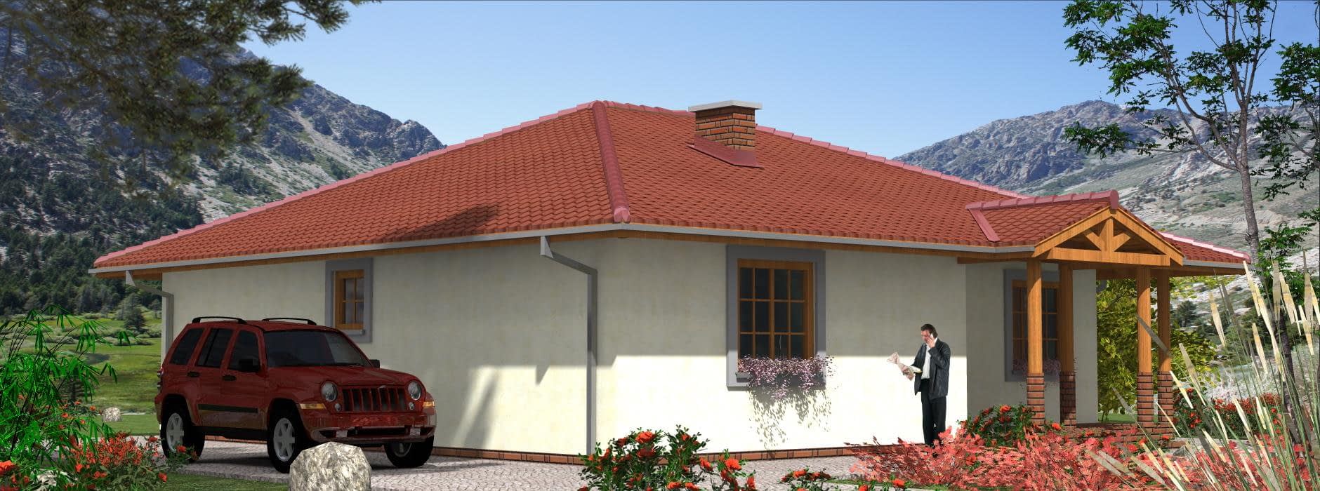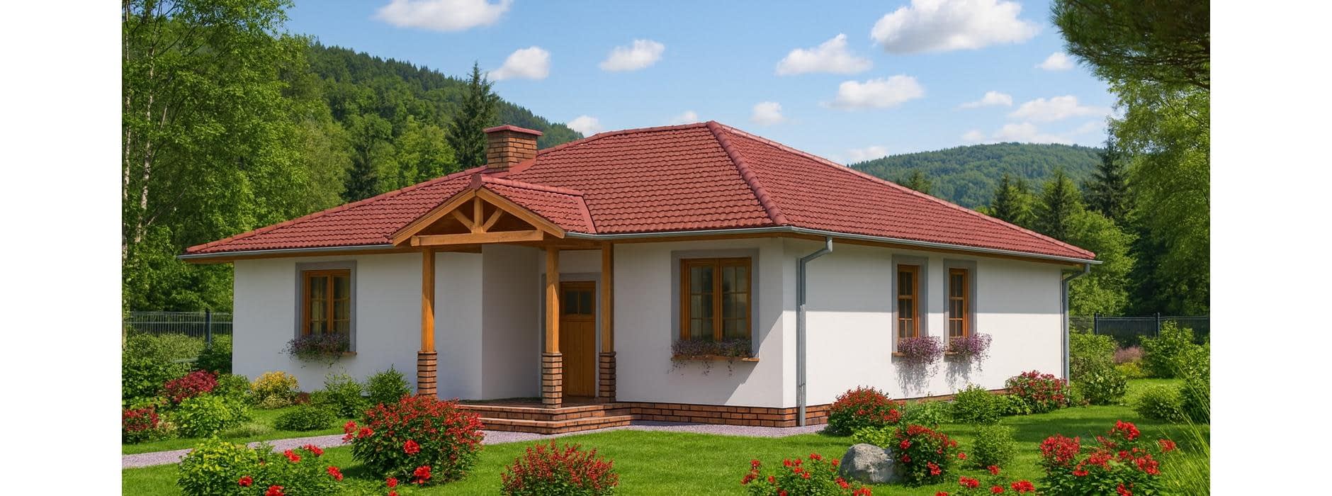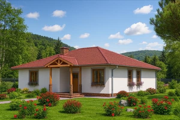 Projekt domu szkieletowego A-104 „DOM POZIOMKOWA” – funkcjonalny i energooszczędny dom parterowy A-104 „DOM POZIOMKOWA” w technologii szkieletowej to projekt małego, ale niezwykle funkcjonalnego domu jednorodzinnego. Dzięki lekkiej konstrukcji i nowoczesnym rozwiązaniom architektonicznym zapewnia szybki czas budowy, energooszczędność oraz komfort mieszkania dla całej rodziny. Architektura domu szkieletowego prosty rzut w kształcie litery L, dach wielospadowy nadający elegancji i tradycyjnego charakteru, elewacja z możliwością wykończenia drewnem, tynkiem lub panelami, przestronny taras, który powiększa strefę dzienną i sprzyja relaksowi. Praktyczny układ funkcjonalny Strefa dzienna salon z częścią wypoczynkową i bezpośrednim wyjściem na taras, jadalnia z panoramicznymi przeszkleniami i widokiem na ogród, kuchnia z dużą spiżarnią, zapewniającą wygodne przechowywanie zapasów. Strefa prywatna trzy sypialnie, idealne dla rodziny 2+2, przestrzeń na pojemne szafy i garderoby, komfortowa łazienka z wanną, prysznicem i zestawem umywalek, dodatkowe WC dla gości i domowników. Zalety domu szkieletowego A-104 „DOM POZIOMKOWA” szybki czas budowy i ekonomiczna realizacja, energooszczędna konstrukcja zapewniająca niskie koszty użytkowania, funkcjonalny układ z wyraźnym podziałem na strefę dzienną i nocną, taras wkomponowany w bryłę, sprzyjający wypoczynkowi na świeżym powietrzu. Podsumowanie Dom szkieletowy A-104 „DOM POZIOMKOWA” to propozycja dla inwestorów szukających energooszczędnego, funkcjonalnego i ekonomicznego domu parterowego. To projekt, który łączy tradycyjny styl z nowoczesną technologią i zapewnia wygodę codziennego życia.Rzuty