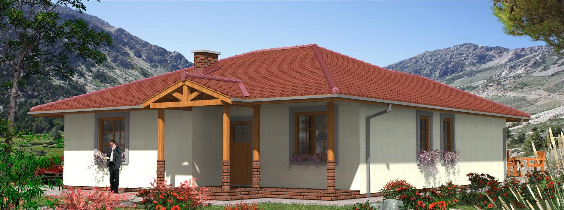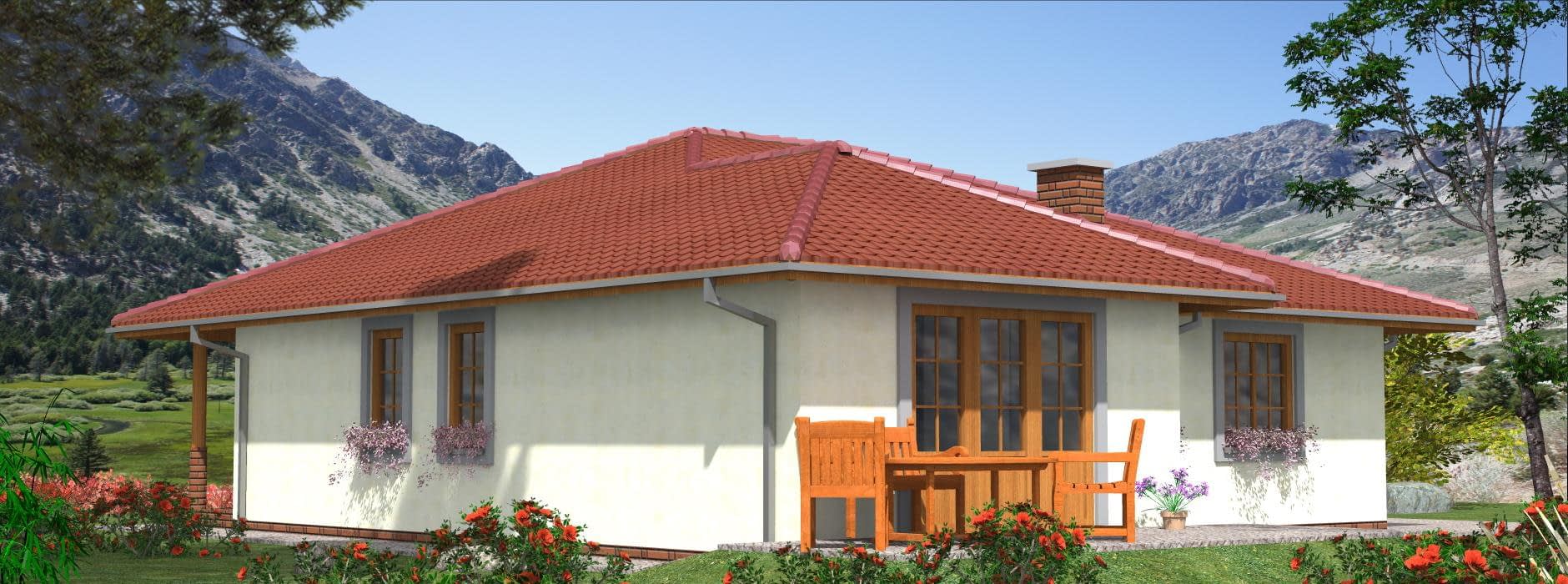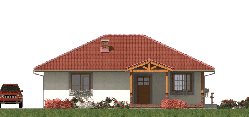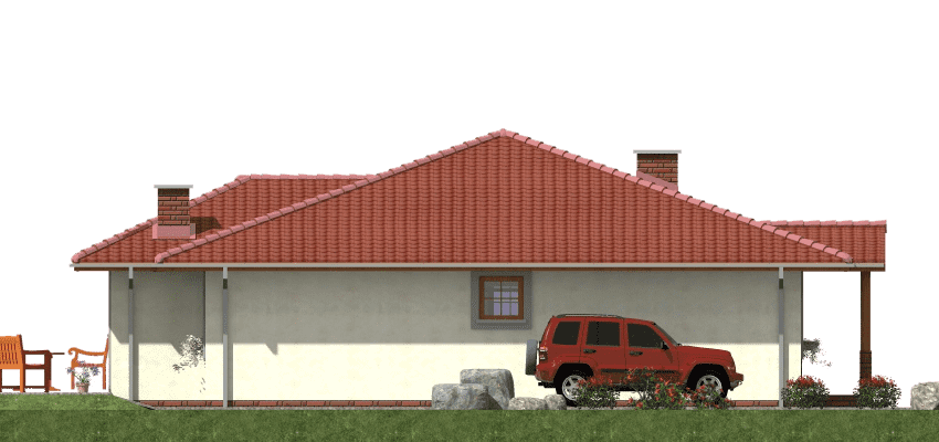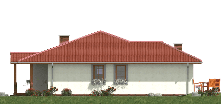 Projekt domu szkieletowego A-104 „DOM POZIOMKOWA” – funkcjonalny i energooszczędny dom parterowy A-104 „DOM POZIOMKOWA” w technologii szkieletowej to projekt małego, ale niezwykle funkcjonalnego domu jednorodzinnego. Dzięki lekkiej konstrukcji i nowoczesnym rozwiązaniom architektonicznym zapewnia szybki czas budowy, energooszczędność oraz komfort mieszkania dla całej rodziny. Architektura domu szkieletowego prosty rzut w kształcie litery L, dach wielospadowy nadający elegancji i tradycyjnego charakteru, elewacja z możliwością wykończenia drewnem, tynkiem lub panelami, przestronny taras, który powiększa strefę dzienną i sprzyja relaksowi. Praktyczny układ funkcjonalny Strefa dzienna salon z częścią wypoczynkową i bezpośrednim wyjściem na taras, jadalnia z panoramicznymi przeszkleniami i widokiem na ogród, kuchnia z dużą spiżarnią, zapewniającą wygodne przechowywanie zapasów. Strefa prywatna trzy sypialnie, idealne dla rodziny 2+2, przestrzeń na pojemne szafy i garderoby, komfortowa łazienka z wanną, prysznicem i zestawem umywalek, dodatkowe WC dla gości i domowników. Zalety domu szkieletowego A-104 „DOM POZIOMKOWA” szybki czas budowy i ekonomiczna realizacja, energooszczędna konstrukcja zapewniająca niskie koszty użytkowania, funkcjonalny układ z wyraźnym podziałem na strefę dzienną i nocną, taras wkomponowany w bryłę, sprzyjający wypoczynkowi na świeżym powietrzu. Podsumowanie Dom szkieletowy A-104 „DOM POZIOMKOWA” to propozycja dla inwestorów szukających energooszczędnego, funkcjonalnego i ekonomicznego domu parterowego. To projekt, który łączy tradycyjny styl z nowoczesną technologią i zapewnia wygodę codziennego życia.Rzuty