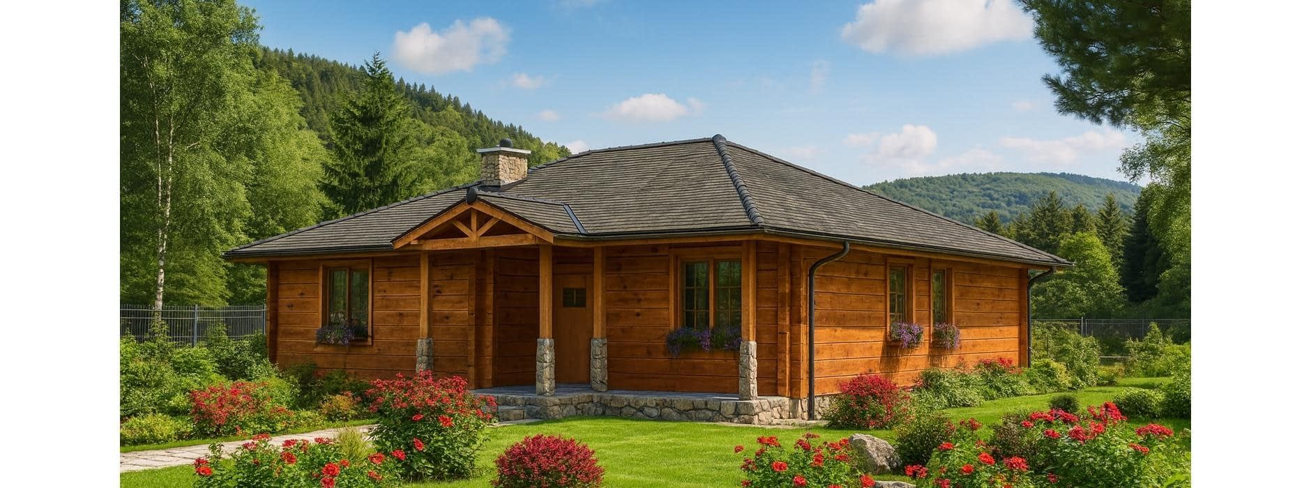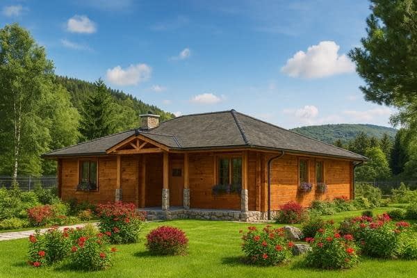 Projekt domu z bali A-104 „DOM POZIOMKOWA” – tradycyjny parterowy dom w kształcie litery L A-104 „DOM POZIOMKOWA” w technologii z bali to projekt niewielkiego domu parterowego, który zachwyca prostotą i funkcjonalnością. Dzięki naturalnym materiałom oraz tradycyjnej stylistyce łączy w sobie przytulny klimat i nowoczesne rozwiązania użytkowe. Architektura domu z bali bryła w kształcie litery L, dach wielospadowy podkreślający tradycyjny charakter, elewacja z naturalnego drewna, która nadaje budynkowi elegancji, zadaszony taras – idealne miejsce na odpoczynek na świeżym powietrzu. Układ funkcjonalny wnętrza Strefa dzienna przestronny salon sprzyjający rodzinnym spotkaniom, jadalnia z widokiem na ogród, funkcjonalna kuchnia z dużą spiżarnią, pozwalającą na przechowywanie zapasów. Strefa nocna trzy ustawne i dobrze doświetlone sypialnie, pojemne szafy w każdej sypialni, wygodna łazienka z wanną, prysznicem i zestawem umywalek, dodatkowa toaleta zwiększająca komfort użytkowania. Atuty domu z bali A-104 „DOM POZIOMKOWA” naturalny mikroklimat sprzyjający zdrowiu mieszkańców, energooszczędność dzięki właściwościom drewna, funkcjonalny układ pomieszczeń z wyraźnym podziałem na strefy, prosta bryła zapewniająca ekonomiczną budowę i eksploatację. Podsumowanie Dom z bali A-104 „DOM POZIOMKOWA” to projekt dla osób, które marzą o kameralnym, funkcjonalnym i zdrowym domu parterowym. To połączenie stylu tradycyjnego z ekologicznymi materiałami i wygodą użytkowania.Rzuty