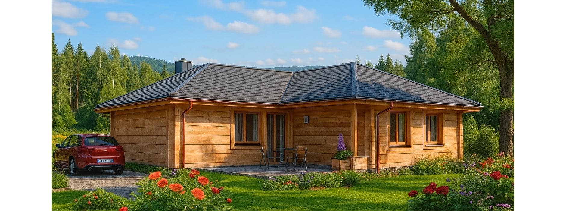 Projekt domu z bali A-106 „DOM BROWARNA” – tradycyjny dom parterowy w kształcie litery L. A-106 „DOM BROWARNA” w technologii z bali to projekt małego domu parterowego, który łączy prostotę tradycyjnej architektury z wyjątkowym klimatem naturalnego drewna. Dzięki bryle w kształcie litery L i wielospadowemu dachowi budynek doskonale wpisuje się w działki z wejściem od zachodu. Architektura i styl domu z bali: minimalistyczna, ale elegancka bryła, dach wielospadowy nadający całości tradycyjnego charakteru, naturalna elewacja z bali, która podkreśla ekologiczny i przytulny klimat domu, taras osłonięty od strony ogrodu, sprzyjający wspólnemu wypoczynkowi. Układ pomieszczeń – wygoda i praktyczność: Strefa dzienna: przestronny salon z częścią wypoczynkową, jadalnia z dużymi przeszkleniami i widokiem na ogród, kuchnia połączona ze spiżarnią – idealna do przechowywania zapasów. Strefa nocna: trzy komfortowe i dobrze doświetlone sypialnie, w każdej miejsce na pojemne szafy ubraniowe, duża łazienka z wanną, prysznicem i zestawem umywalek, dodatkowa toaleta dla gości. Atuty domu z bali A-106 „DOM BROWARNA”: naturalny mikroklimat i doskonała izolacja cieplna, prosty, ekonomiczny w budowie układ, wygodny podział na część dzienną i nocną, duża spiżarnia w kuchni, która zwiększa komfort użytkowania, taras jako dodatkowa przestrzeń rekreacyjna. Dom z bali A-106 „DOM BROWARNA” to propozycja dla rodzin, które szukają przytulnego i naturalnego domu parterowego z funkcjonalnym układem. Dzięki tradycyjnemu stylowi i zdrowemu mikroklimatowi drewna projekt sprawdzi się zarówno jako dom całoroczny, jak i letniskowy.Rzuty