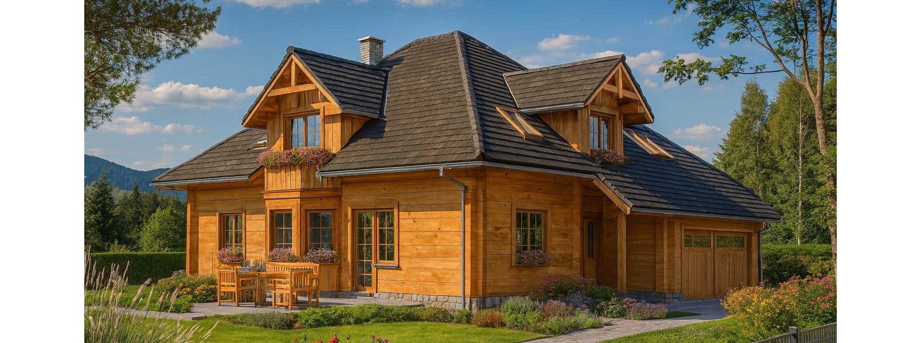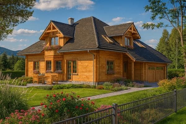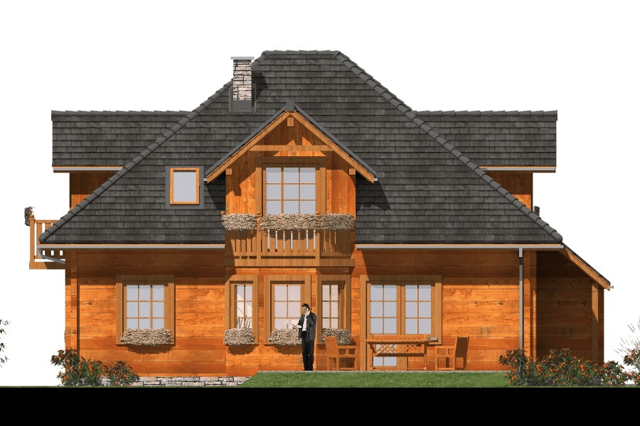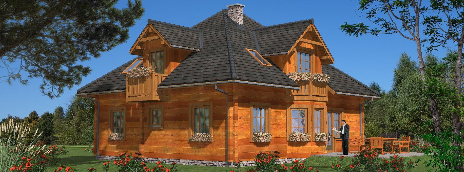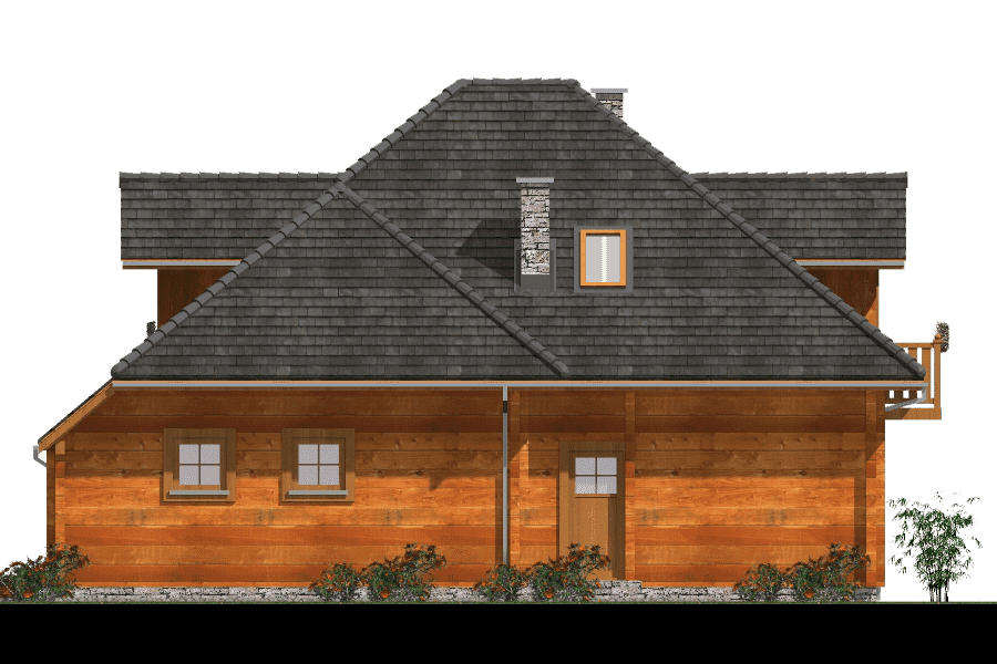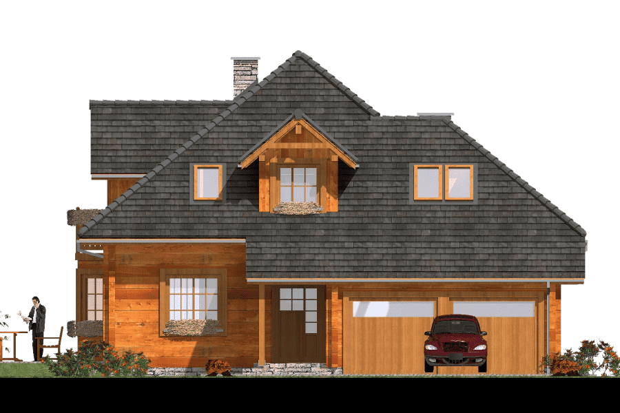 Projekt domu z bali A-107 „DOM KRUCZA” – przestronny dom dla dużej rodziny. A-107 „DOM KRUCZA” w technologii z bali to propozycja dla inwestorów, którzy marzą o dużym, wygodnym i przytulnym domu dla całej rodziny. Parterowy budynek z poddaszem użytkowym i garażem podwójnym łączy tradycyjną estetykę naturalnego drewna z nowoczesnym podejściem do funkcjonalności. Architektura domu z bali: Projekt oparto na klasycznej bryle przykrytej dachem dwuspadowym. Elewacja z naturalnych bali nadaje domowi unikalnego charakteru, a we wnętrzu zapewnia zdrowy mikroklimat. Duże przeszklenia w części dziennej otwierają dom na ogród, a kominek w salonie podkreśla przytulny klimat. Układ pomieszczeń – wygoda i funkcjonalność: Parter – komfortowa strefa dzienna: przestronny salon z kominkiem i aneksem jadalnym, osobna kuchnia połączona z salonem poprzez jadalnię, sypialnia rodziców z własną łazienką, osobna toaleta dla gości, kotłownia z możliwością montażu pieca na paliwo stałe, garaż podwójny z przejściem do wnętrza domu. Poddasze – strefa nocna: cztery duże sypialnie, jedna z garderobą, dwie w pełni wyposażone łazienki, przestronny hall z możliwością aranżacji kącika rekreacyjnego. Atuty domu z bali A-107 „DOM KRUCZA”: naturalny mikroklimat wnętrza sprzyjający zdrowiu, ciepło i energooszczędność dzięki właściwościom drewna, przestronny układ dla dużej rodziny – aż 6 pokoi, garaż podwójny i kotłownia z możliwością pieca na paliwo stałe. Dom z bali A-107 „DOM KRUCZA” to idealne rozwiązanie dla osób ceniących naturalność, tradycję i przestrzeń. Ten projekt to dom, który nie tylko pomieści dużą rodzinę, ale także zapewni jej zdrowe i komfortowe warunki życia.Rzuty