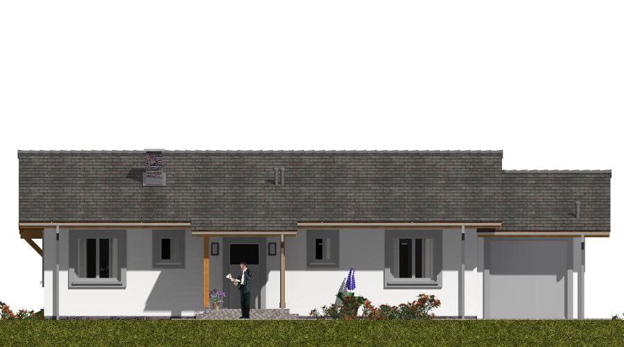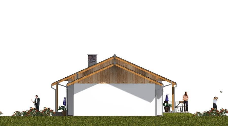 Projekt domu szkieletowego A-108 „DOM CHMIELOWA” – nowoczesny i energooszczędny dom parterowy. A-108 „DOM CHMIELOWA” w technologii szkieletowej to funkcjonalny, ekonomiczny i szybki w budowie dom jednorodzinny, który idealnie sprawdzi się na niewielkich działkach. Prosta bryła, tradycyjny dach i dobrze zaprojektowane wnętrze czynią ten projekt atrakcyjnym dla rodzin szukających komfortu w nowoczesnym wydaniu. Architektura domu szkieletowego: prostokątny rzut gwarantujący ekonomię budowy, czysta, minimalistyczna forma bryły, elegancka elewacja z połączeniem drewna i tynku, zadaszona strefa tarasowa – idealna do wspólnego wypoczynku. Projekt dedykowany jest działkom z wejściem od północy, co umożliwia maksymalne wykorzystanie naturalnego światła w części dziennej. Funkcjonalny układ wnętrza: Strefa dzienna: otwarty salon z jadalnią i kominkiem, kuchnia z bezpośrednim dostępem do przestronnej spiżarni, duże przeszklenia z widokiem na ogród. Strefa prywatna: trzy sypialnie zaprojektowane z myślą o komforcie mieszkańców, duża łazienka z wanną, prysznicem i podwójną umywalką, oddzielna toaleta jako praktyczne rozwiązanie dla gości i domowników. Zalety domu szkieletowego A-108: szybka realizacja budowy dzięki technologii szkieletowej, energooszczędność i niskie koszty ogrzewania, funkcjonalny podział na strefę dzienną i nocną, zadaszony taras sprzyjający integracji rodziny na świeżym powietrzu. Dom szkieletowy A-108 „DOM CHMIELOWA” to idealne rozwiązanie dla osób, które chcą postawić na nowoczesny, ekonomiczny i wygodny dom parterowy. Przemyślany układ pomieszczeń, energooszczędna konstrukcja i atrakcyjna architektura sprawiają, że jest to projekt dla wymagających inwestorów.Rzuty