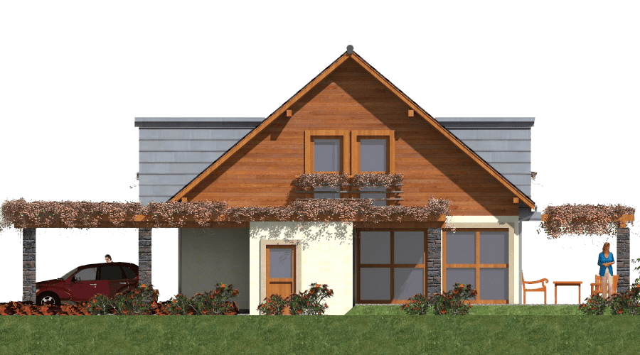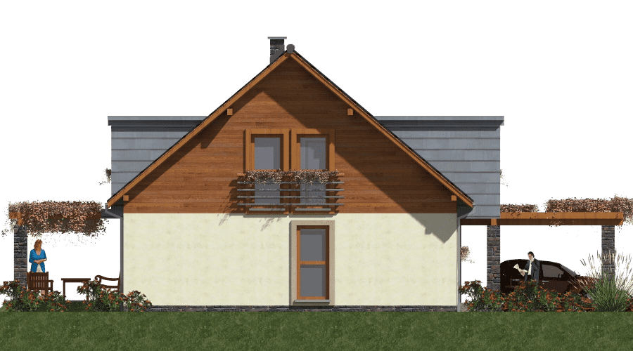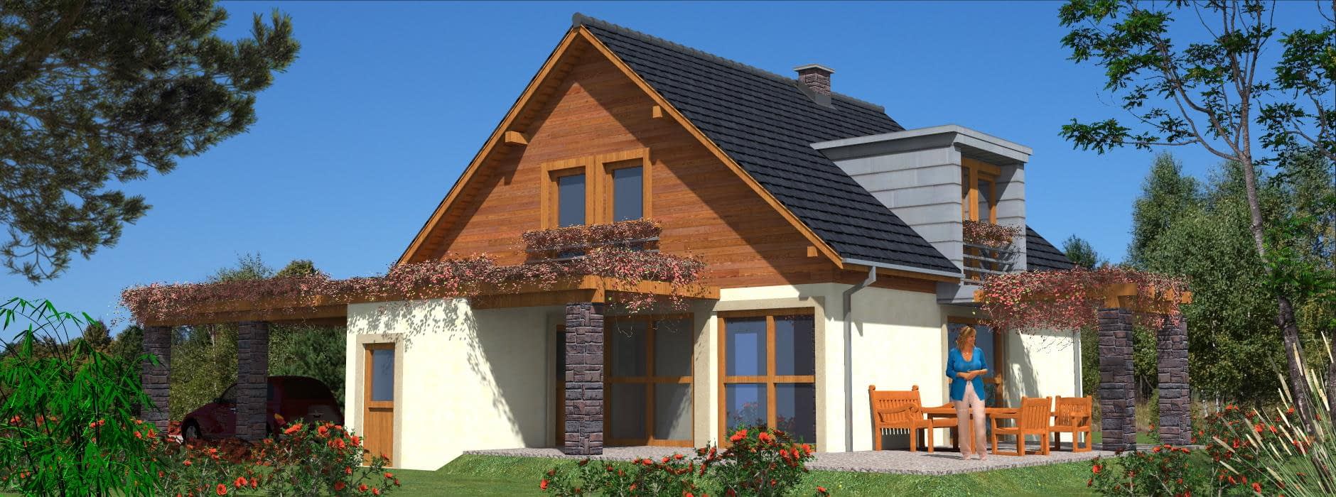 Projekt domu szkieletowego A-109 „DOM WIĄZOWA” – energooszczędność i nowoczesny design A-109 „DOM WIĄZOWA” w technologii szkieletowej to nowoczesny dom parterowy z poddaszem mieszkalnym, który został zaprojektowany tak, aby łączyć funkcjonalność, energooszczędność i atrakcyjny wygląd. Architektura – minimalistyczna elegancja: Dom posiada zwartą bryłę z dachem dwuspadowym, a jego elewacje to designerskie połączenie drewna i blachy na rąbek. Pergole wokół budynku pełnią nie tylko funkcję dekoracyjną – zapewniają cień, a jedna z nich została zaprojektowana jako wiata garażowa. Układ pomieszczeń w domu szkieletowym: Parter – strefa dzienna: salon połączony z jadalnią i kuchnią w otwartym układzie, centralny kominek jako element wizualny i źródło ciepła, wygodne wyjście na taras i pergolę, praktyczne zaplecze gospodarcze. Poddasze – prywatna przestrzeń domowników: trzy sypialnie, łazienka z pełnym wyposażeniem, przestronny hall z garderobą. Zalety domu szkieletowego A-109 „DOM WIĄZOWA”: szybki czas budowy i niższe koszty inwestycji, nowoczesna architektura z elementami drewnianymi i blachą na rąbek, energooszczędność – dom idealny na cały rok, pergole pełniące rolę tarasu i wiaty garażowej. Dom szkieletowy A-109 „DOM WIĄZOWA” to doskonały wybór dla inwestorów szukających nowoczesnego, energooszczędnego i funkcjonalnego domu rodzinnego. To projekt, który łączy prostotę, wygodę i elegancję w nowoczesnym stylu.Rzuty