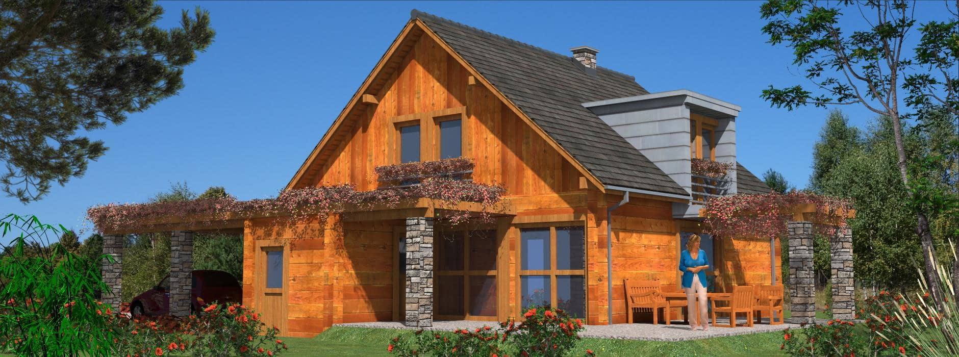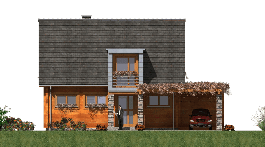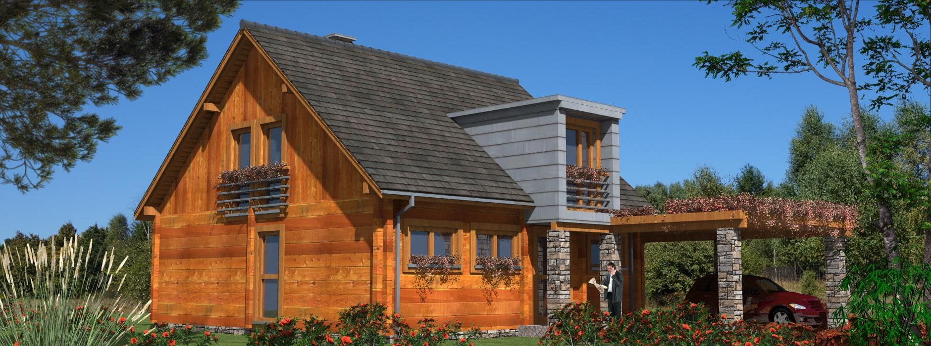 Projekt domu z bali A-109 „DOM WIĄZOWA” – nowoczesny dom z naturalnym klimatem A-109 „DOM WIĄZOWA” w technologii z bali to projekt domu jednorodzinnego, który łączy nowoczesną architekturę z tradycją drewnianego budownictwa. To budynek parterowy z poddaszem mieszkalnym, zaprojektowany z myślą o rodzinach ceniących wygodę, ekologię i wyjątkowy klimat naturalnego drewna. Architektura i elewacja – drewno i nowoczesność. Budynek zaprojektowano na planie prostokąta, z eleganckim dachem dwuspadowym. Elewacje to efektowne połączenie bali drewnianych i nowoczesnej blachy na rąbek, które nadają bryle unikatowego charakteru. Pergole wokół domu dodają mu nowoczesności, a jednocześnie tworzą przyjemną przestrzeń wypoczynkową i praktyczną wiatę garażową. Układ funkcjonalny domu z bali: Parter – otwarta przestrzeń dzienna: przestronny salon z centralnie umieszczonym kominkiem, jadalnia i otwarta kuchnia, miejsce do wspólnego spędzania czasu i relaksu, pergola jako taras rekreacyjny i wiata na samochód. Poddasze – strefa nocna: trzy wygodne sypialnie, funkcjonalna łazienka, garderoba i hall komunikacyjny. Atuty domu z bali A-109 „DOM WIĄZOWA”: naturalny mikroklimat sprzyjający zdrowiu mieszkańców, nowoczesne połączenie drewna i blachy na rąbek w elewacji, pergole jako przestrzeń rekreacyjna i praktyczna wiata garażowa, otwarta przestrzeń dzienna i trzy komfortowe sypialnie. Dom z bali A-109 „DOM WIĄZOWA” to idealny wybór dla osób, które marzą o nowoczesnym, a zarazem naturalnym domu. Drewno tworzy przyjazny mikroklimat, a elegancka forma i pergole wokół domu czynią go nie tylko funkcjonalnym, ale także wyjątkowo estetycznym.Rzuty