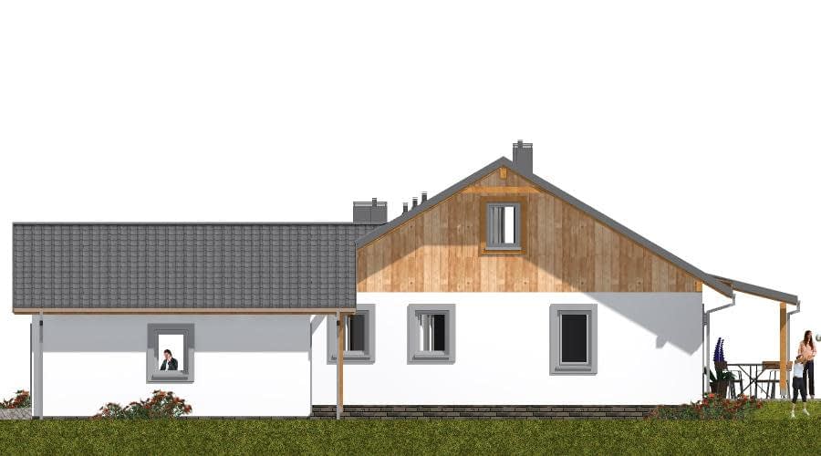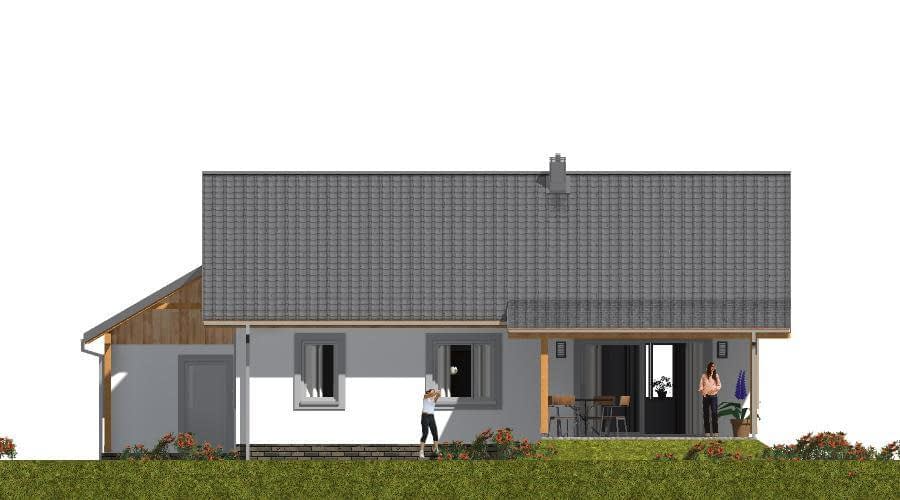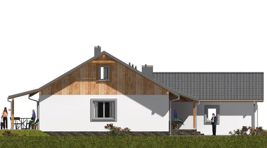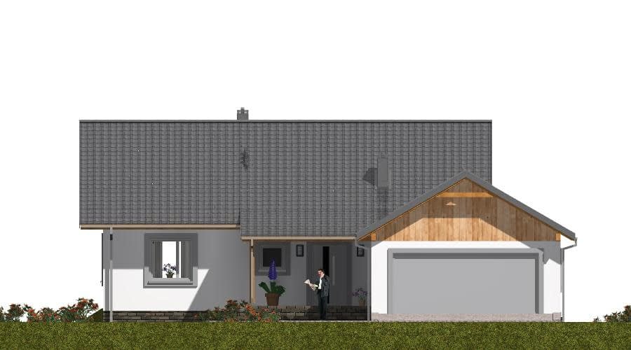 Projekt domu szkieletowego A-128 „DOM KATOWICKA” – nowoczesność, szybkość budowy i ekonomia A-128 „DOM KATOWICKA” w technologii szkieletowej to nowoczesny dom jednorodzinny parterowy, który łączy w sobie prostą bryłę, funkcjonalny układ wnętrza i wysoką energooszczędność. To propozycja dla rodzin szukających ekonomicznego, ale komfortowego rozwiązania. Architektura domu szkieletowego – prostota i elegancja Bryła budynku oparta na dwuspadowym dachu o kącie nachylenia 30° podkreśla nowoczesny, a zarazem klasyczny charakter domu. Dzięki zastosowaniu technologii szkieletowej dom można wybudować w krótkim czasie, z zachowaniem wysokich standardów izolacyjnych i trwałości. Funkcjonalny układ pomieszczeń Projekt przewiduje przemyślany rozkład stref: Strefa dzienna – przestronny salon z kominkiem i wyjściem na taras, połączony z jadalnią. Kuchnia i spiżarnia – wygodne rozwiązanie dla osób ceniących praktyczne wnętrza. Strefa prywatna – dwie sypialnie, w tym główna z garderobą. Pomieszczenia sanitarne – łazienka oraz osobne WC. Pomieszczenia gospodarcze – kotłownia z piecem CO oraz przejście do garażu. Garaż – podwójny, zapewniający komfort codziennego użytkowania. Dlaczego warto wybrać dom szkieletowy A-128? Szybka budowa – technologia szkieletowa pozwala postawić dom w kilka miesięcy. Ekonomia użytkowania – świetna izolacja termiczna i niskie koszty ogrzewania. Funkcjonalność – przestronny układ dla rodziny z dziećmi. Uniwersalność – projekt sprawdzi się na działkach miejskich i podmiejskich. Projekt domu szkieletowego A-128 „DOM KATOWICKA” to wybór dla osób, które cenią szybkość realizacji, nowoczesny styl i wygodę użytkowania. To dom parterowy z poddaszem użytkowym w technologii szkieletowej, który spełni potrzeby zarówno rodzin szukających pierwszego domu, jak i inwestorów stawiających na ekonomiczne rozwiązania.Rzuty