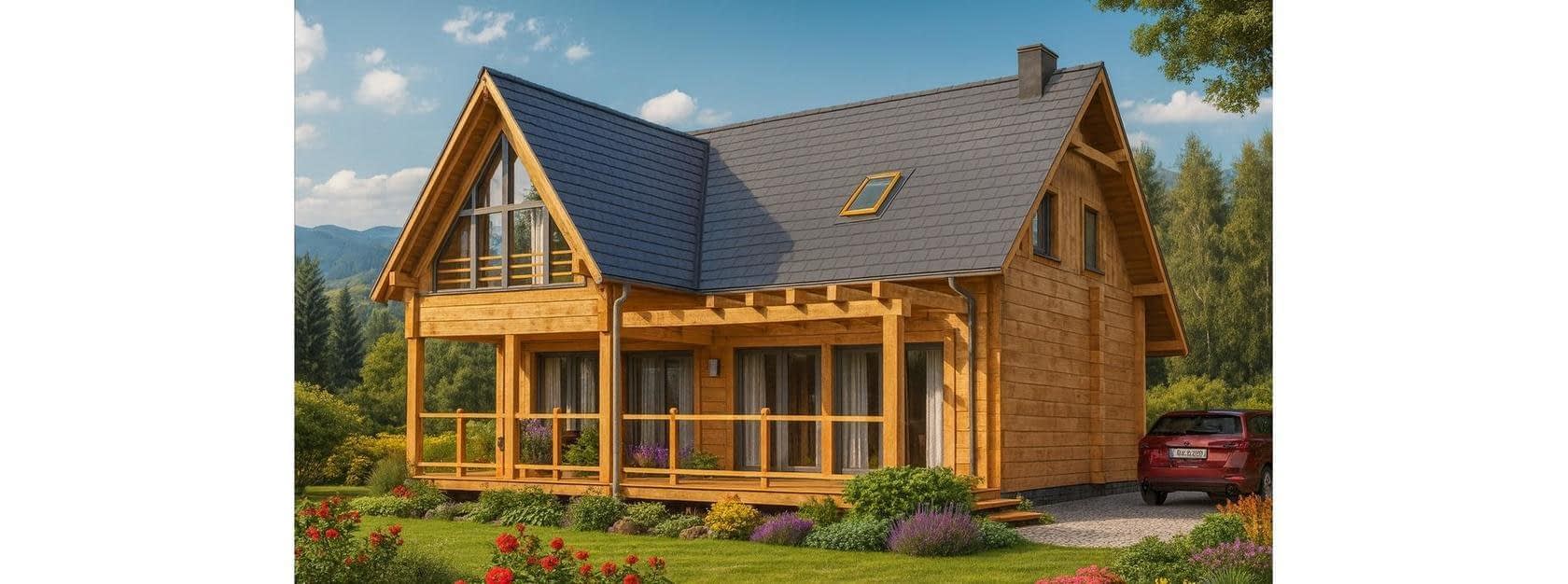 Dom parterowy z poddaszem użytkowym z bali – komfortowy, nowoczesny i ekologiczny Ten dom parterowy z poddaszem użytkowym z bali, zaprojektowany dla 4-osobowej rodziny, łączy nowoczesną architekturę z naturalnym ciepłem drewna. Wykonany w technologii bali drewnianych, gwarantuje zdrowy mikroklimat oraz wyjątkowy design. Budynek jest częściowo podpiwniczony, co zwiększa funkcjonalność i pozwala na dodatkowe przechowywanie. To idealny wybór dla rodzin, które cenią komfort, ekologiczne materiały i nowoczesny styl życia. Minimalistyczna bryła i nowoczesny design z drewna Projekt domu z bali charakteryzuje się prostokątnym rzutem, dwuspadowym dachem z dużą lukarną oraz minimalistyczną, elegancką bryłą. Nowoczesny dom drewniany z tarasem optymalnie wykorzystuje przestrzeń, co jest szczególnie ważne przy mniejszych działkach. Duże przeszklenia zapewniają jasne, pełne światła wnętrza, a naturalne drewno nadaje im przytulny i ciepły charakter. Funkcjonalny układ wnętrza Parter Salon połączony z otwartą kuchnią i jadalnią – idealne miejsce dla całej rodziny, Łazienka na parterze, Zejście do piwnicy z dodatkowymi pomieszczeniami, Otwarta przestrzeń gwarantująca swobodę i komfort codziennego życia. Poddasze Trzy sypialnie, w tym jedna z panoramicznym przeszkleniem, Łazienka, Dodatkowe miejsce na garderobę lub przechowywanie. Dom parterowy z poddaszem wykonany z bali zapewnia prywatność i wygodę dla wszystkich domowników. Duży, częściowo zadaszony taras Projekt przewiduje przestronny taras w domu z bali, częściowo zadaszony, co umożliwia relaks na świeżym powietrzu przez cały rok. Taras jest funkcjonalnym przedłużeniem strefy dziennej i świetnie sprawdza się podczas spotkań z rodziną i przyjaciółmi. Zalety domu z bali Naturalny mikroklimat wewnątrz dzięki drewnu, Funkcjonalny i ergonomiczny układ wnętrz, Niskie koszty budowy i eksploatacji, Możliwość użytkowania jako dom całoroczny lub letniskowy, Nowoczesny design połączony z tradycyjnym materiałem – drewnem. Podsumowanie Ten dom z bali parterowy z poddaszem użytkowym to propozycja dla osób, które marzą o nowoczesnym, komfortowym i przytulnym domu wykonanym z naturalnych materiałów. To doskonały wybór dla rodzin 4-osobowych, które cenią projekty domów z bali łączące ekologię, funkcjonalność i wyjątkową estetykę. Duży taras, przestronne wnętrza i energooszczędne rozwiązania sprawiają, że to inwestycja w wygodę na lata.Rzuty