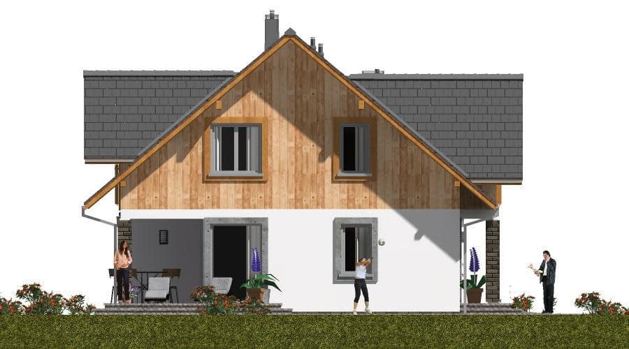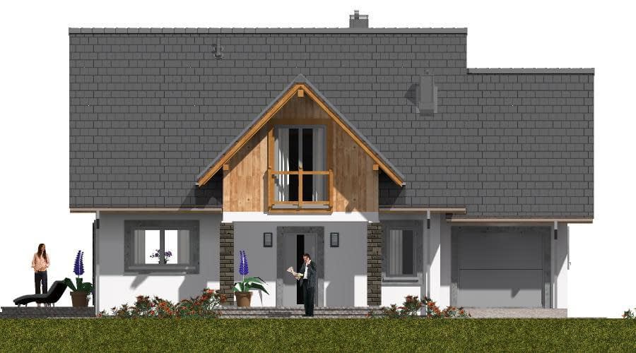 Nowoczesny dom parterowy z poddaszem w technologii szkieletowej Projekt tego domu szkieletowego z użytkowym poddaszem został stworzony z myślą o rodzinach 5-6-osobowych, które chcą mieszkać w funkcjonalnym i nowoczesnym domu szkieletowym. Kompaktowa bryła domu i inteligentny układ wnętrz sprawiają, że koszty budowy i eksploatacji są niewielkie. Minimalistyczna forma i duże przeszklenia Dom szkieletowy charakteryzuje się prostokątnym rzutem i dwuspadowym dachem, minimalistyczną formą oraz nowoczesnym wykończeniem elewacji. Duże okna zapewniają dużo naturalnego światła, dzięki czemu wnętrza są jasne i przyjazne, a mieszkańcy mają bezpośredni kontakt z otoczeniem. Przemyślany układ funkcjonalny Parter: przestronny salon z kuchnią i jadalnią, łazienka, spiżarka, garaż oraz pomieszczenie gospodarcze. To idealne miejsce do wspólnego spędzania czasu z rodziną. Poddasze: cztery sypialnie, łazienka i trzy garderoby zapewniają komfortowe warunki dla wszystkich domowników. Funkcjonalny taras i przestrzeń na świeżym powietrzu Dom szkieletowy został zaprojektowany z tarasem w kształcie litery L, który okala budynek z dwóch stron. To rozwiązanie zwiększa funkcjonalność przestrzeni zewnętrznej i pozwala korzystać z wypoczynku na świeżym powietrzu w komfortowych warunkach. Zalety domu szkieletowego szybka i ekonomiczna budowa dzięki prefabrykowanym elementom, doskonała izolacja termiczna i niskie koszty eksploatacji, funkcjonalny układ wnętrz bez marnowania przestrzeni, nowoczesny i estetyczny design z przemyślanym rozplanowaniem pomieszczeń. Ten dom parterowy z poddaszem w technologii szkieletowej to propozycja dla rodzin, które szukają nowoczesnego, funkcjonalnego i energooszczędnego domu, gwarantującego komfort i przyjemną atmosferę mieszkania.Rzuty