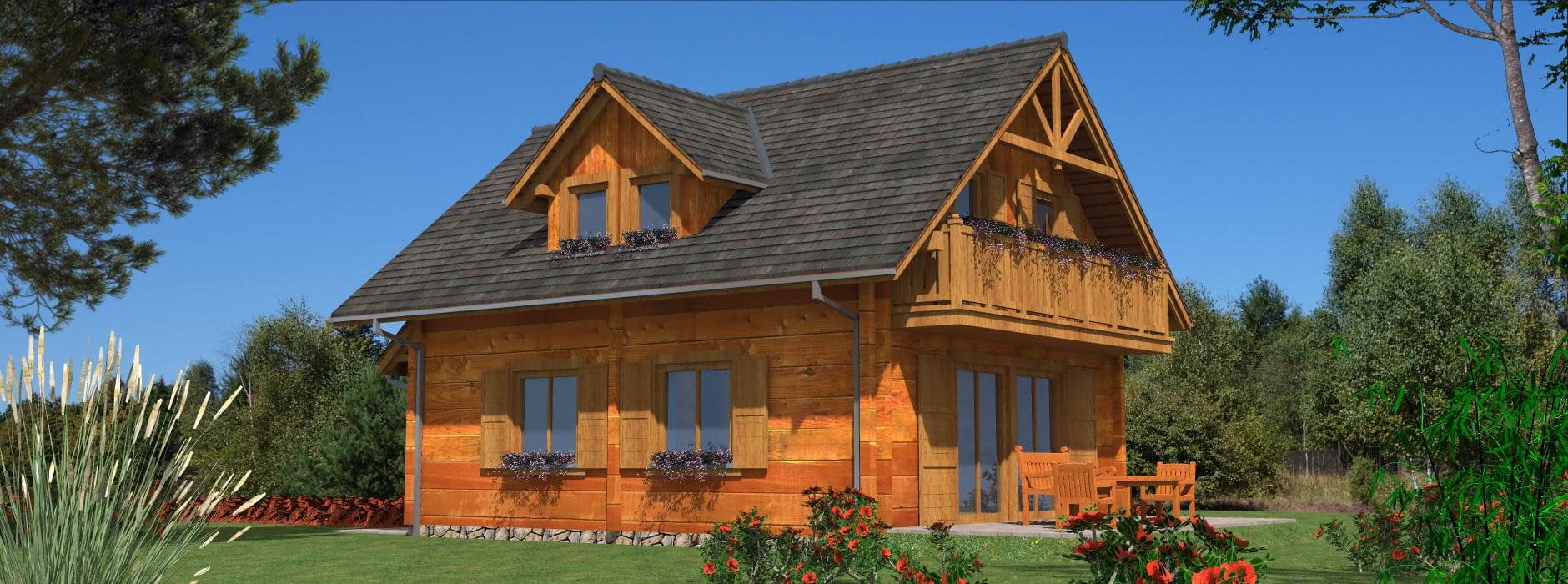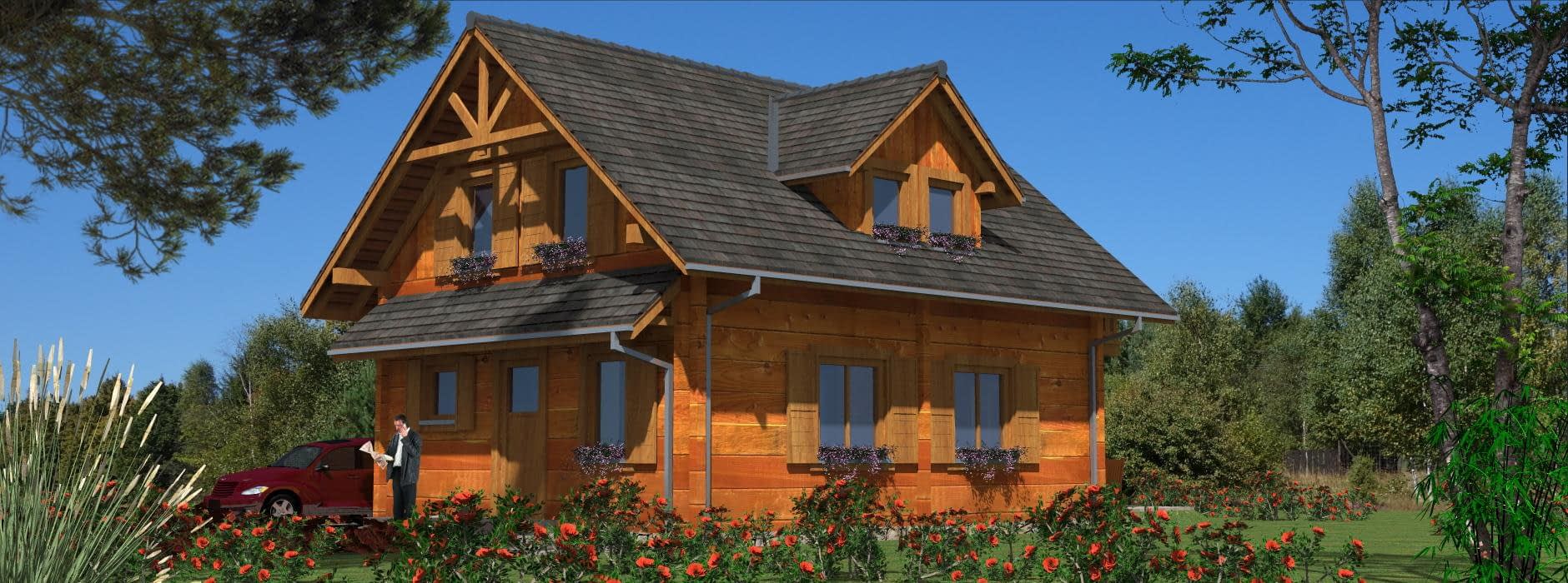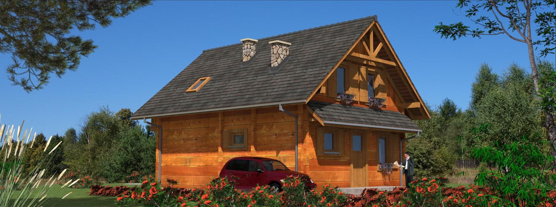 Funkcjonalny dom parterowy z poddaszem w technologii z bali – idealny dla 4-osobowej rodziny Ten projekt domu parterowego z użytkowym poddaszem z bali łączy nowoczesny design z naturalnym ciepłem drewna. To idealne rozwiązanie dla rodzin szukających funkcjonalnego domu parterowego z poddaszem, który jest jednocześnie przytulny i ekonomiczny w budowie. Nowoczesna architektura i ekonomiczne rozwiązania Dom z bali o powierzchni użytkowej nieco ponad 100 m² posiada minimalistyczną bryłę i dwuspadowy dach, co pozwala na niskie koszty budowy i utrzymania. Rzut prostokąta umożliwia optymalne wykorzystanie przestrzeni wewnętrznej, a duże przeszklenia wprowadzają naturalne światło do każdego pomieszczenia, umożliwiając podziwianie otaczającego krajobrazu. Funkcjonalny układ wnętrza Parter: przestronny salon połączony z kuchnią i jadalnią – idealne miejsce do wspólnego spędzania czasu z rodziną; dodatkowo łazienka i pomieszczenie gospodarcze pod schodami. Poddasze: trzy wygodne sypialnie i łazienka, które maksymalnie wykorzystują dostępną przestrzeń, zapewniając komfort wszystkim mieszkańcom. Zalety domu z bali zdrowy mikroklimat wewnątrz dzięki naturalnemu drewnu, doskonała izolacja termiczna i energooszczędność, szybka budowa i łatwa adaptacja wnętrz, niższe koszty budowy i eksploatacji dzięki kompaktowej powierzchni. Ten funkcjonalny dom z bali z poddaszem użytkowym to propozycja dla rodzin, które chcą mieszkać w nowoczesnym, przytulnym domu z naturalnego drewna, korzystając przy tym z ekonomicznych rozwiązań budowlanych.Rzuty
