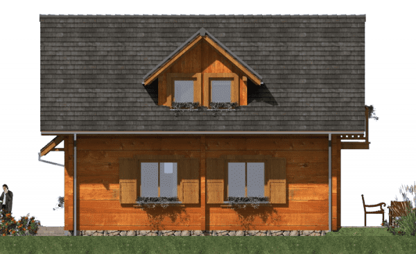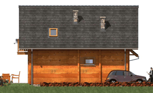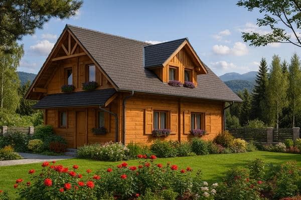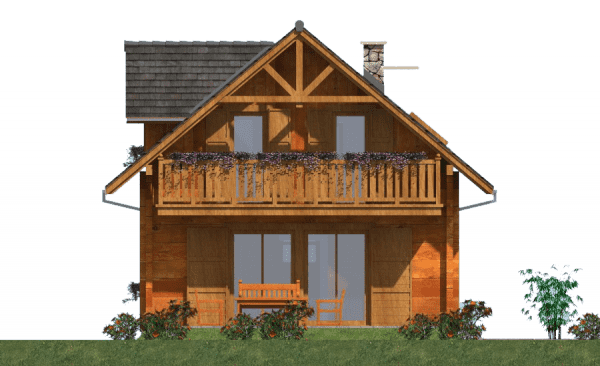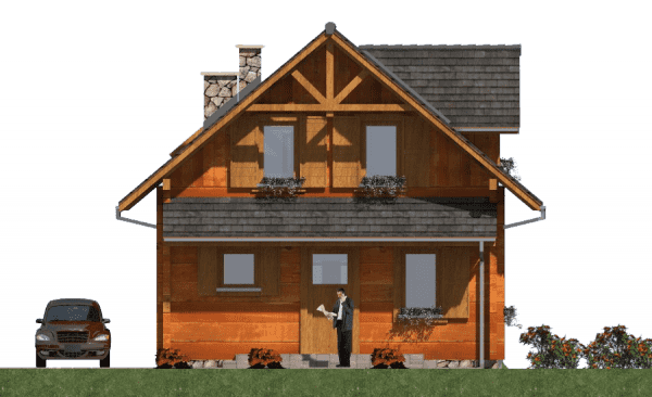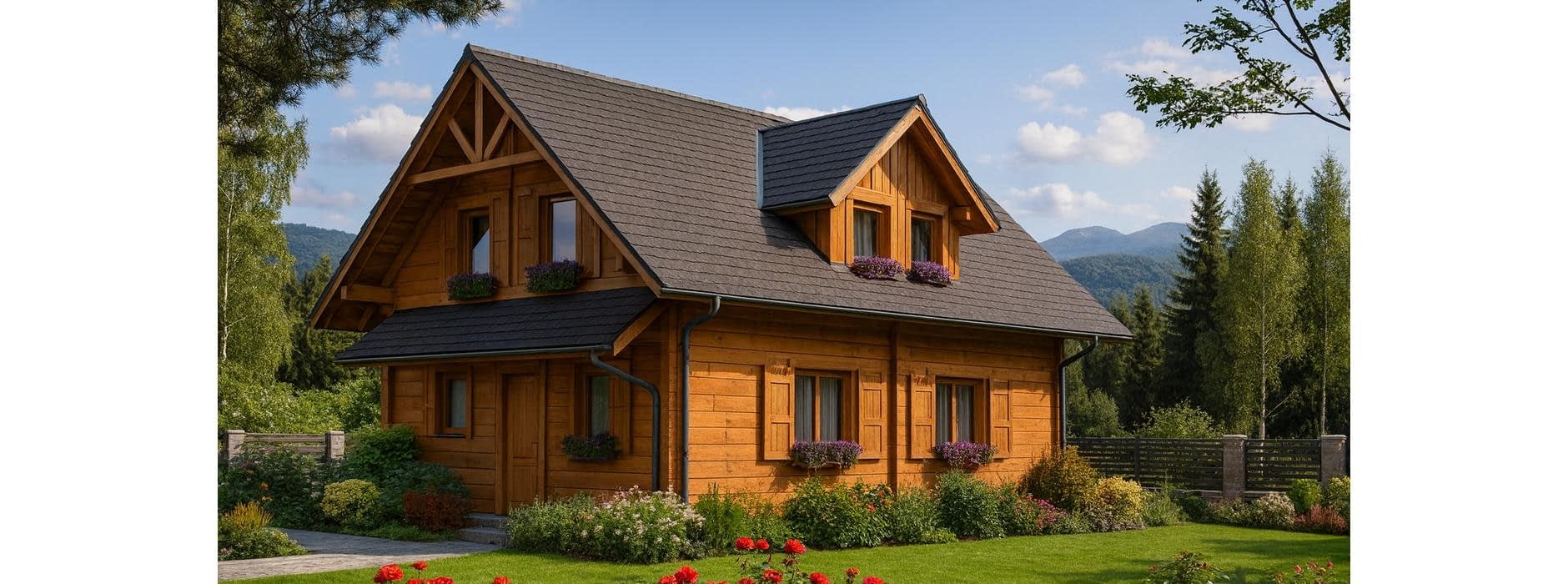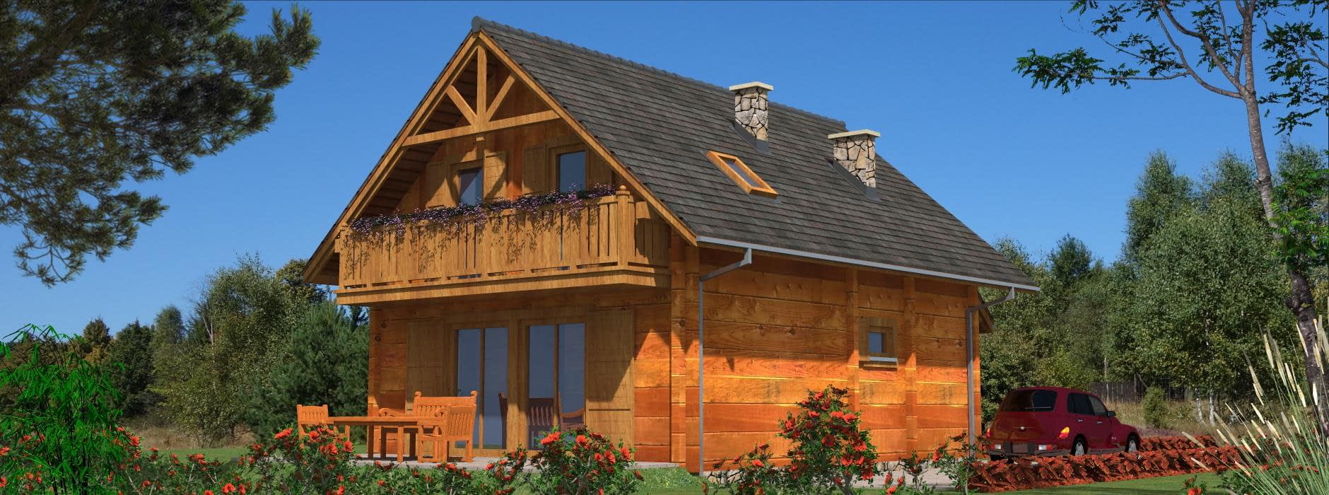 Funkcjonalny dom parterowy z poddaszem w technologii z bali – idealny dla 4-osobowej rodziny Ten projekt domu parterowego z użytkowym poddaszem z bali łączy nowoczesny design z naturalnym ciepłem drewna. To idealne rozwiązanie dla rodzin szukających funkcjonalnego domu parterowego z poddaszem, który jest jednocześnie przytulny i ekonomiczny w budowie. Nowoczesna architektura i ekonomiczne rozwiązania Dom z bali o powierzchni użytkowej nieco ponad 100 m² posiada minimalistyczną bryłę i dwuspadowy dach, co pozwala na niskie koszty budowy i utrzymania. Rzut prostokąta umożliwia optymalne wykorzystanie przestrzeni wewnętrznej, a duże przeszklenia wprowadzają naturalne światło do każdego pomieszczenia, umożliwiając podziwianie otaczającego krajobrazu. Funkcjonalny układ wnętrza Parter: przestronny salon połączony z kuchnią i jadalnią – idealne miejsce do wspólnego spędzania czasu z rodziną; dodatkowo łazienka i pomieszczenie gospodarcze pod schodami. Poddasze: trzy wygodne sypialnie i łazienka, które maksymalnie wykorzystują dostępną przestrzeń, zapewniając komfort wszystkim mieszkańcom. Zalety domu z bali zdrowy mikroklimat wewnątrz dzięki naturalnemu drewnu, doskonała izolacja termiczna i energooszczędność, szybka budowa i łatwa adaptacja wnętrz, niższe koszty budowy i eksploatacji dzięki kompaktowej powierzchni. Ten funkcjonalny dom z bali z poddaszem użytkowym to propozycja dla rodzin, które chcą mieszkać w nowoczesnym, przytulnym domu z naturalnego drewna, korzystając przy tym z ekonomicznych rozwiązań budowlanych.Rzuty