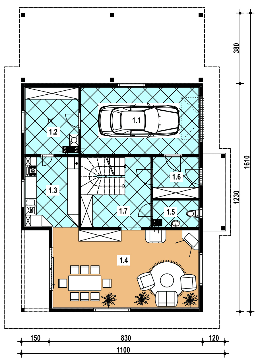 - garaż 0.00 kotłownia 10.00 kuchnia 10.80 pokój dzienny 33.00 wc 3.40 wiatrołap 5.60 komunikacja 11.900