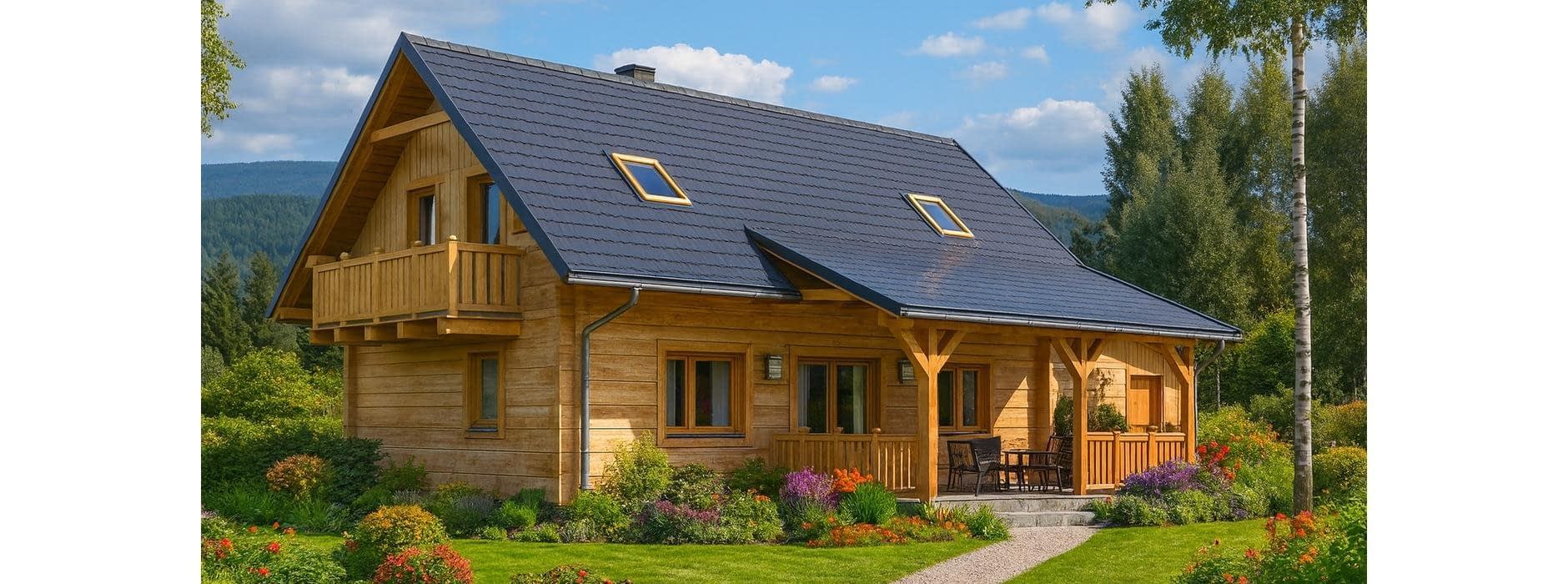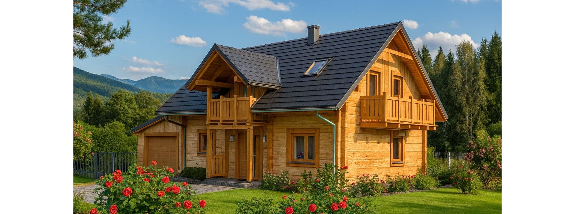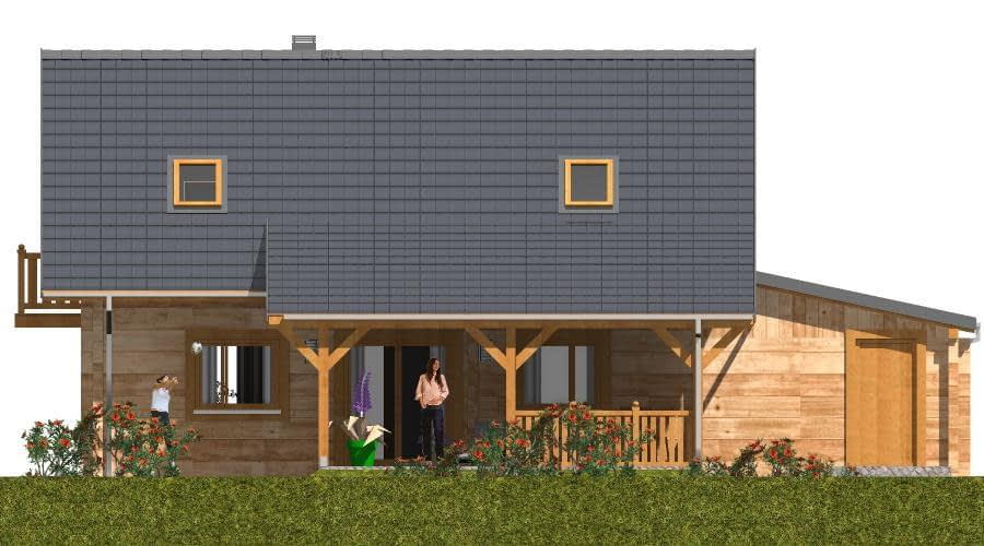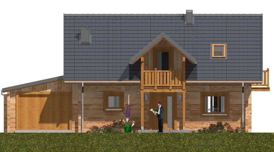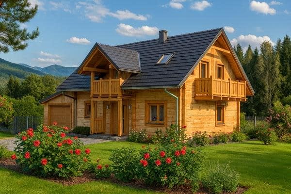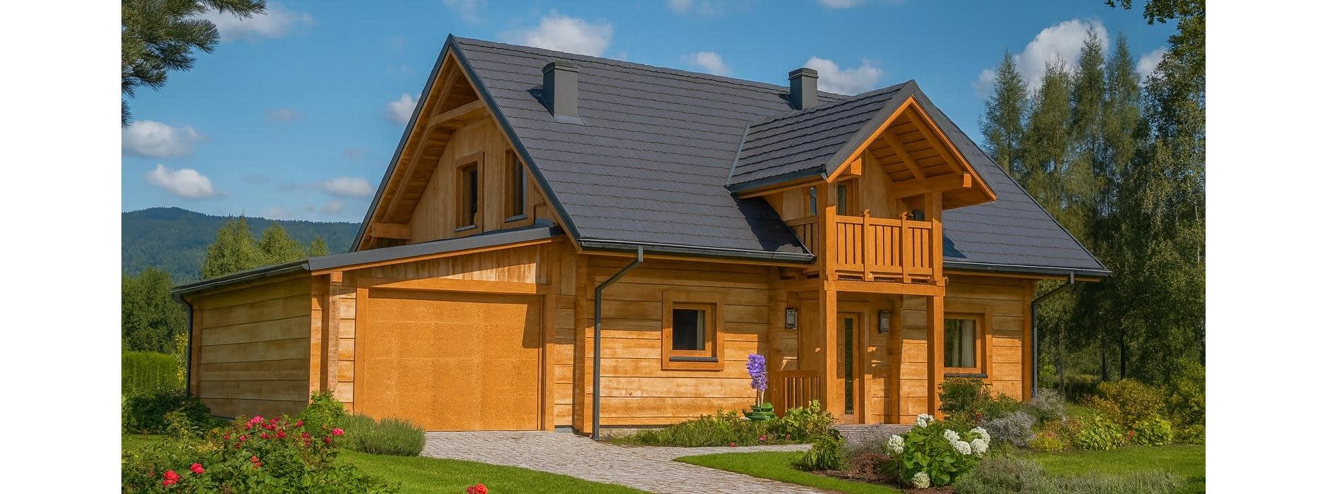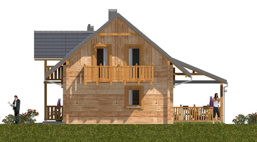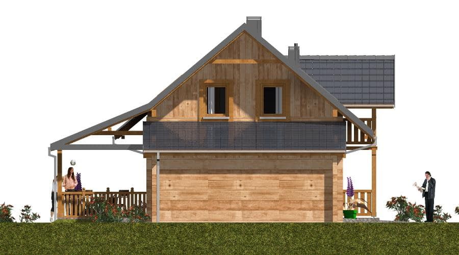Budynek został zaprojektowany jako dwuczłonowy dom z bala, który mimo swojej podzielonej bryły tworzy harmonijną i spójną całość. Mocno zaakcentowane wejście sprawia, że dom wyróżnia się na tle sąsiedniej zabudowy, nadając mu elegancki i przyjazny charakter. Funkcjonalny układ wnętrza Dom oferuje możliwość pełnego użytkowania parteru, który obejmuje: Sypialnię i łazienkę, co pozwala na wygodne korzystanie z domu nawet bez poddasza, Część dzienną z pokojem dziennym oraz kuchnią z aneksem jadalnym, Kominek w pokoju dziennym, który zapewnia przyjemne ciepło w chłodne dni, Schody na poddasze zaczynające się w pokoju dziennym, umieszczone z boku, łączące strefę dzienną i nocną. Poddasze i dodatkowe pomieszczenia Poddasze może być użytkowane okresowo, Sypialnie na poddaszu mogą pełnić funkcję pomieszczeń funkcyjnych, np. gabinetu, pokoju gościnnego lub pracowni. Garaż i taras Duży garaż i wiata tarasowa zwiększają komfort codziennego użytkowania domu, Taras umożliwia spędzanie czasu na świeżym powietrzu, zachowując kontakt z otoczeniem. Zalety technologii z bala Naturalny mikroklimat wnętrza, Doskonała izolacja termiczna, Ciepły, przyjazny dom, idealny dla rodziny lub osób ceniących przytulne wnętrza, Estetyczny wygląd elewacji i wnętrza.Rzuty