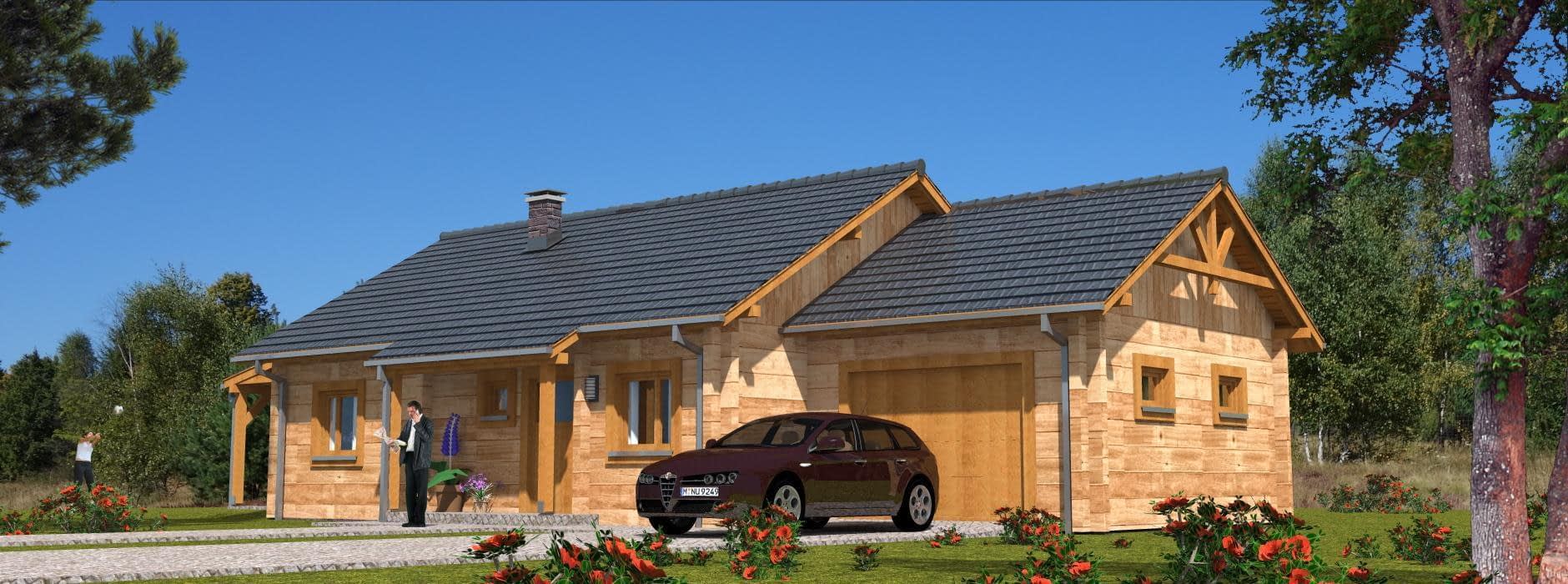 Ten parterowy dom spełnia wymogi rodzin z dziećmi, które nie chcą olbrzymich przestrzeni. W strefie dziennej inwestor ma dyspozycji duży pokój dzienny wraz z aneksem kuchenno-jadalnym. W pokoju dziennym jest miejsce na komplet wypoczynkowy, z którego jest widoczny kominek oraz miejsce na komodę ze sprzętem audio-wizualnym. Bezpośrednie szerokie wyjście z tego pomieszczenia na taras daje uczucie bliskiego kontaktu z otoczeniem. Taras jest zadaszony, dzięki czemu można na nim spedzać czas bez względu na warunki pogodowe. Z pokoju dziennego poprzez holl przejdziemy do części nocnej. Znajdziemy tu 3 wygodne sypialnie oraz łazienkę. Wszystkie te pomieszczenia mają duże okna, dzięki którym światła w nich nie zabraknie. Garaż nie jest połączony z częścią mieszkalną, ale dzięki temu że jest duży służy on jako pomieszczenie gospodarcze. Zmieszczą sie tu również narzędzia ogrodowe. Dom został zaprojektowany w technologi z bala, a co za tym idzie ma on swój naturalny mikroklimat, dzięki któremu każdy mieszkaniec będzie czuł się tu dobrze. Jest on również ciepły, o czym przekonał się na pewno niejeden inwestor.Rzuty