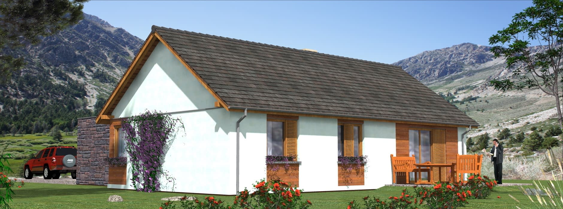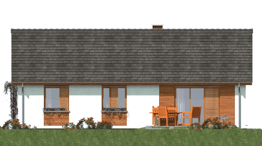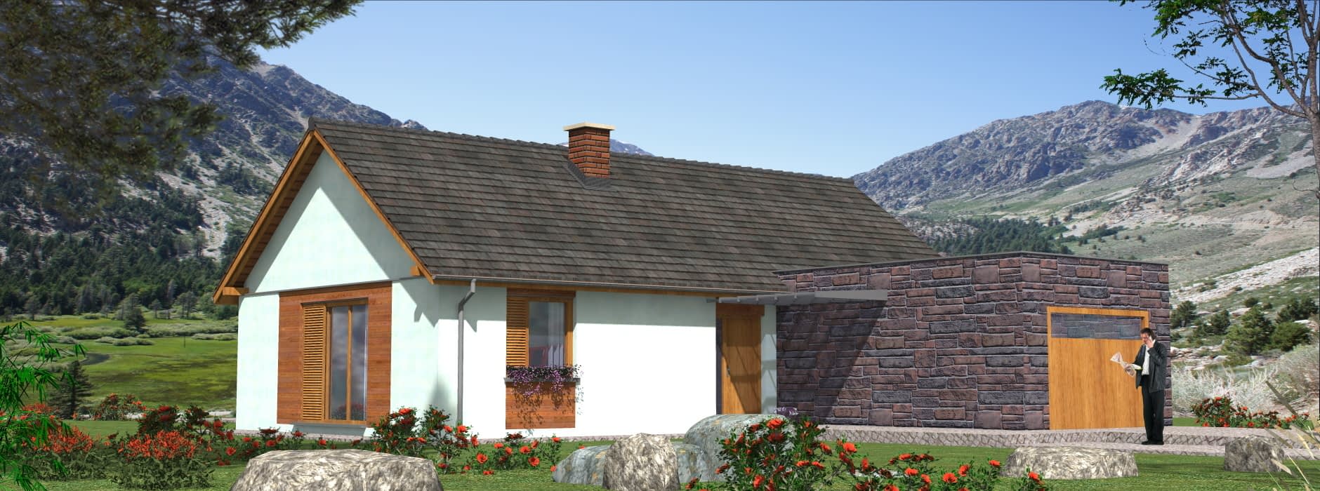 Ten parterowy dom z bala łączy nowoczesną, prostą bryłę z funkcjonalnym wnętrzem, które zostało zaprojektowane z myślą o komforcie mieszkańców. Budynek wyraźnie rozdziela strefę dzienną od nocnej, co zwiększa wygodę codziennego użytkowania i podkreśla ergonomiczny układ przestrzeni. Strefa dzienna W części dziennej domownicy mają do dyspozycji: Przestronny pokój dzienny, w którym znajduje się miejsce na duży komplet wypoczynkowy i stół jadalny, Wydzieloną kuchnię ze spiżarką, zapewniającą praktyczne miejsce do przechowywania produktów, Kominek, który ogrzewa pomieszczenie w chłodne dni, Szerokie przeszklenia i wyjście na taras, które wizualnie powiększają przestrzeń i zapewniają kontakt z otoczeniem. Strefa nocna Przez hol prowadzi droga do części nocnej domu, w której zaplanowano: Trzy wygodne sypialnie, Łazienkę, Wszystkie pomieszczenia wyposażono w duże okna, które wpuszczają dużo naturalnego światła. Dodatkowe udogodnienia Duży garaż połączony z częścią mieszkalną poprzez pomieszczenie gospodarcze/kotłownię, Dom z bala zapewnia naturalny mikroklimat, ciepło i przytulność wnętrza, Ekologiczne materiały konstrukcyjne sprawiają, że dom jest przyjazny dla zdrowia mieszkańców. Zalety technologii z bala Doskonała izolacja termiczna i akustyczna, Naturalne drewno tworzy przyjazny mikroklimat, Tradycja połączona z nowoczesnym designem, Wyjątkowy wygląd, który wyróżnia się na tle sąsiedztwa.Rzuty