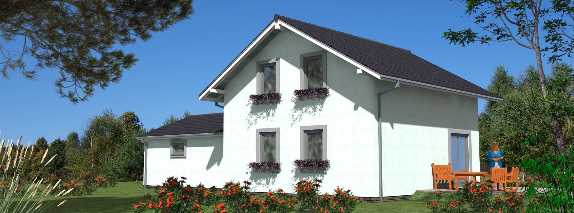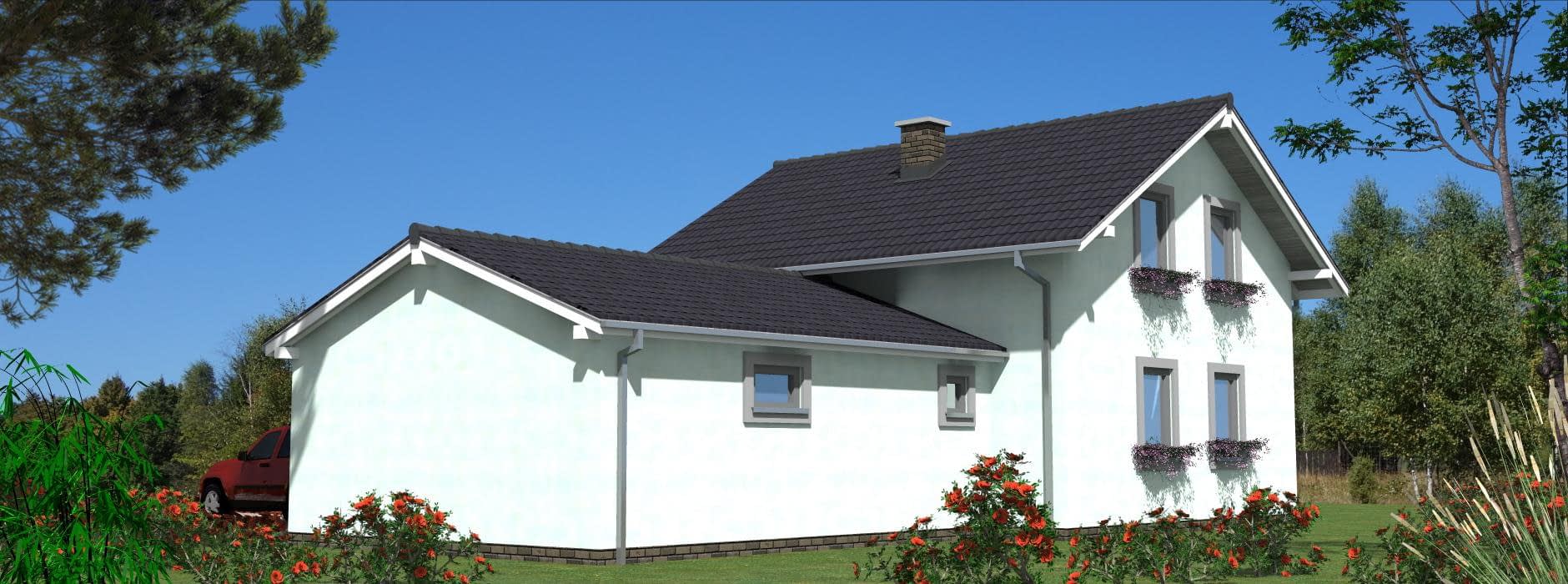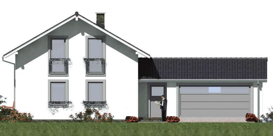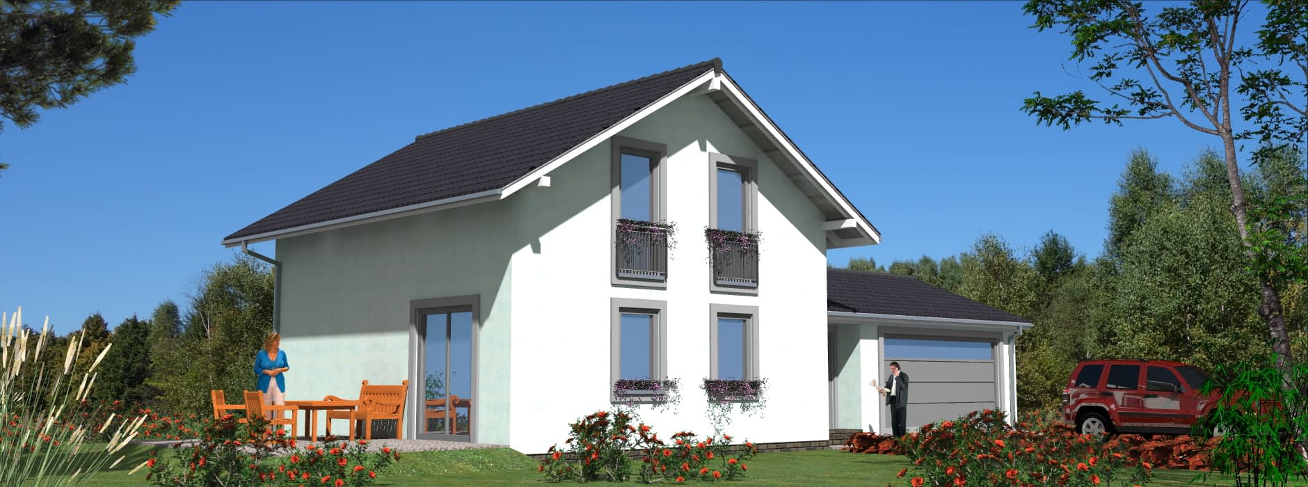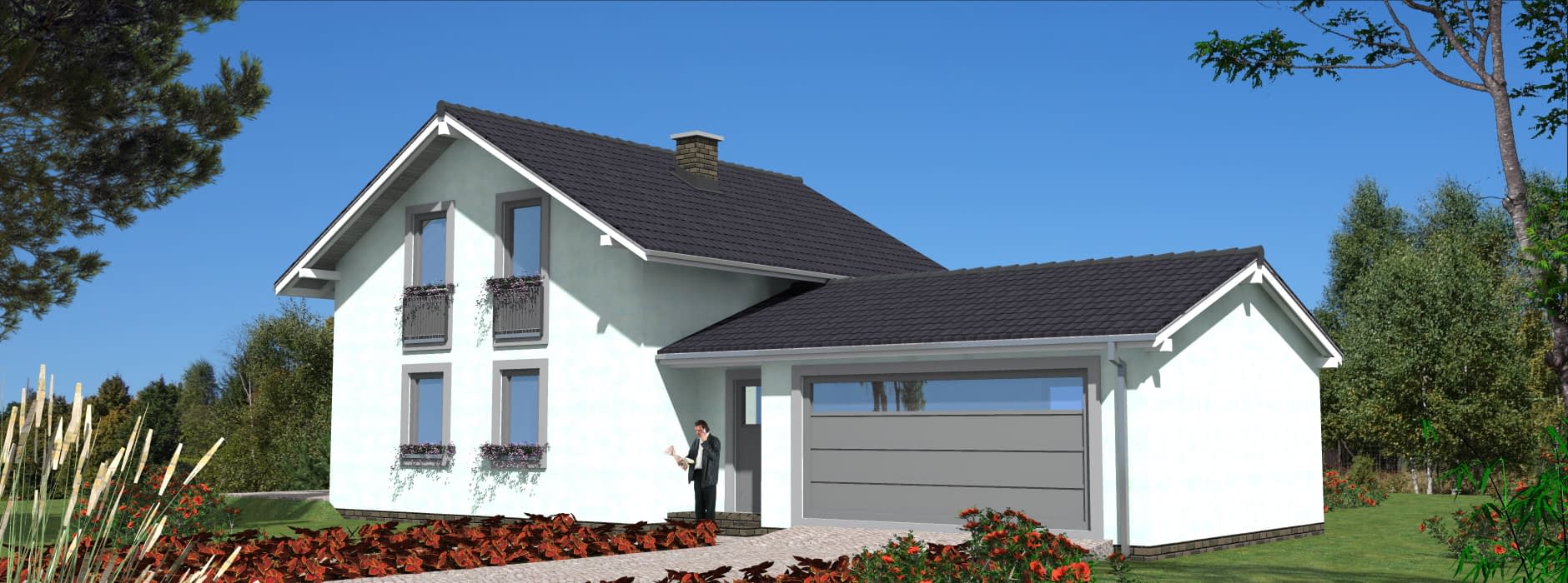 Dom szkieletowy w stylu skandynawskim – funkcjonalność, komfort i ekonomia Ten dom szkieletowy w stylu skandynawskim łączy w sobie nowoczesną prostotę formy, funkcjonalność i wygodę mieszkania. Jego architektura charakteryzuje się oszczędną, minimalistyczną bryłą oraz przemyślanym rozmieszczeniem przestrzeni, dzięki czemu wnętrze domu jest jasne, przestronne i ergonomiczne. Funkcjonalne wnętrze z podziałem na strefy Projekt domu zakłada wyraźny podział na część dzienną i nocną, który zwiększa komfort użytkowania: Parter: przestronny pokój dzienny połączony z otwartym aneksem jadalnym i kuchnią, umożliwiający swobodne przebywanie całej rodziny w jednym pomieszczeniu, duży podwójny garaż, zapewniający miejsce na dwa samochody, pomieszczenie gospodarcze idealne do przechowywania sprzętów domowych, przestronny wiatrołap, który zapewnia wygodny dostęp do wnętrza domu oraz komfortową strefę wejściową. Poddasze: trzy wygodne sypialnie ze wspólną łazienką, przy dużej sypialni zaprojektowana przestronna garderoba, ograniczona powierzchnia komunikacyjna, co zwiększa efektywność wykorzystania przestrzeni i sprawia, że powierzchnia całkowita domu pozostaje kompaktowa, mimo licznych pomieszczeń. Zalety technologii szkieletowej Budowa domu w technologii szkieletowej zapewnia szereg korzyści: Ekonomia budowy i utrzymania – lekka konstrukcja sprawia, że dom jest ciepły i energooszczędny, Szybka realizacja inwestycji – prefabrykowane elementy pozwalają na sprawne tempo budowy, Elastyczność projektu – łatwe dostosowanie układu pomieszczeń do indywidualnych potrzeb inwestora, Możliwość użytkowania domu całorocznie lub jako komfortowego domu letniskowego. Dlaczego warto wybrać ten dom szkieletowy? Ten parterowy dom szkieletowy z poddaszem w stylu skandynawskim jest idealny dla rodzin, które cenią nowoczesną prostotę, funkcjonalność i komfort codziennego życia. Otwarta strefa dzienna sprzyja wspólnemu spędzaniu czasu, a ergonomiczne rozmieszczenie pomieszczeń i ograniczona powierzchnia komunikacyjna zapewniają maksymalną użyteczność każdego metra kwadratowego. Dodatkowo zastosowanie technologii szkieletowej sprawia, że dom jest nie tylko szybki w budowie, ale również bardzo ciepły i ekonomiczny w utrzymaniu, co przekłada się na realne oszczędności dla całej rodziny.Rzuty