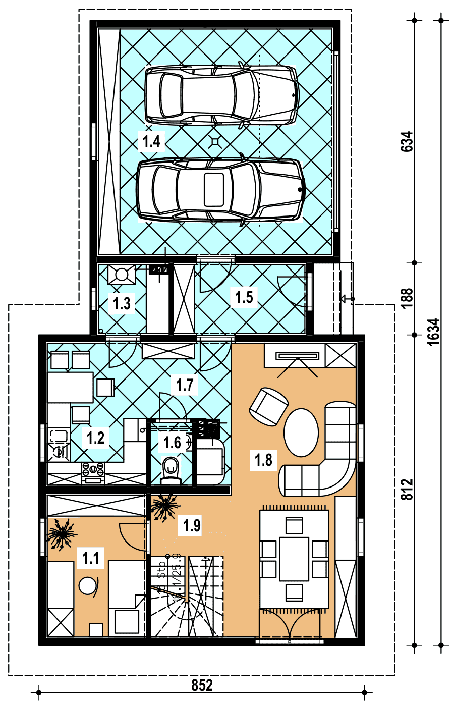 - komunikacja 5.00 pokój dzienny 27.20 hall 4.40 toaleta 1.80 wiatrołap 6.20 garaż 0.00 spiżarka 3.20 kuchnia 9.60 sypialnia 9.600
