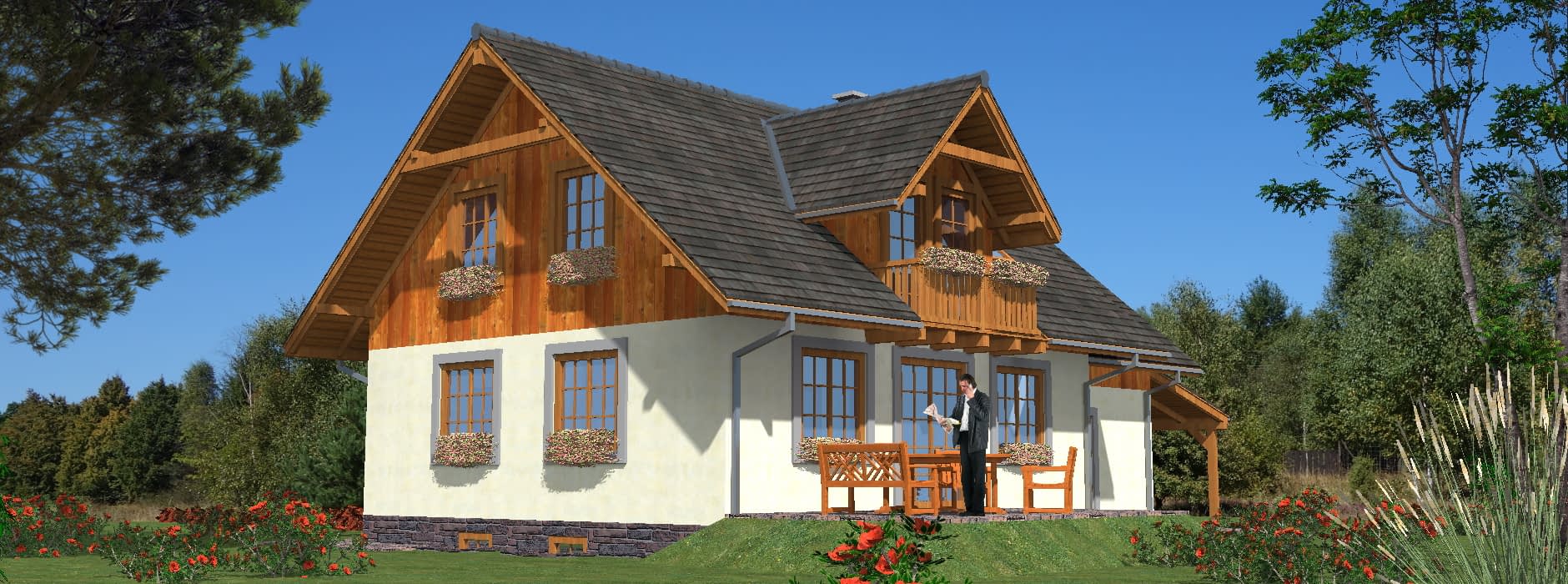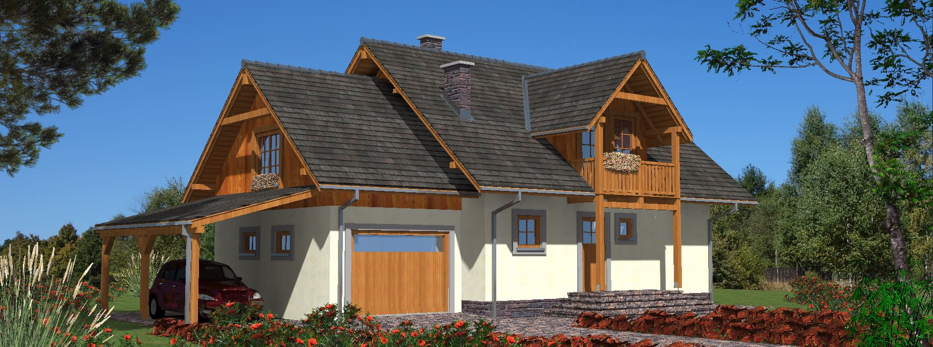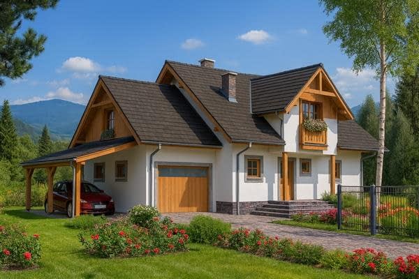 Projekt tego domu szkieletowego z poddaszem użytkowym łączy prostą, klasyczną bryłę z funkcjonalnymi rozwiązaniami, które wyróżniają go na tle sąsiedniej zabudowy. Wyraźnie zaakcentowane wejście nadaje budynkowi charakteru i elegancji, jednocześnie podkreślając jego nowoczesny wygląd. Dom przewidziany jest dla rodzin potrzebujących wielu sypialni, które mogą być również wykorzystywane jako pokoje gościnne, gabinety lub przestrzenie rekreacyjne. Układ funkcjonalny Parter to strefa dzienna: znajduje się tu przestronny pokój dzienny z aneksem jadalnym, wydzielona kuchnia ze spiżarką oraz łazienka. W salonie zaprojektowano kominek, który pozwala na dogrzewanie wnętrza w chłodniejsze dni. Klatka schodowa jest ciekawym elementem aranżacyjnym – znajduje się z boku pokoju dziennego, łącząc strefę dzienną z nocną, a jednocześnie nie zaburza przestronności wnętrza. Poddasze to strefa nocna z wieloma sypialniami, zapewniającymi komfort całej rodzinie. Piwnica mieści kotłownię i pomieszczenia gospodarcze, zapewniając praktyczne zaplecze dla domu. Garaż i wiata umożliwiają parkowanie dwóch samochodów i dodatkowo mogą służyć jako miejsce do przechowywania sprzętu. Zalety technologii szkieletowej Wysoka energooszczędność i niski koszt eksploatacji, Szybki czas realizacji inwestycji, Elastyczność aranżacyjna, umożliwiająca zmiany w układzie pomieszczeń, Ekologiczność i lekkość konstrukcji, co sprawia, że dom jest przyjazny dla mieszkańców. Ten dom szkieletowy z dużą ilością sypialni to idealna propozycja dla rodzin ceniących funkcjonalność, nowoczesny design i ekonomiczne rozwiązania budowlane.Rzuty