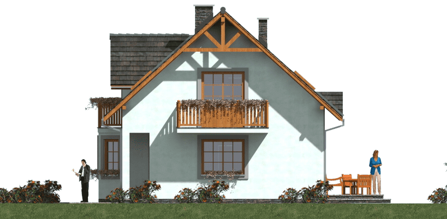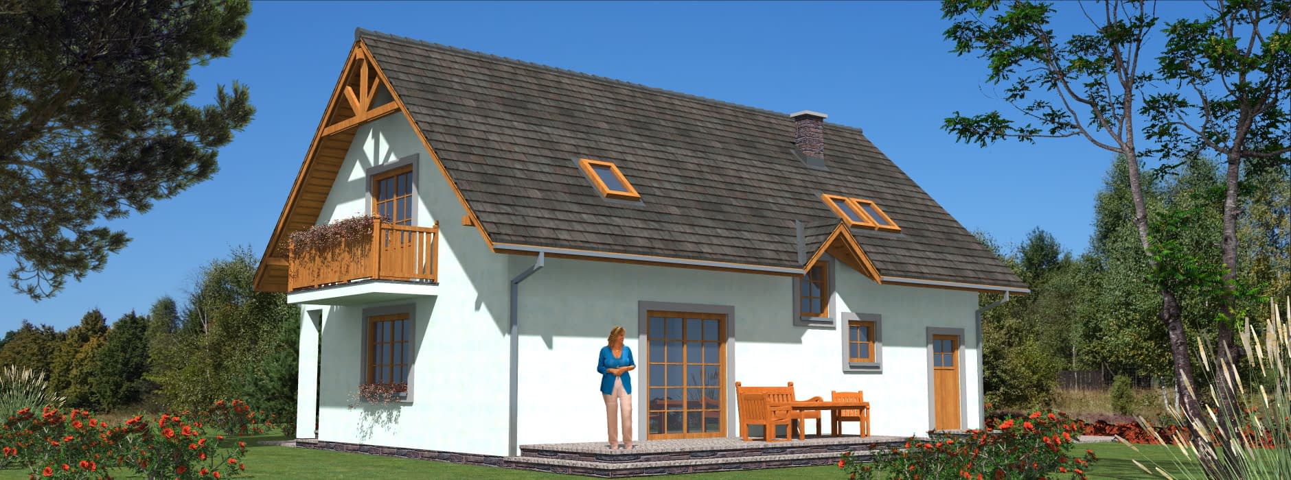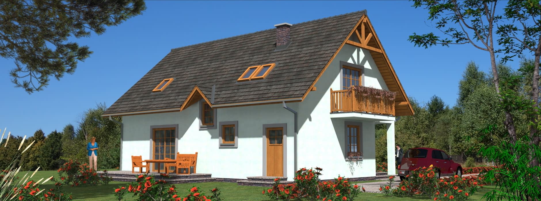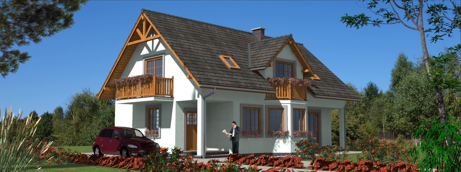 Parterowy dom szkieletowy z poddaszem – funkcjonalność i nowoczesna architektura Ten parterowy dom szkieletowy z poddaszem użytkowym został zaprojektowany z myślą o maksymalnej funkcjonalności i estetyce. Budynek idealnie nadaje się na działki, gdzie konieczne jest przewidzenie tarasu od strony wejścia, a dzięki przemyślanej konstrukcji pokój dzienny może posiadać taras z dwóch stron, co zwiększa komfort użytkowania i kontakt z otoczeniem. Architektura i design Budynek łączy prostotę architektoniczną z nowoczesnymi detalami. Dzięki wykuszowi, lukarnie oraz balkonom będzie się wyróżniał na tle innych domów w sąsiedztwie. Duże przeszklenia w salonie oraz balkony przy sypialniach zapewniają doskonałe doświetlenie wnętrz i kontakt z naturą. Funkcjonalne wnętrze Pokój dzienny z możliwością wyjścia na taras z dwóch stron, Oddzielna, przestronna kuchnia, która ułatwia codzienne przygotowywanie posiłków, Gabinet na parterze, idealny do pracy zdalnej lub nauki, Pomieszczenia gospodarcze i garderoby, zapewniające porządek i wygodę mieszkańców, Łazienka na parterze dla gości lub domowników. Strefa nocna Na poddaszu zaplanowano trzy komfortowe sypialnie, każda z własnym balkonem i garderobą. Dodatkowo przewidziano łazienkę dostępna dla wszystkich domowników. Indywidualne balkony pozwalają każdemu mieszkańcowi odprężyć się na świeżym powietrzu w dowolnej porze dnia, a jednocześnie zapewniają prywatność. Zalety technologii szkieletowej Ekonomiczny w użytkowaniu – niższe koszty ogrzewania i eksploatacji, Szybka budowa w porównaniu do tradycyjnych technologii murowanych, Lekka konstrukcja umożliwiająca łatwe adaptacje wnętrza, Możliwość całorocznego użytkowania domu lub wykorzystania go jako domu letniskowego. Podsumowanie Ten dom szkieletowy z poddaszem to propozycja dla rodzin poszukujących połączenia nowoczesnej architektury, funkcjonalności i komfortu życia. Doskonale sprawdzi się zarówno na działkach z ograniczeniami przestrzennymi, jak i w tradycyjnym otoczeniu, oferując przestronne wnętrza, liczne tarasy i balkony oraz ekonomiczne użytkowanie.Rzuty