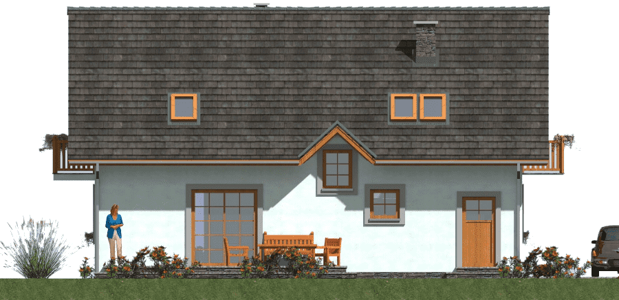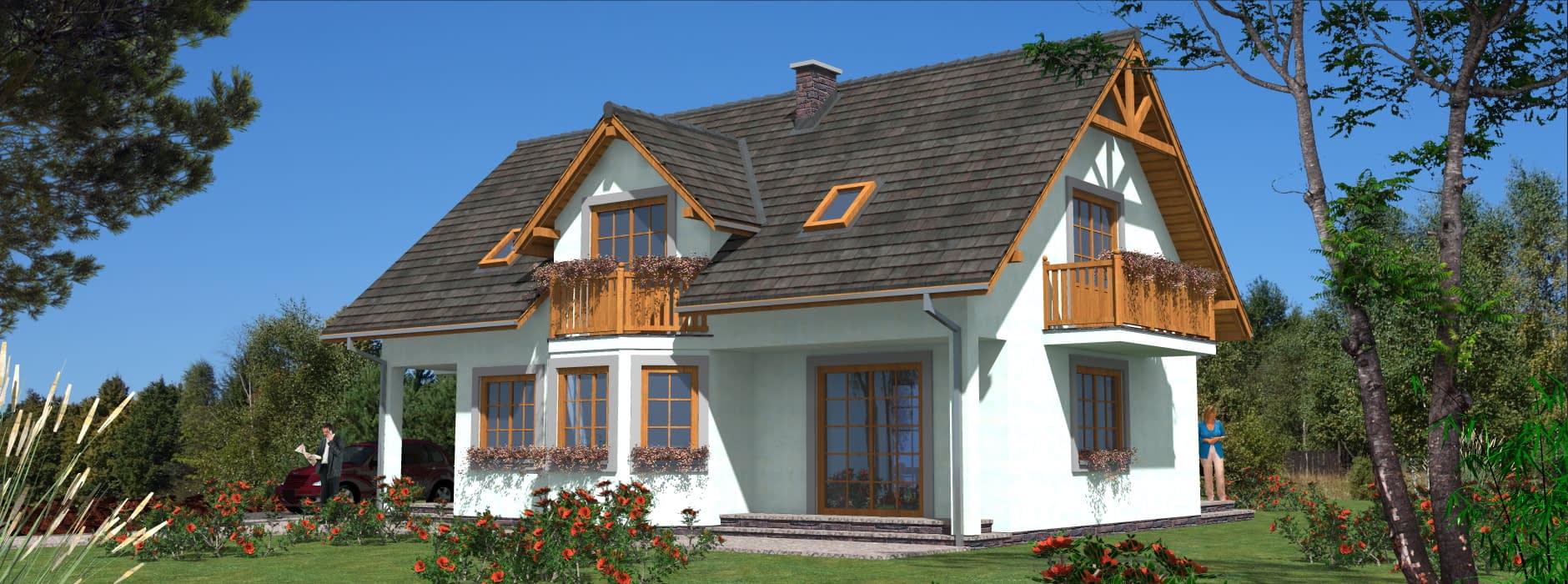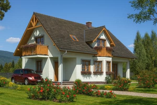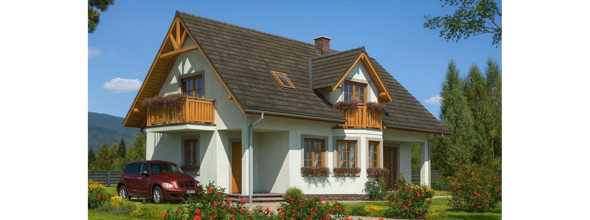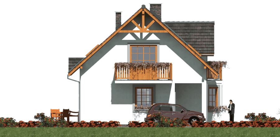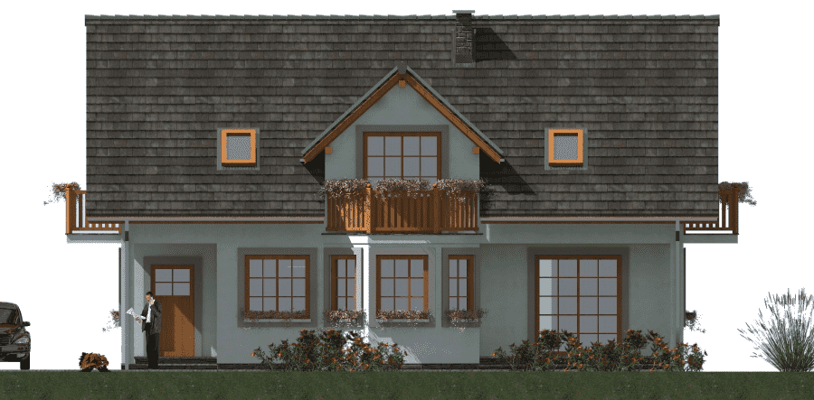Parterowy dom szkieletowy z poddaszem – funkcjonalność i nowoczesna architektura Ten parterowy dom szkieletowy z poddaszem użytkowym został zaprojektowany z myślą o maksymalnej funkcjonalności i estetyce. Budynek idealnie nadaje się na działki, gdzie konieczne jest przewidzenie tarasu od strony wejścia, a dzięki przemyślanej konstrukcji pokój dzienny może posiadać taras z dwóch stron, co zwiększa komfort użytkowania i kontakt z otoczeniem. Architektura i design Budynek łączy prostotę architektoniczną z nowoczesnymi detalami. Dzięki wykuszowi, lukarnie oraz balkonom będzie się wyróżniał na tle innych domów w sąsiedztwie. Duże przeszklenia w salonie oraz balkony przy sypialniach zapewniają doskonałe doświetlenie wnętrz i kontakt z naturą. Funkcjonalne wnętrze Pokój dzienny z możliwością wyjścia na taras z dwóch stron, Oddzielna, przestronna kuchnia, która ułatwia codzienne przygotowywanie posiłków, Gabinet na parterze, idealny do pracy zdalnej lub nauki, Pomieszczenia gospodarcze i garderoby, zapewniające porządek i wygodę mieszkańców, Łazienka na parterze dla gości lub domowników. Strefa nocna Na poddaszu zaplanowano trzy komfortowe sypialnie, każda z własnym balkonem i garderobą. Dodatkowo przewidziano łazienkę dostępna dla wszystkich domowników. Indywidualne balkony pozwalają każdemu mieszkańcowi odprężyć się na świeżym powietrzu w dowolnej porze dnia, a jednocześnie zapewniają prywatność. Zalety technologii szkieletowej Ekonomiczny w użytkowaniu – niższe koszty ogrzewania i eksploatacji, Szybka budowa w porównaniu do tradycyjnych technologii murowanych, Lekka konstrukcja umożliwiająca łatwe adaptacje wnętrza, Możliwość całorocznego użytkowania domu lub wykorzystania go jako domu letniskowego. Podsumowanie Ten dom szkieletowy z poddaszem to propozycja dla rodzin poszukujących połączenia nowoczesnej architektury, funkcjonalności i komfortu życia. Doskonale sprawdzi się zarówno na działkach z ograniczeniami przestrzennymi, jak i w tradycyjnym otoczeniu, oferując przestronne wnętrza, liczne tarasy i balkony oraz ekonomiczne użytkowanie.Rzuty