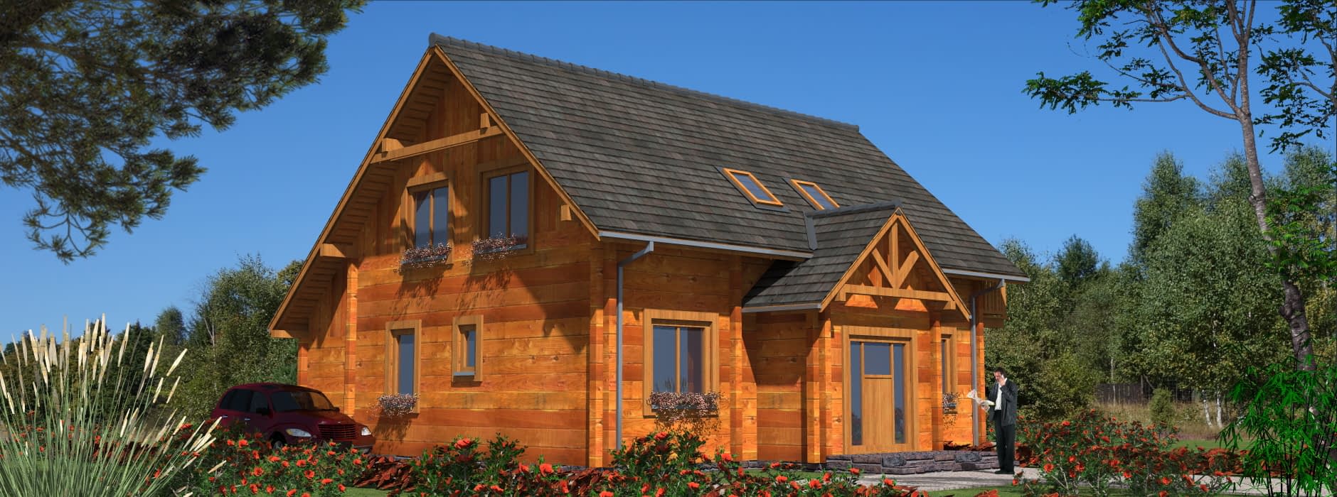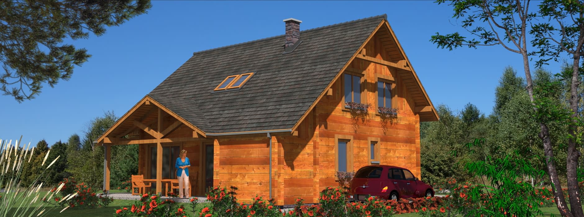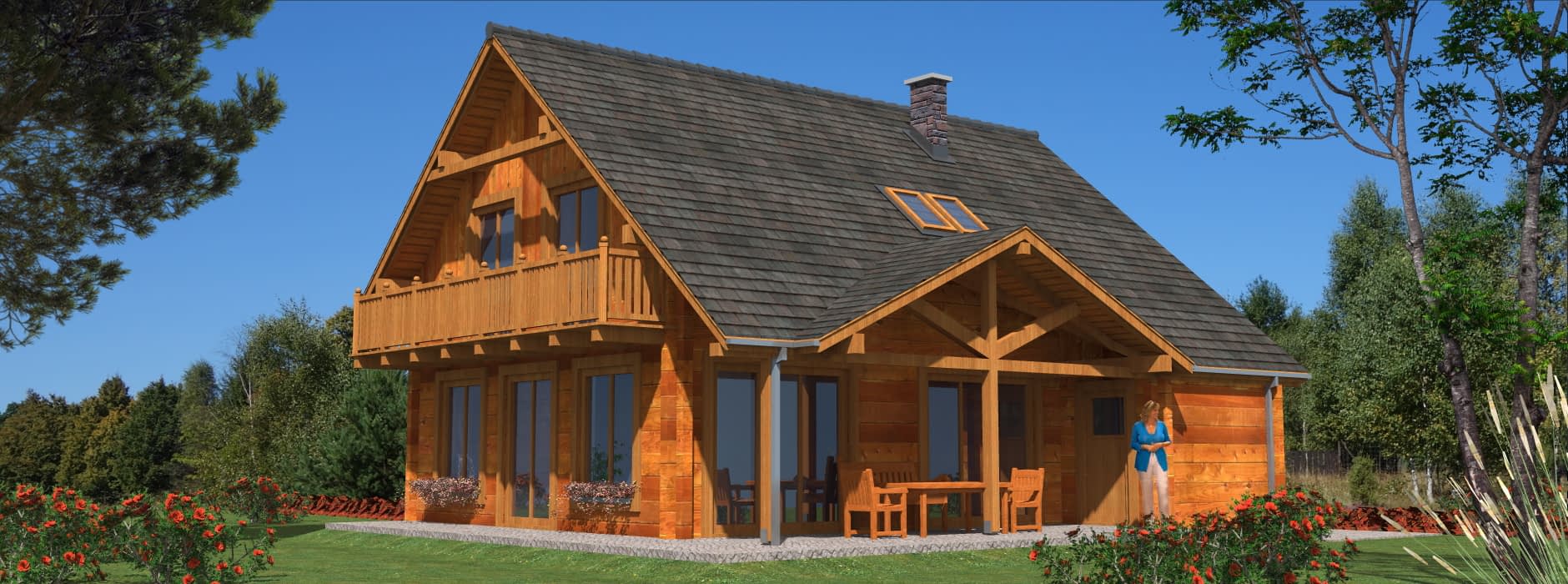 Prezentowany dom z bala z poddaszem użytkowym doskonale wpisuje się w naturalne otoczenie i stanowi połączenie tradycji z funkcjonalnością. Budynek przeznaczony jest na działki płaskie lub o lekkim spadku. Dużym atutem projektu jest zadaszony taras, który idealnie sprawdzi się jako miejsce do wypoczynku na świeżym powietrzu. Obok zaprojektowano pomieszczenie gospodarcze, pełniące rolę praktycznego zaplecza domu. Dom może być użytkowany całorocznie, jako dom drewniany z bala na stałe zamieszkanie, lub jako komfortowy domek letniskowy. Jego architektura opiera się na prostej bryle parterowej z użytkowym poddaszem i dachem dwuspadowym o nachyleniu 40°. Układ pomieszczeń Parter zaplanowano jako strefę dzienną, z której korzystać będzie cała rodzina. Znajduje się tu salon z kominkiem i wyjściem na taras drewniany, otwarty aneks kuchenny oraz klatka schodowa. Przewidziano także dwie sypialnie z łazienką, co zapewnia wygodę na co dzień. Hall, dostępny z wiatrołapu, pełni rolę głównego trzonu komunikacyjnego budynku. Poddasze to przestrzeń nocna z trzema sypialniami i łazienką. Dodatkowym atutem jest antresola z widokiem na salon i taras, dzięki której wnętrze jest jasne i przestronne. Atuty technologii z bala naturalny mikroklimat wnętrza, sprzyjający zdrowiu, ekologiczne materiały budowlane, niepowtarzalna estetyka drewnianych domów, doskonałe właściwości termoizolacyjne, gwarantujące komfort zimą i latem. Ten dom z bala z poddaszem i tarasem to idealna propozycja dla osób ceniących tradycję, naturalność i wyjątkowy klimat drewnianej architektury.Rzuty