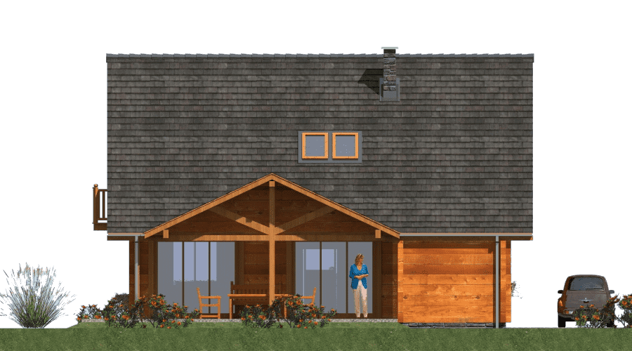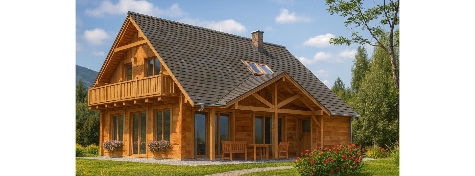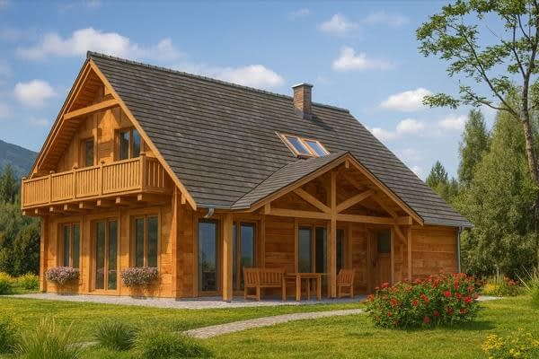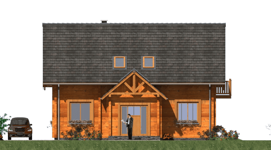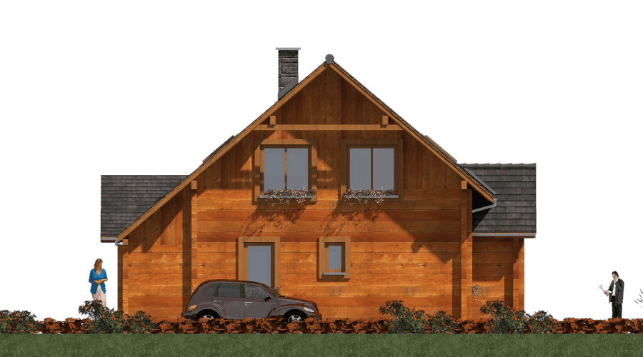 Prezentowany dom z bala z poddaszem użytkowym doskonale wpisuje się w naturalne otoczenie i stanowi połączenie tradycji z funkcjonalnością. Budynek przeznaczony jest na działki płaskie lub o lekkim spadku. Dużym atutem projektu jest zadaszony taras, który idealnie sprawdzi się jako miejsce do wypoczynku na świeżym powietrzu. Obok zaprojektowano pomieszczenie gospodarcze, pełniące rolę praktycznego zaplecza domu. Dom może być użytkowany całorocznie, jako dom drewniany z bala na stałe zamieszkanie, lub jako komfortowy domek letniskowy. Jego architektura opiera się na prostej bryle parterowej z użytkowym poddaszem i dachem dwuspadowym o nachyleniu 40°. Układ pomieszczeń Parter zaplanowano jako strefę dzienną, z której korzystać będzie cała rodzina. Znajduje się tu salon z kominkiem i wyjściem na taras drewniany, otwarty aneks kuchenny oraz klatka schodowa. Przewidziano także dwie sypialnie z łazienką, co zapewnia wygodę na co dzień. Hall, dostępny z wiatrołapu, pełni rolę głównego trzonu komunikacyjnego budynku. Poddasze to przestrzeń nocna z trzema sypialniami i łazienką. Dodatkowym atutem jest antresola z widokiem na salon i taras, dzięki której wnętrze jest jasne i przestronne. Atuty technologii z bala naturalny mikroklimat wnętrza, sprzyjający zdrowiu, ekologiczne materiały budowlane, niepowtarzalna estetyka drewnianych domów, doskonałe właściwości termoizolacyjne, gwarantujące komfort zimą i latem. Ten dom z bala z poddaszem i tarasem to idealna propozycja dla osób ceniących tradycję, naturalność i wyjątkowy klimat drewnianej architektury.Rzuty