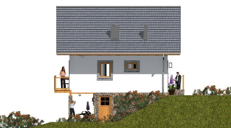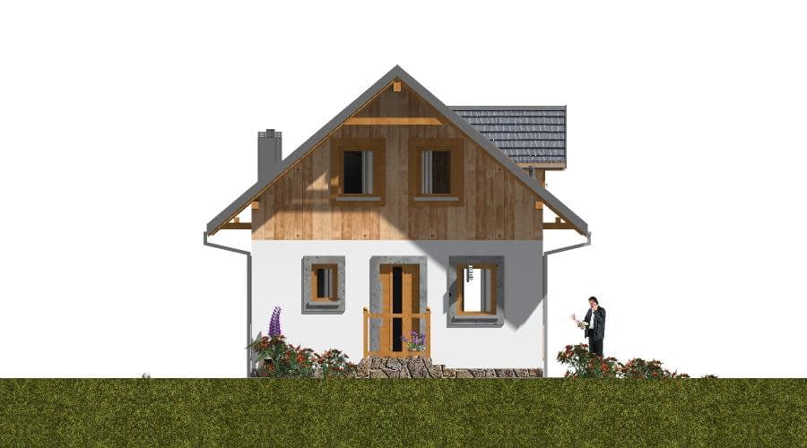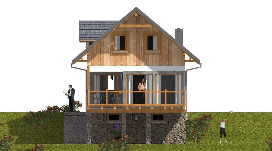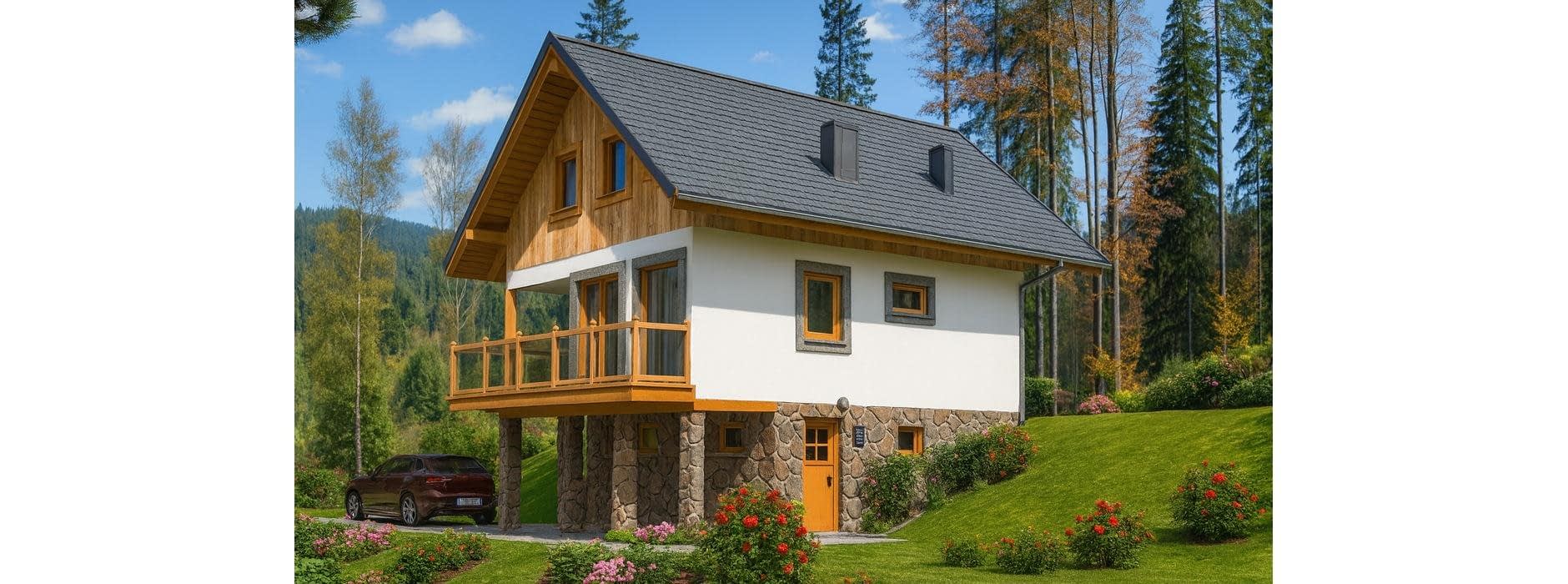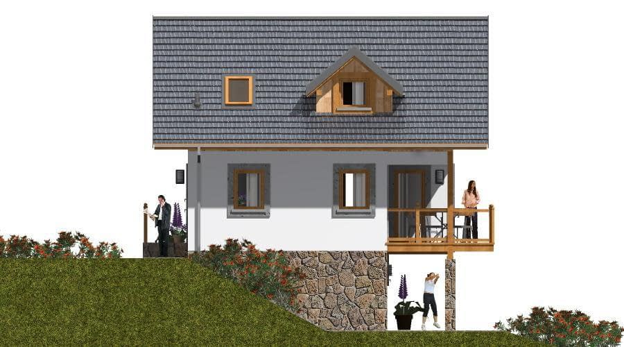 Prezentowany projekt domu szkieletowego został zaprojektowany z myślą o działkach ze spadkiem, co pozwala w pełni wykorzystać naturalne ukształtowanie terenu. Dzięki takiemu rozwiązaniu mieszkańcy mogą cieszyć się przepięknym widokiem z przestronnego tarasu oraz przeszklonego pokoju dziennego, w którym zaplanowano także miejsce na kominek. Dom zaprojektowano jako obiekt wolnostojący, który może być użytkowany zarówno jako dom całoroczny, jak i komfortowy dom letniskowy. Budynek jest parterowy, częściowo podpiwniczony, z poddaszem użytkowym i dachem dwuspadowym o kącie nachylenia 40°. Funkcjonalny układ wnętrz Parter to strefa dzienna – z wiatrołapu prowadzi wejście do hallu, stanowiącego główny trzon komunikacyjny domu. Z niego dostępny jest salon z kominkiem i wyjściem na taras, jasna kuchnia oraz łazienka. Schody prowadzą na poddasze użytkowe. Poddasze zaprojektowano jako strefę nocną. Z niewielkiego hallu przewidziano wejście do trzech wygodnych sypialni, które zapewniają komfort domownikom. Piwnica mieści pomieszczenie gospodarcze, a pod tarasem przewidziano miejsce postojowe dla samochodu, co jest praktycznym rozwiązaniem szczególnie na działkach o zróżnicowanej rzeźbie terenu. Atuty domu szkieletowego Dom wykonany w technologii szkieletowej to: energooszczędność i ekonomia w użytkowaniu, krótki czas budowy, doskonała izolacja cieplna i akustyczna, możliwość łatwej rozbudowy i adaptacji projektu. Ten dom szkieletowy z poddaszem i tarasem to propozycja dla osób, które cenią funkcjonalność, nowoczesne rozwiązania oraz ekonomię użytkowania.Rzuty