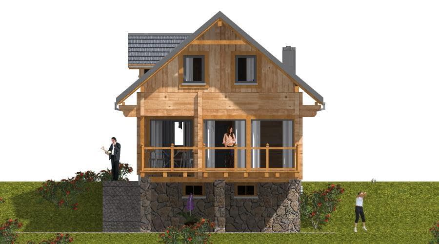 Prezentowany projekt domu z bala łączy naturalne piękno drewna z funkcjonalnymi rozwiązaniami architektonicznymi. Dzięki posadowieniu budynku na działce ze spadkiem, mieszkańcy mogą cieszyć się niezwykłym widokiem z dużego tarasu oraz przeszklonego pokoju dziennego. Projekt przewiduje także kominek w salonie, który podkreśla wyjątkowy klimat domu drewnianego. Dom zaprojektowano jako obiekt wolnostojący, który sprawdzi się zarówno jako całoroczny dom z bala, jak i stylowy dom letniskowy. Budynek jest parterowy, częściowo podpiwniczony, z użytkowym poddaszem i klasycznym dachem dwuspadowym o kącie nachylenia 40°. Układ pomieszczeń Parter pełni rolę strefy dziennej. Z wiatrołapu przechodzimy do hallu, który łączy wszystkie pomieszczenia – salon z kominkiem i wyjściem na taras drewniany, kuchnię oraz łazienkę. Schody prowadzą na poddasze użytkowe. Poddasze to wygodna strefa nocna, z trzema przestronnymi sypialniami, połączonymi niewielkim halllem. Piwnica zawiera praktyczne pomieszczenie gospodarcze, a pod tarasem zaplanowano zadaszone miejsce postojowe dla samochodu. Atuty domu z bala Dom wykonany w technologii z bala to: naturalny mikroklimat sprzyjający zdrowiu, doskonała izolacja cieplna, dzięki której dom jest ciepły zimą i przyjemnie chłodny latem, ekologiczne materiały budowlane, niepowtarzalny charakter i estetyka domu drewnianego. Ten dom z bala z poddaszem i tarasem to idealne rozwiązanie dla osób, które cenią naturalność, tradycję oraz niepowtarzalny klimat drewnianych domów.Rzuty