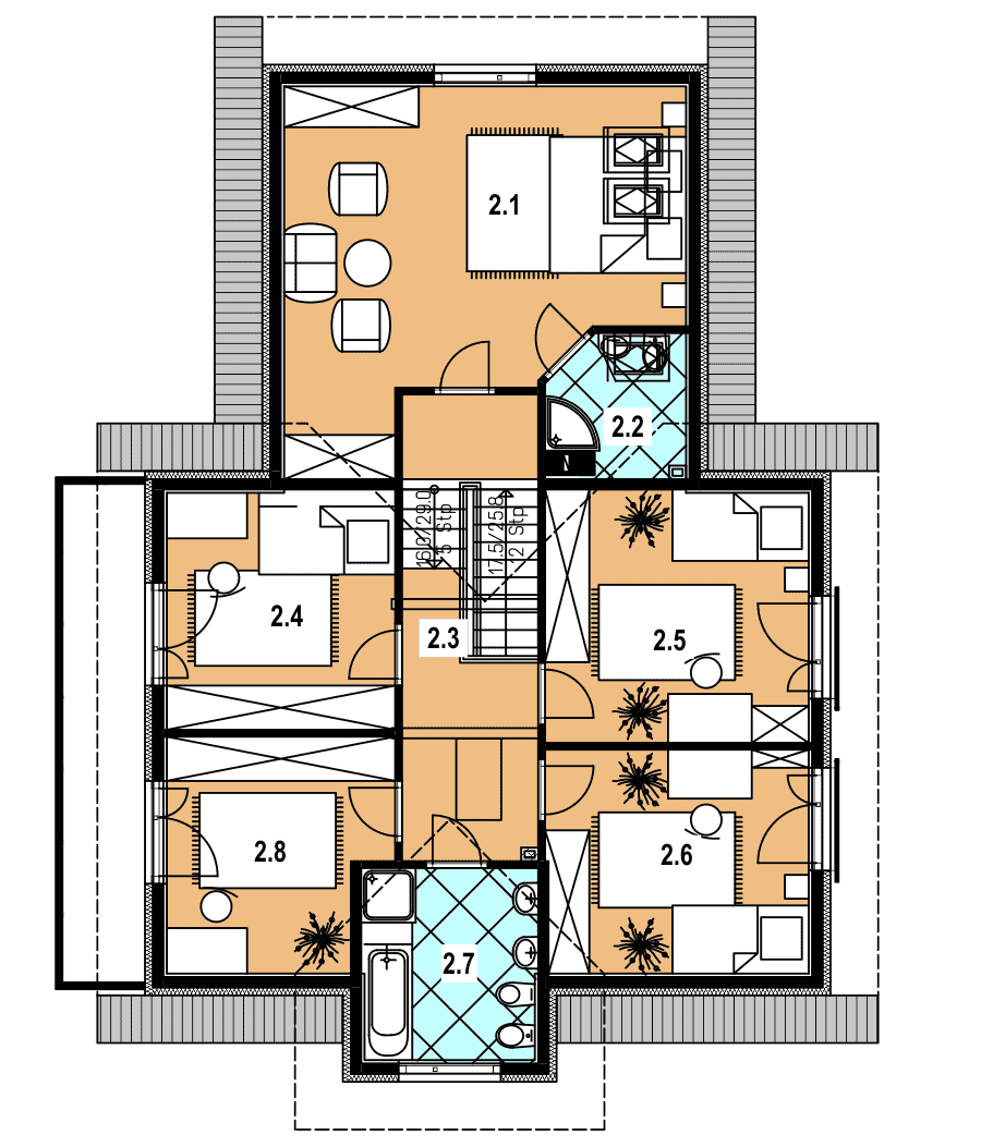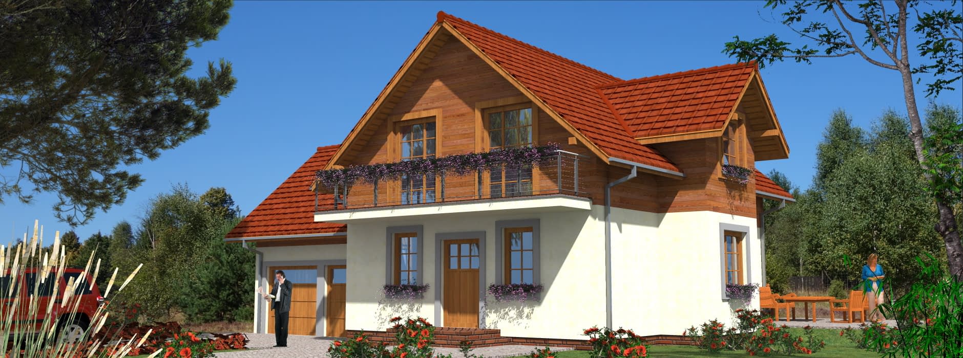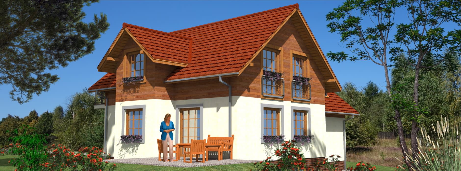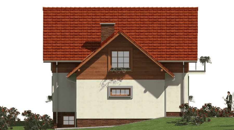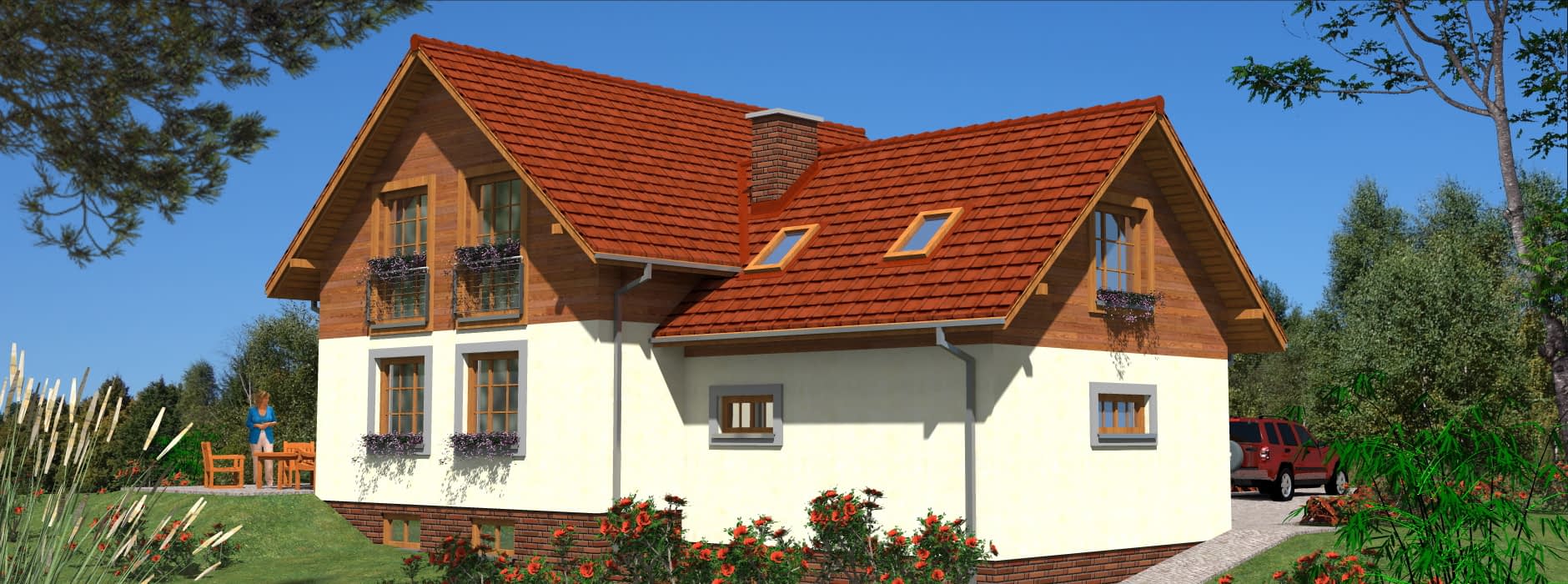Prezentowany projekt domu szkieletowego to połączenie tradycyjnej architektury z nowoczesnymi rozwiązaniami. Prosta, elegancka bryła budynku sprawia, że dom doskonale wpisuje się w otoczenie typowego budownictwa, a jednocześnie zachowuje swój indywidualny charakter. Dzięki posadowieniu budynku na działce ze spadkiem, mieszkańcy mogą cieszyć się przepięknym widokiem z tarasu i przeszklonego pokoju dziennego, co nadaje wnętrzu wyjątkowego klimatu. Układ funkcjonalny domu szkieletowego Dom zaprojektowano jako obiekt wolnostojący, całoroczny, z pełnym podpiwniczeniem i użytkowym poddaszem. To sprawia, że budynek jest idealnym rozwiązaniem zarówno dla rodzin z dziećmi, jak i dla osób, które szukają wygodnego i przestronnego domu na lata. Parter to strefa całodziennej aktywności. Z wiatrołapu, w którym umieszczono główne wejście, prowadzi komunikacja do funkcjonalnego hallu. Z niego dostępne są: pokój dzienny z kominkiem i wyjściem na taras, kuchnia, łazienka oraz przejście do garażu. Dzięki otwartym przestrzeniom wnętrza wydają się większe, a duże przeszklenia zapewniają mnóstwo naturalnego światła. Poddasze stanowi strefę nocną. Zaprojektowano tu aż pięć sypialni, co czyni dom idealnym dla dużej rodziny. Jedna z sypialni posiada własną łazienkę, co sprawdza się doskonale w przypadku rodzin dwupokoleniowych lub podczas przyjmowania gości. Piwnica mieści pomieszczenie gospodarcze i kotłownię, co pozwala na wygodne zagospodarowanie przestrzeni technicznej i utrzymanie porządku w strefach mieszkalnych. Atuty technologii szkieletowej Dom został przewidziany w technologii szkieletowej, co niesie ze sobą wiele korzyści dla inwestora: niski koszt eksploatacji – dom szkieletowy jest ciepły i energooszczędny, szybki czas budowy – realizacja inwestycji trwa znacznie krócej niż w przypadku tradycyjnych technologii murowanych, trwałość i solidność konstrukcji, komfort i zdrowy mikroklimat, dzięki zastosowaniu naturalnych materiałów izolacyjnych. Ten dom szkieletowy z poddaszem użytkowym, garażem i piwnicą to propozycja dla osób, które poszukują przestronnego, funkcjonalnego i jednocześnie ekonomicznego w użytkowaniu budynku. Dzięki przemyślanemu projektowi oraz zastosowaniu technologii szkieletowej dom łączy w sobie wygodę, oszczędność i ponadczasową estetykę.Rzuty