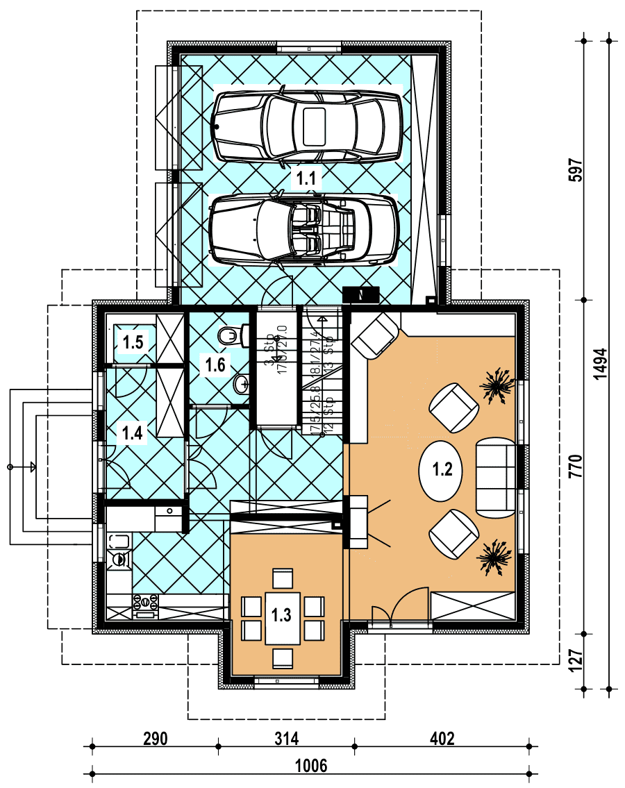 - sluza 2.50 hall 7.60 wc 3.00 garderoba 2.10 wiatrołap 5.50 kuchnia 16.20 pokój dzienny 27.10 garaż 0.000