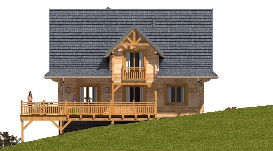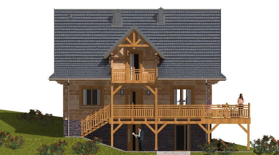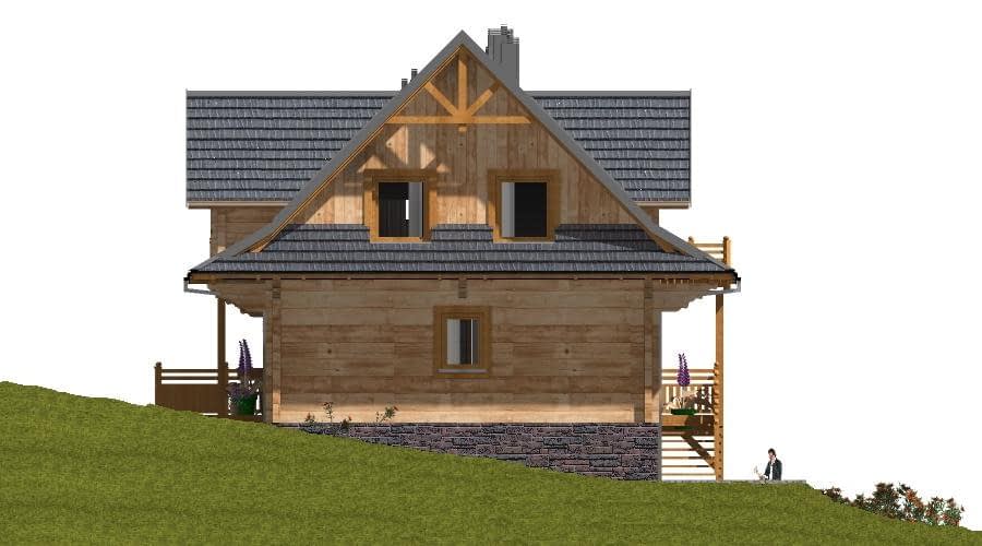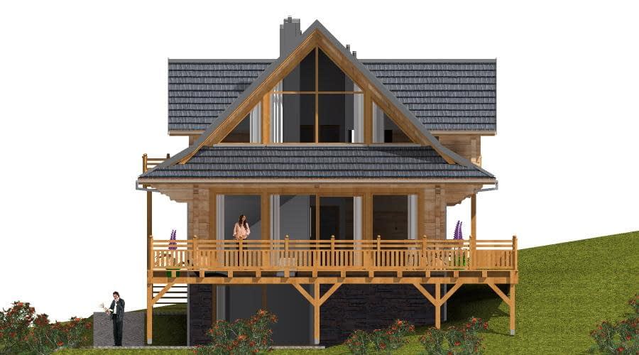 Projekt domu szkieletowego na działkę ze spadkiem to propozycja dla osób, które szukają nowoczesnego, funkcjonalnego i energooszczędnego domu. Dzięki lokalizacji budynku na terenie o zróżnicowanym ukształtowaniu mieszkańcy mogą cieszyć się niepowtarzalnym widokiem z tarasu oraz przeszklonego salonu. Układ funkcjonalny budynku Dom zaprojektowano jako wolnostojący budynek parterowy z użytkowym poddaszem i piwnicą, przykryty dachem dwuspadowym o kącie nachylenia 45°. Parter stanowi strefę dzienną – z wiatrołapu prowadzi wejście do hallu, który organizuje komunikację wewnątrz budynku. Z hallu dostępne są: jasny pokój dzienny z miejscem na kominek i wyjściem na drewniany taras, kuchnia, łazienka oraz klatka schodowa na poddasze. Na poddaszu zaplanowano komfortową strefę nocną – trzy sypialnie połączone niewielkim, ale wygodnym hallem. Piwnica przewidziana została jako praktyczna część gospodarcza z pomieszczeniem technicznym i przestrzenią do przechowywania. Zalety technologii szkieletowej Dom wykonany w technologii szkieletowej wyróżnia się: szybkim czasem realizacji inwestycji, wysoką energooszczędnością i doskonałą izolacją cieplną, ekologicznymi materiałami przyjaznymi mieszkańcom, elastycznością aranżacyjną – możliwość łatwych zmian w układzie wnętrz. Ten dom szkieletowy z tarasem i użytkowym poddaszem sprawdzi się zarówno jako dom całoroczny dla rodziny, jak i jako funkcjonalny dom letniskowy w górach lub nad jeziorem.Rzuty