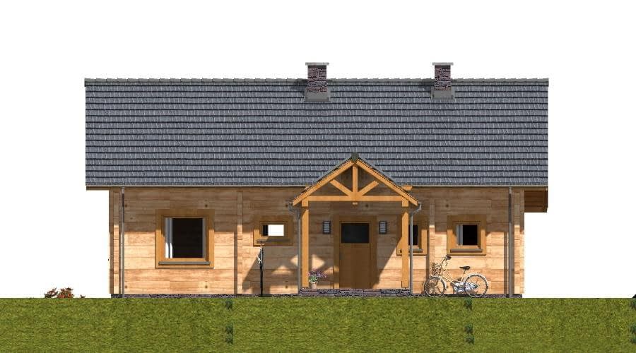 Projekt domu z bala usytuowanego na działce ze spadkiem to propozycja dla osób ceniących tradycyjne budownictwo drewniane w nowoczesnej formie. Dzięki położeniu budynku na zróżnicowanym terenie mieszkańcy mogą cieszyć się pięknymi panoramami z tarasu oraz przeszklonego salonu, kuchni i jadalni. Układ pomieszczeń Dom zaprojektowano jako wolnostojący, parterowy, z użytkowym poddaszem, piwnicą i dachem dwuspadowym o kącie 35°. Parter pełni rolę strefy dziennej – z wiatrołapu wchodzimy do hallu, z którego dostępne są: jasny pokój dzienny z kominkiem i wyjściem na taras, otwarta kuchnia z jadalnią, łazienka oraz sypialnia. Na poddaszu przewidziano dwie przytulne sypialnie z garderobami, połączone niewielkim hallem, co zapewnia domownikom komfort i prywatność. Piwnica mieści pomieszczenie gospodarcze oraz otwarte miejsca postojowe, idealne do przechowywania sprzętu i pojazdów. Atuty technologii z bala Wybór konstrukcji z bala sprawia, że dom: oferuje naturalny mikroklimat sprzyjający zdrowiu, jest ciepły zimą i przyjemnie chłodny latem, ma unikalny charakter dzięki naturalnemu drewnu, wyróżnia się trwałością i wyjątkowym stylem architektonicznym. Ten dom z bala z tarasem i użytkowym poddaszem to doskonały wybór zarówno jako dom całoroczny, jak i letniskowy. Łączy w sobie urok tradycji z funkcjonalnością nowoczesnych rozwiązań.Rzuty