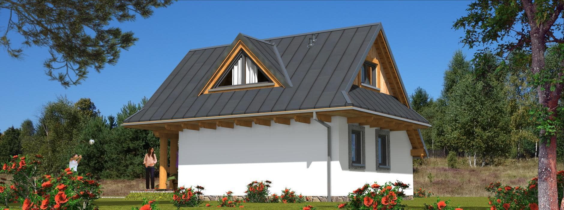 Nowoczesność z tradycją. Bryła budynku nawiązuje do architektury góralskiej, ale posiada również wiele elementów ze współczesnego budownictwa, jak choćby duże przeszklenia czy zadaszony taras. Wnętrze natomiast jest nieszablonowe. Duży otwarty pokój dzienny łączy się z kuchnią. Dlatego ma się tu wrażenie, iż pomieszczenia są znacznie większe. Do tego duże przeszklenie, które wpuszczają dużo światła, dzięki czemu pomieszczenia są jasne i przytulne. No i częściowo zadaszony taras. Wszystko to razem powoduje, iż mieszkańcy domu mogą korzystać z otaczającego dom ogrodu cały sezon. Klatka schodowa łączy się z poddaszem. Tutaj mamy 2 wygodne sypialnie. Wszystko te pomieszczenia łączy nieduży, ale wygodny hall. Projekt przewidziany jest w technologi szkieletowej, dzięki czemu dom będzie ekologiczny, ciepły i ekonomiczny. Technologia ta da temu budynkowi indywidualny klimat, który na pewno zachwyci niejednego inwestora.Rzuty