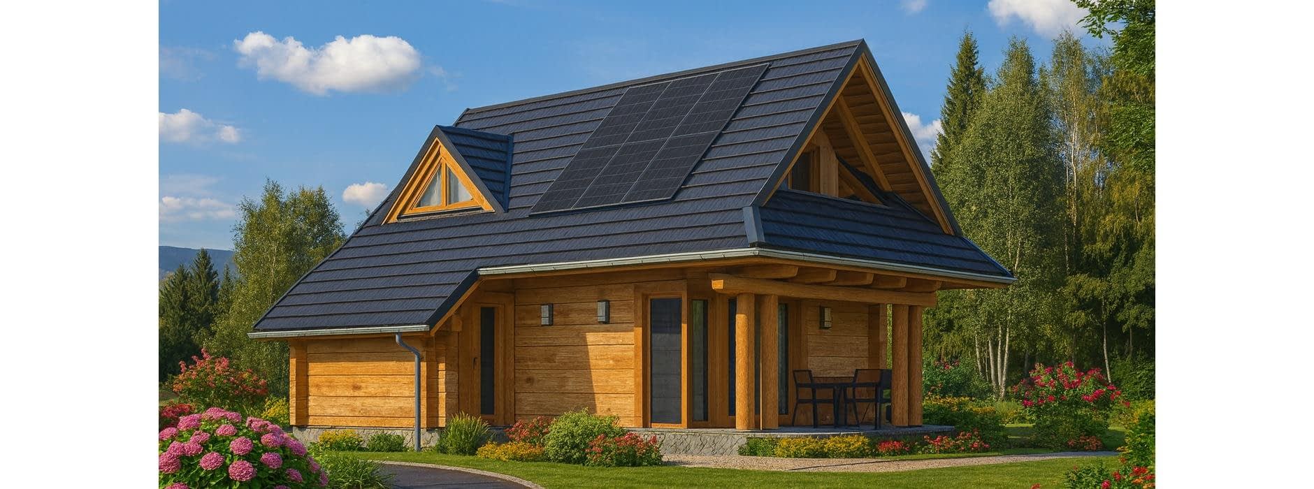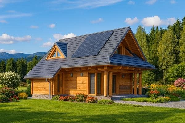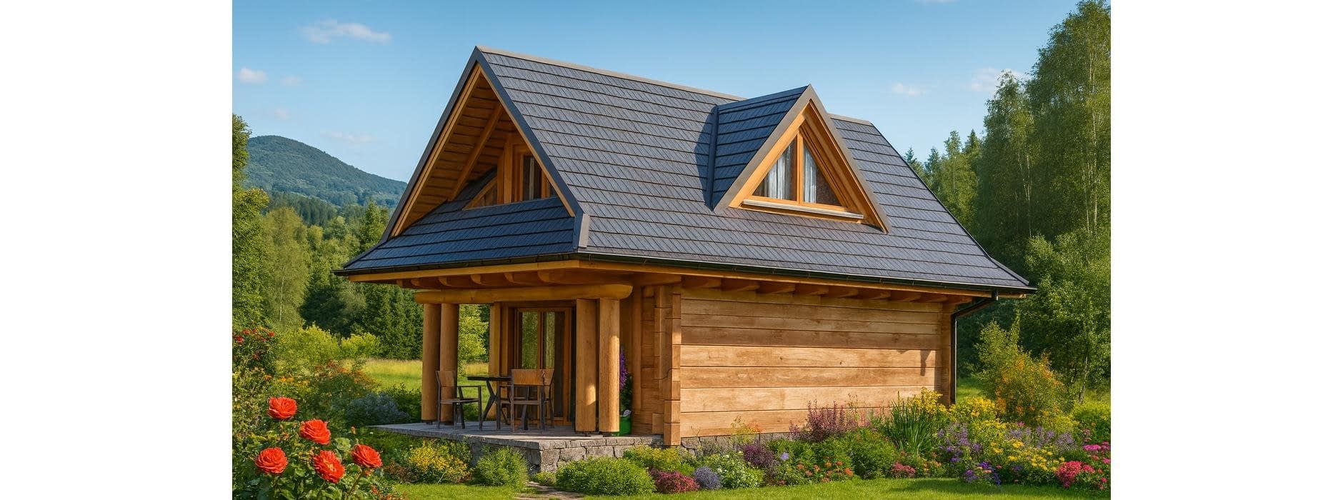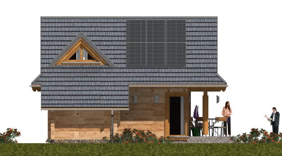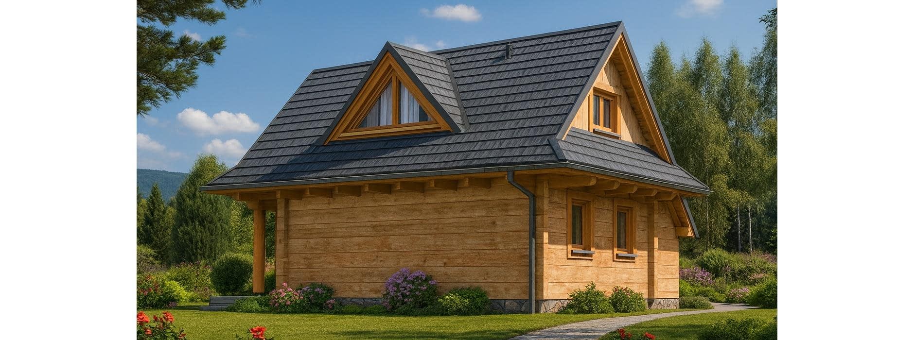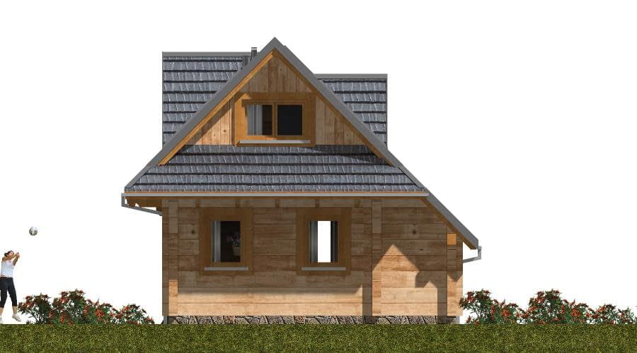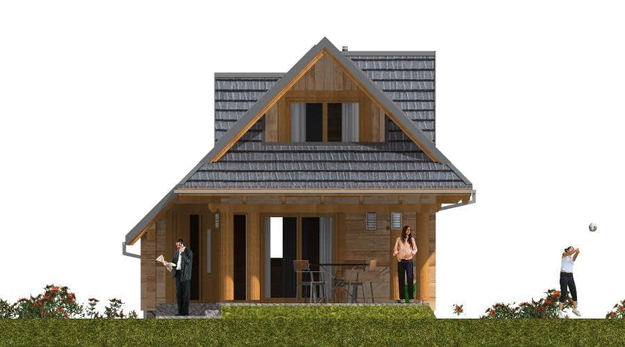 Tradycyjny dom z bala w nowoczesnym wydaniu to projekt, który łączy góralską stylistykę z elementami współczesnej architektury. Bryła nawiązuje do regionalnych domów drewnianych, ale dzięki dużym przeszkleniom, funkcjonalnemu układowi wnętrz i zadaszonemu tarasowi zyskuje nowoczesny charakter. Przestronne i jasne wnętrze Wnętrze domu z bala wyróżnia się niebanalnym układem pomieszczeń. Główną część parteru zajmuje otwarty pokój dzienny połączony z kuchnią, co optycznie powiększa przestrzeń. Duże przeszklenia sprawiają, że wnętrza są jasne i przytulne, a naturalne drewno podkreśla ich wyjątkowy klimat. Salon posiada wyjście na częściowo zadaszony taras, idealny do odpoczynku na świeżym powietrzu, niezależnie od pogody. Strefa prywatna na poddaszu Na poddaszu znajdują się dwie komfortowe sypialnie połączone praktycznym hallem. To idealne rozwiązanie dla rodziny – zapewnia prywatność i wygodę. Zalety technologii z bala Dom wykonany w technologii z bala to inwestycja dla osób ceniących ekologię i naturalne materiały. Drewno zapewnia zdrowy mikroklimat we wnętrzu, regulując wilgotność powietrza. Budynek jest ciepły i energooszczędny, co przekłada się na niższe koszty ogrzewania. Niepowtarzalny wygląd elewacji sprawia, że dom z bala doskonale komponuje się z otoczeniem – szczególnie w górskich lub leśnych krajobrazach. Ten dom z bala z poddaszem i tarasem łączy w sobie urok tradycji i zalety nowoczesnego budownictwa, tworząc wyjątkowe miejsce do życia i wypoczynku.Rzuty