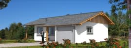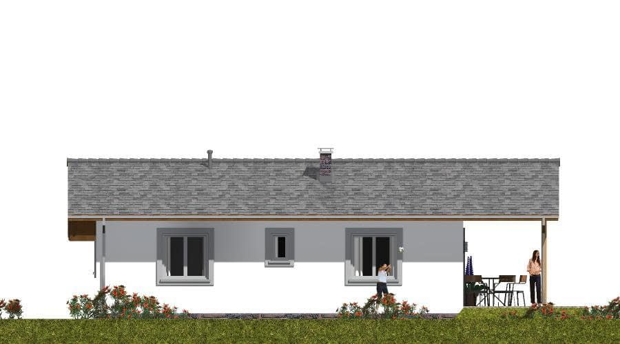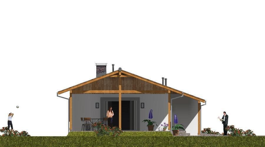 Projekt domu szkieletowego przedstawia nowoczesny budynek wolnostojący, parterowy, niepodpiwniczony, z dachem dwuspadowym o kącie nachylenia 20°. Dzięki lekkiej konstrukcji szkieletowej inwestycja jest szybka w realizacji, a sam dom energooszczędny, ciepły i przyjazny środowisku. Na parterze zaplanowano strefę dzienną. Wiatrołap prowadzi do głównego hallu, który stanowi centralny punkt komunikacji całego budynku. Z hallu dostępna jest: nowoczesna kuchnia, przestronny pokój dzienny z miejscem na kominek i wyjściem na taras, wygodna sypialnia, funkcjonalna łazienka. Duże przeszklenia w salonie sprawiają, że wnętrze jest pełne światła, a wyjście na taras pozwala płynnie połączyć przestrzeń domu z ogrodem. W projekcie przewidziano również garaż jednostanowiskowy, który połączony jest bezpośrednio z wiatrołapem, co zwiększa komfort codziennego użytkowania – szczególnie w sezonie jesienno-zimowym. Dom szkieletowy to rozwiązanie idealne dla osób ceniących nowoczesne budownictwo, ekologię oraz szybki czas realizacji inwestycji. Dzięki doskonałym parametrom izolacyjnym i funkcjonalnemu układowi pomieszczeń sprawdzi się zarówno jako dom całoroczny, jak i komfortowy dom wakacyjny.Rzuty