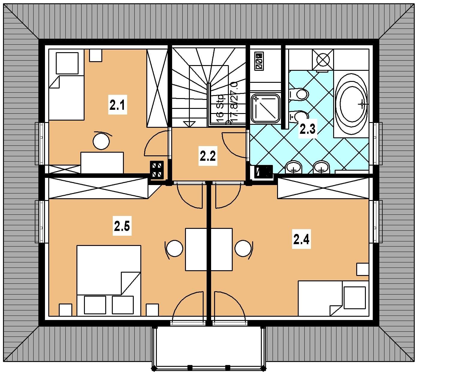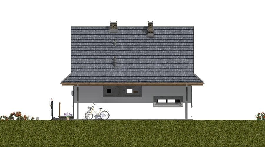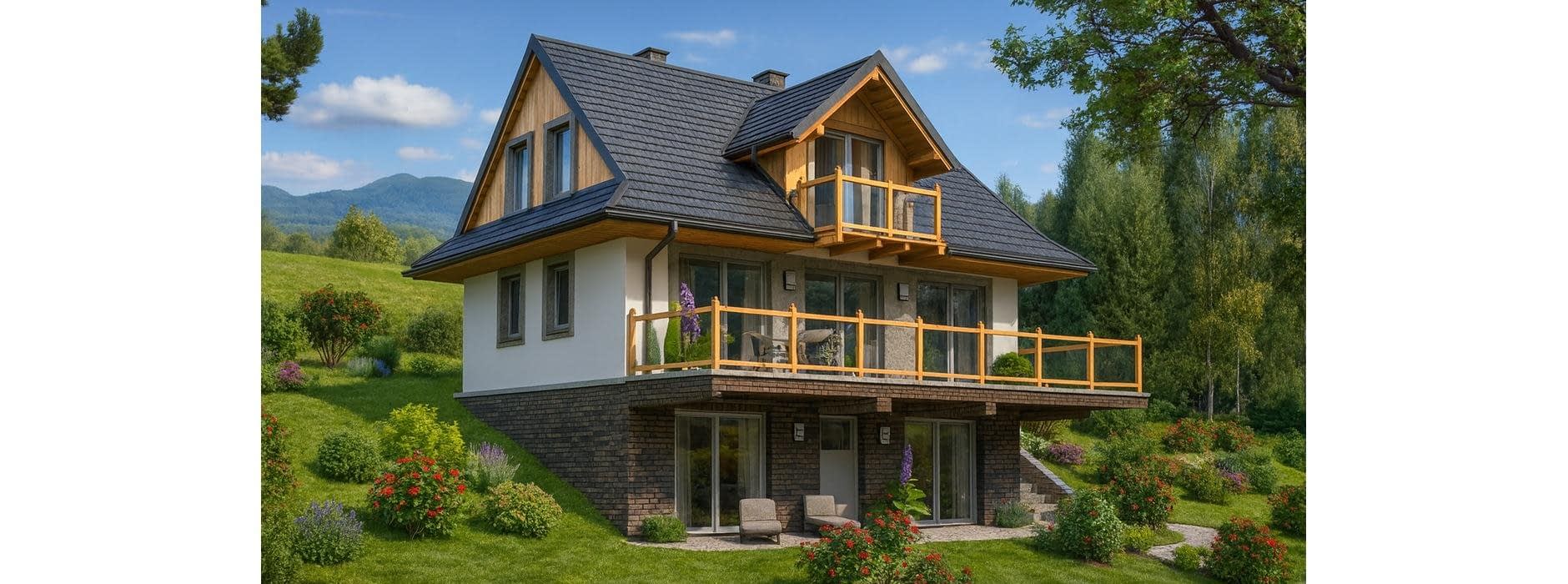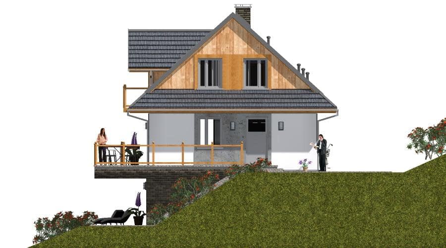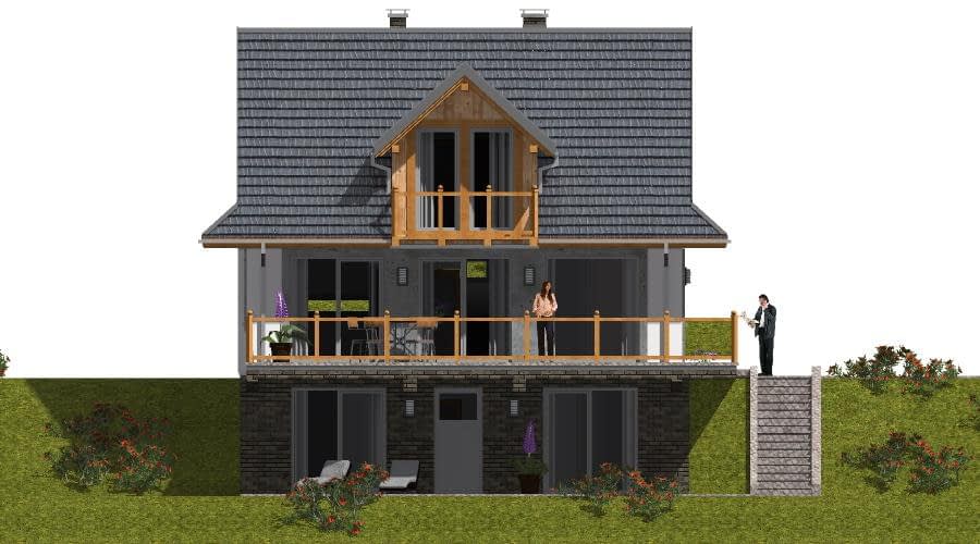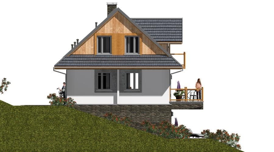 Projekt domu obejmuje dwa całkowicie niezależne lokale mieszkalne. Pierwsze mieszkanie znajduje się na parterze i poddaszu, natomiast drugie zostało zaprojektowane w przyziemiu. Dzięki takiemu układowi budynek może pełnić funkcję zarówno domu całorocznego, jak i komfortowego domu letniskowego. Budynek usytuowany jest na działce z dużym spadkiem terenu, co umożliwia podziwianie pięknych widoków z tarasu oraz z przestronnego, przeszklonego salonu połączonego z jadalnią. Dom zaprojektowano jako obiekt wolnostojący, parterowy, z użytkowym poddaszem i dachem dwuspadowym o kącie nachylenia 42°. Parter stanowi strefę dzienną – z wiatrołapu prowadzi wejście do hallu, z którego dostępny jest salon z miejscem na kominek i wyjściem na taras, kuchnia, łazienka oraz schody na poddasze. Na poddaszu zaplanowano część nocną: trzy sypialnie i łazienkę. W piwnicy mieści się drugi lokal mieszkalny z własnym pokojem dziennym, sypialnią, aneksem kuchennym i łazienką. Mieszkanie w przyziemiu ma także dodatkowe połączenie z parterem poprzez wewnętrzną klatkę schodową. Dom przewidziano w technologii z bala, co sprawia, że jest wyjątkowo przyjazny dla mieszkańców i w pełni wpisuje się w charakter budownictwa energooszczędnego.Rzuty