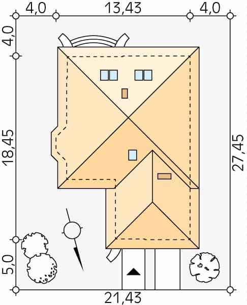 - Minimalne wymiary działki27.45 x 21.43m