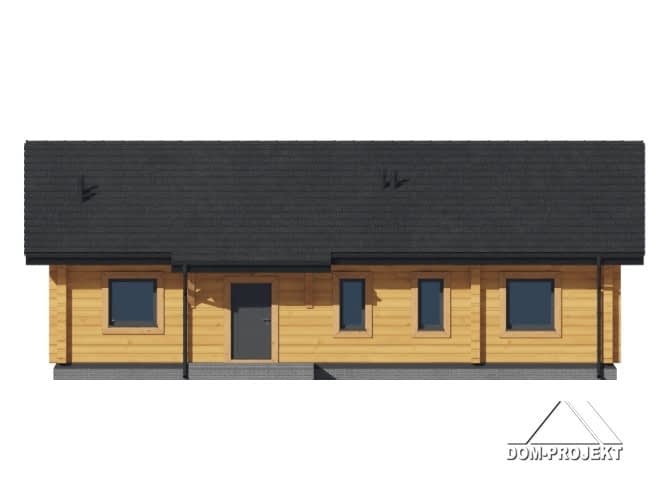 Parterowy dom drewniany. Duży salon z aneksem kuchennym, schodami na poddasze oraz wyjściem na zadaszony taras. Trzy pokoje, łazienka, pomieszczenie gospodarcze, komunikacja, wiatrołap, spiżarka. Na poddaszu antresola oraz strych. Zwarta bryła budynku oraz dach dwuspadowy sprzyjają szybkiej i taniej budowie oraz niskim kosztom eksploatacji.Rzuty