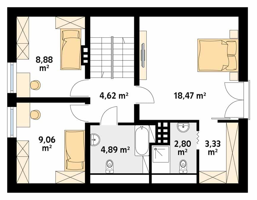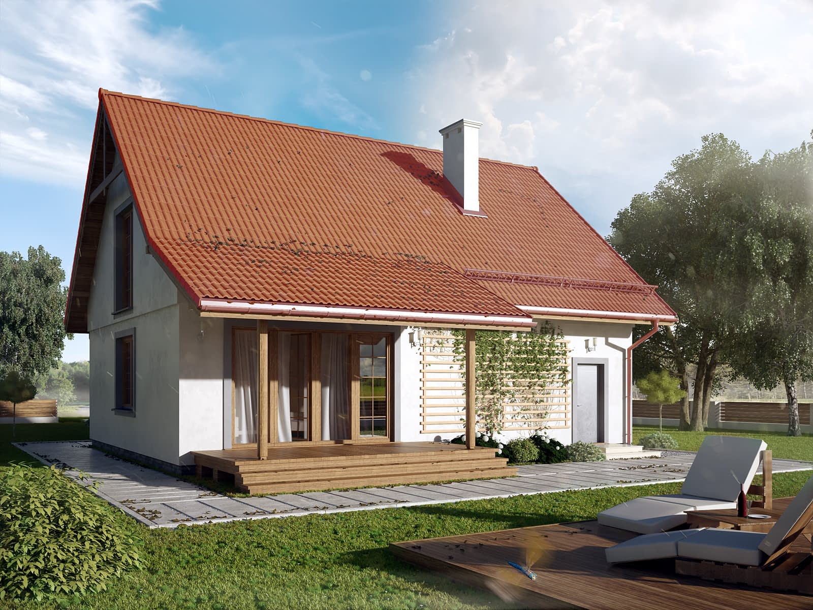 Agatka 2 to tradycyjny dom zaprojektowany z myślą o 4-osobowej rodzinie. Jest to dom energooszczędny charakteryzujący się zwartą bryłą, w której mieści się jednostanowiskowy garaż i kotłownia usytuowana tuż za nim. Agatka 2 to dom prosty i funkcjonalny, co z pewnością umożliwi wybudowanie go w ramach rozsądnych środków. W bryle budynku nie zastosowano elementów, które mogłyby podwyższać koszty budowy, typu: wykusz, lukarna, balkony, rozbudowane tarasy. W założeniu projekt Agatka 2 ma być prosty i tani w realizacji. Na parterze w części dziennej znajdują się: salon z jadalnią, kuchnia, spiżarnia oraz wc; w części gospodarczej: garaż oraz kotłownia. Na poddaszu zaprojektowano trzy sypialnie, w tym jedną z garderobą oraz łazienkę.Konstrukcja