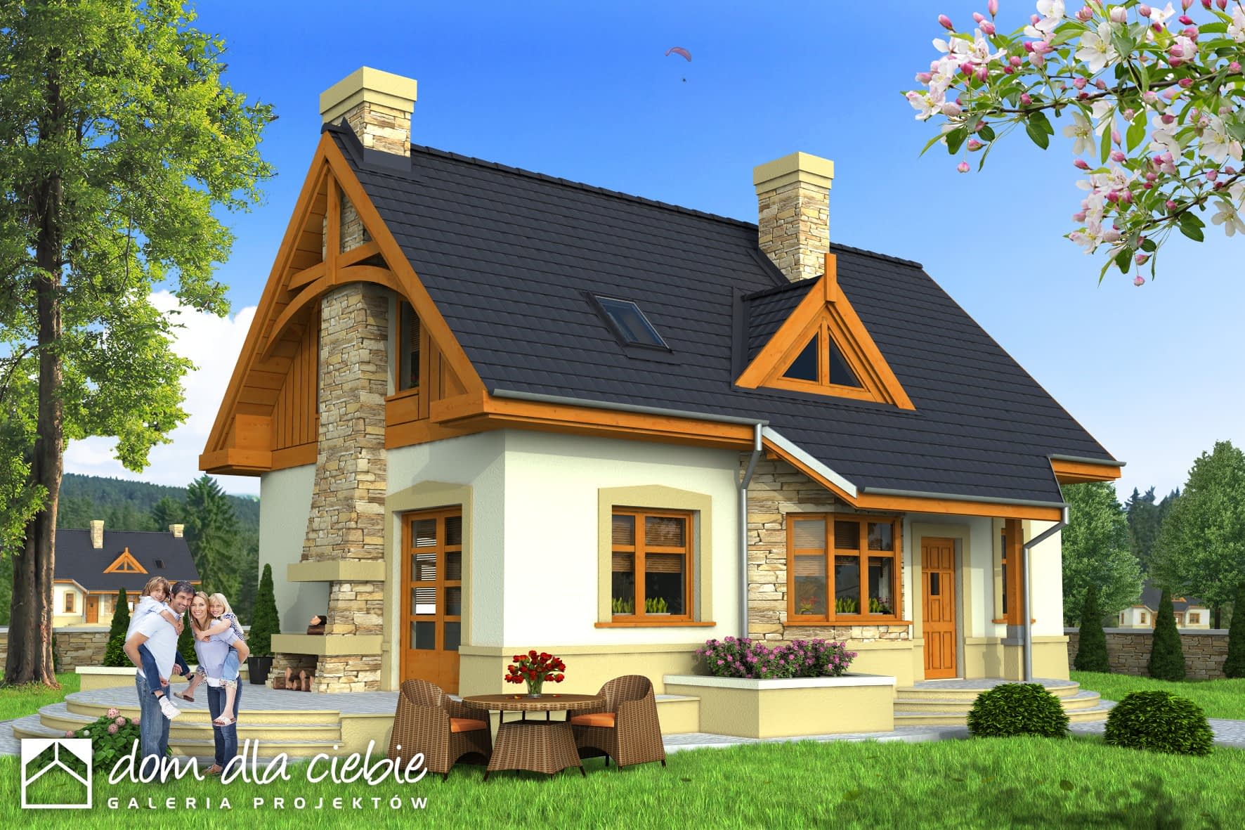 Agatka II to powiększona wersja bardzo popularnego projektu naszego autorstwa z Galerii Projektów Dom Dla Ciebie - o nazwie Agatka. W stosunku do swojej poprzedniczki Agatka II posiada aż 5 pokoi mieszkalnych i proporcjonalnie większe pozostałe pomieszczenia. Pomimo zmian rozmiarów domu jest on nadal atrakcyjną propozycją dla osób szukających przytulnego i niedrogiego domu z poddaszem użytkowym dla 4 do 5-cio osobowej rodziny. Parter jako część ogólna obejmuje: doświetlony z trzech stron pokój dzienny z kominkiem oraz miejscem do spożywania posiłków, kuchnię, pokój sypialny - od strony ogrodowej, łazienkę oraz dostępną z wiatrołapu pralnię + c.o. z piecem na paliwo gazowe. Poddasze to część prywatna, obejmująca: aż trzy sypialnie oraz wygodną wspólną łazienkę. Budynek posiada oryginalny zewnętrzny kominek tarasowy od strony ogrodowej. Dom z powodzeniem może być wykorzystany jako rekreacyjny - całoroczny... Sprawdź inne projekty domów - Zapraszamy !