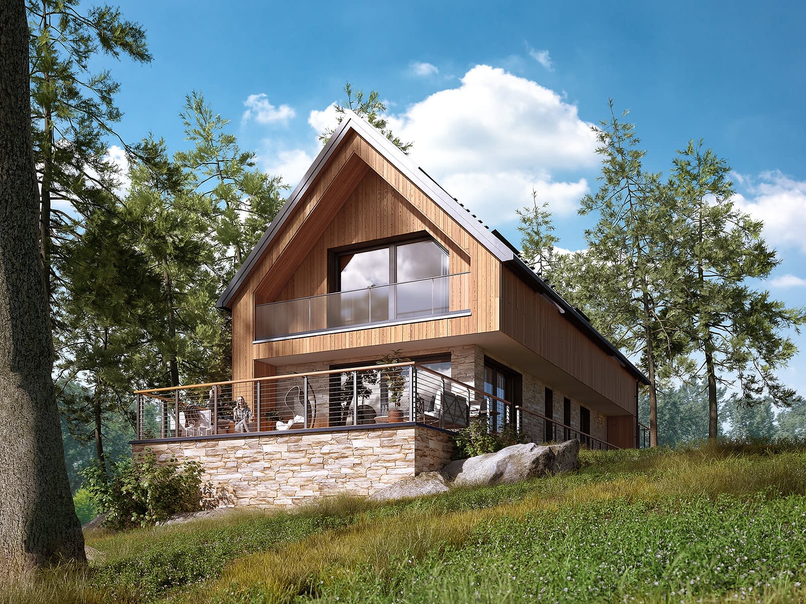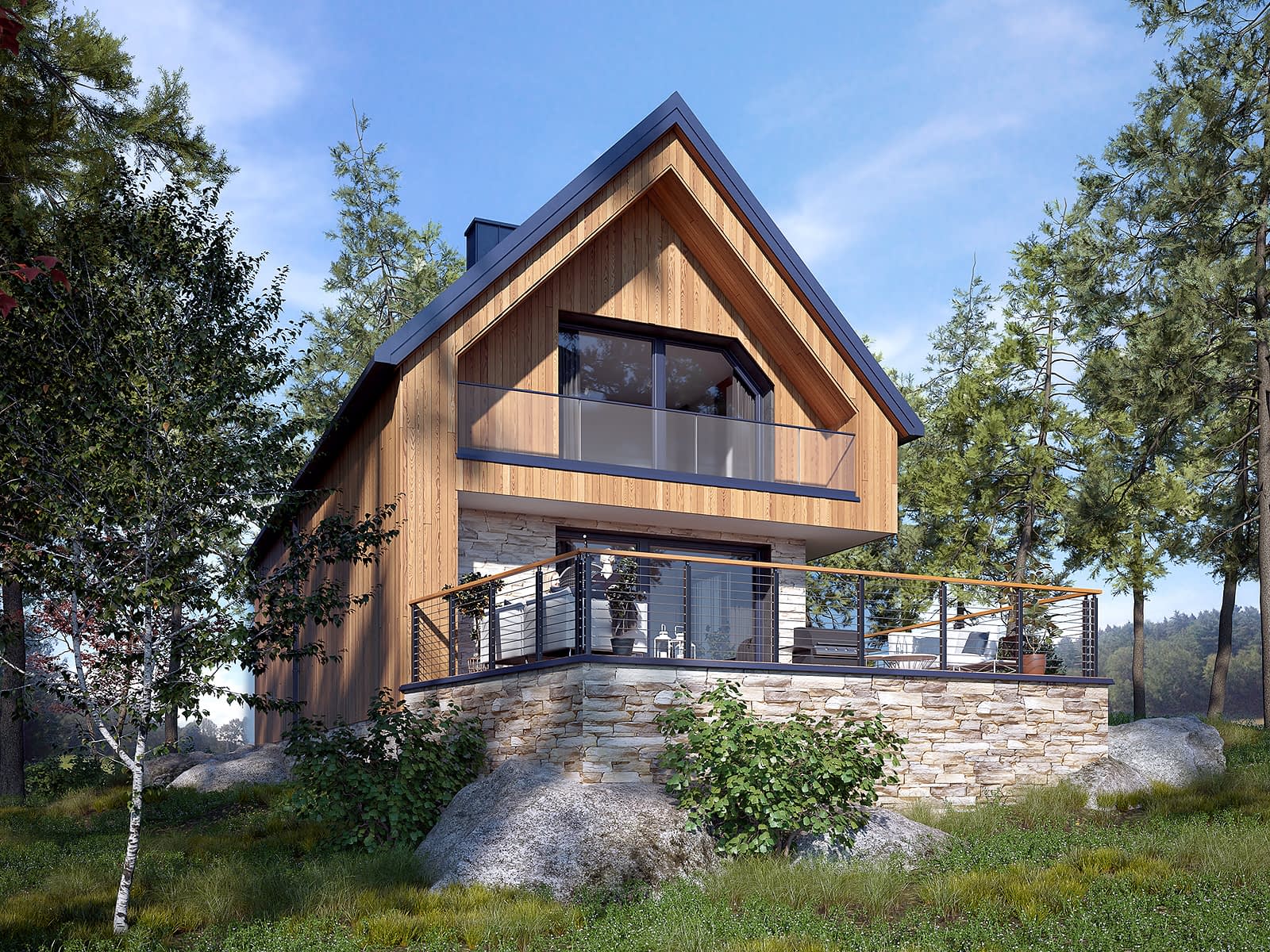AGREST to projekt domu z użytkowym poddaszem, w którym pojawiły się mieszkania pod wynajem. Nowoczesna bryła budynku została zaprojektowana na rzucie prostokąta i przykryta dwuspadowym dachem. Na elewacji pojawiła się drewniana szalówka oraz płyty elewacyjne imitujące kamień. Parter stanowi mieszkanie właścicieli domu. Gospodarze do dyspozycji mają dwie wygodne sypialnie, zamknięta kuchnie oraz część dzienną z salonem i jadalnią. Niewątpliwa zaletą części dziennej domu są panoramiczne przeszklenia oraz kominek. Poddasze zostało zaprojektowanie pod wynajem. Lokatorzy mają osobne wejście, do którego prowadzą zewnętrzne schody. W tej części domu pojawiły się dwie sypialnie, każda z prywatną łazienka oraz wspólna kuchnia. Dużą zaletą domu jest część rekreacyjna ulokowana w piwnicy. Zaprojektowano tu saunę, przy której pojawiła się łazienka, siłownię oraz bilard. Układ funkcjonalny piwnicy dopełnia kotłownia, w której pojawiła się pompa ciepła.Konstrukcja