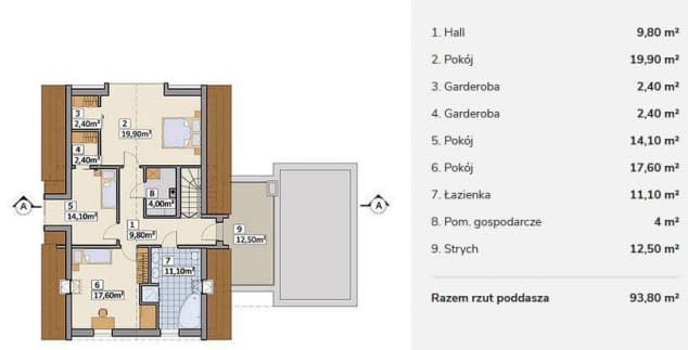Wygodny dom dla 4-5 osobowej rodziny. Parter prezentuje się jako strefa dzienna do przeżywania wspólnych chwil. Otwarta kuchnia połączona z jadalnią oraz przestronny salon z kominkiem na obniżonej części parteru. Możliwość aranżacji pomieszczenia na parterze na gabinet lub dodatkowy pokój dla gości. Poddasze, to strefa odpoczynku. Przewidziano dwa 1 os. pokoje i jeden 2-os. garderoby oraz ergonomiczną łazienkę. Na poddaszu znajduje się również niewielkie pomieszczenie techniczne np. na rekuperacje. Dom poprzez starannie dobrane materiały jest zakwalifikowany do domów energooszczędnych. Zaprojektowane przegrody spełniają normy bardzo dobrej izolacyjności cieplnej.