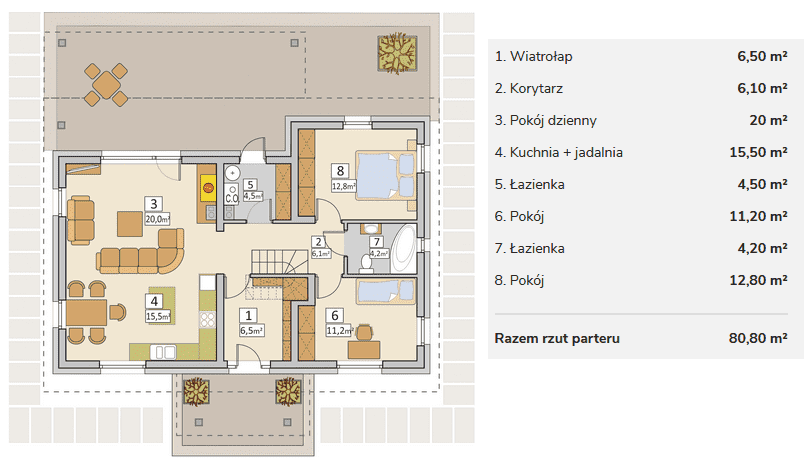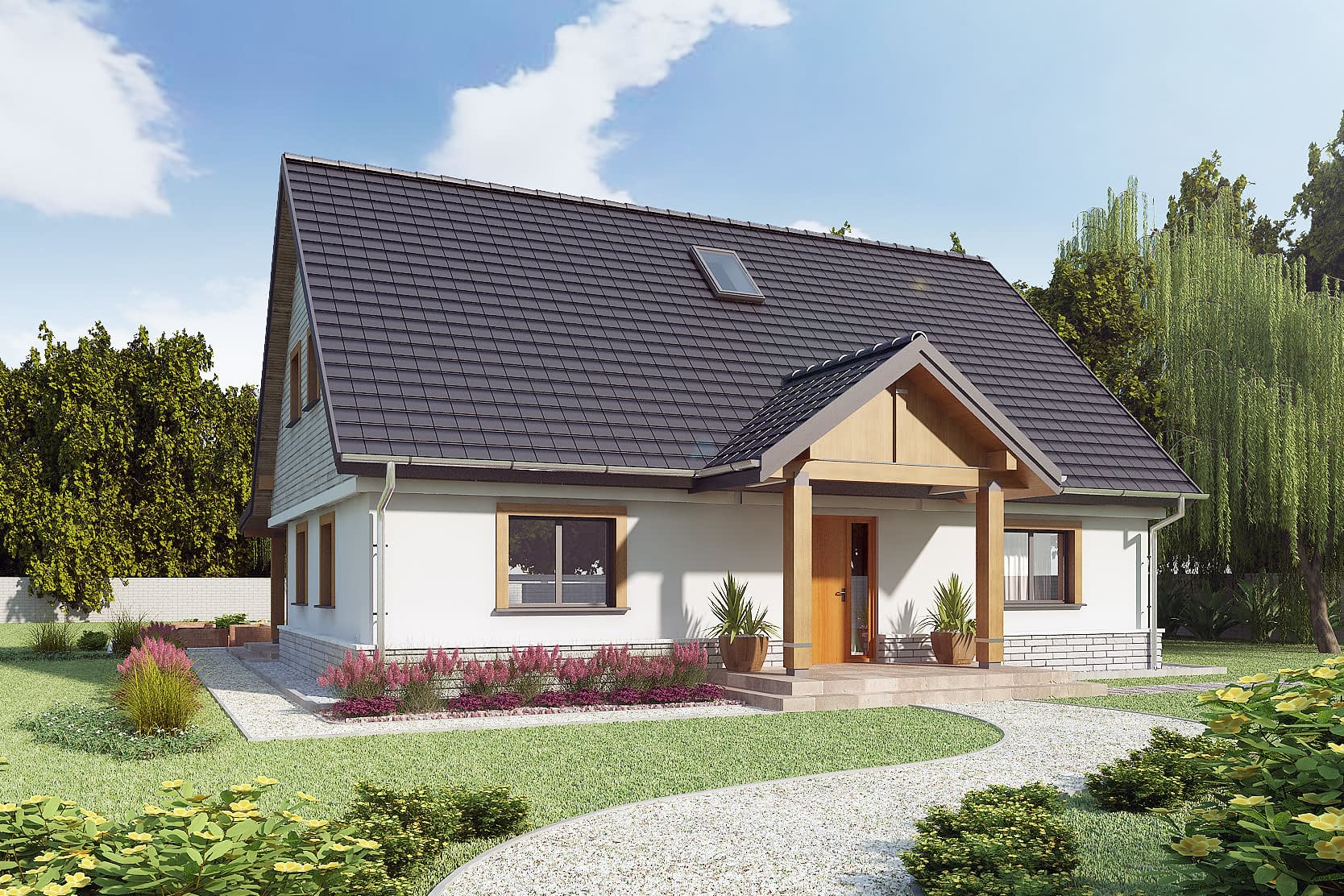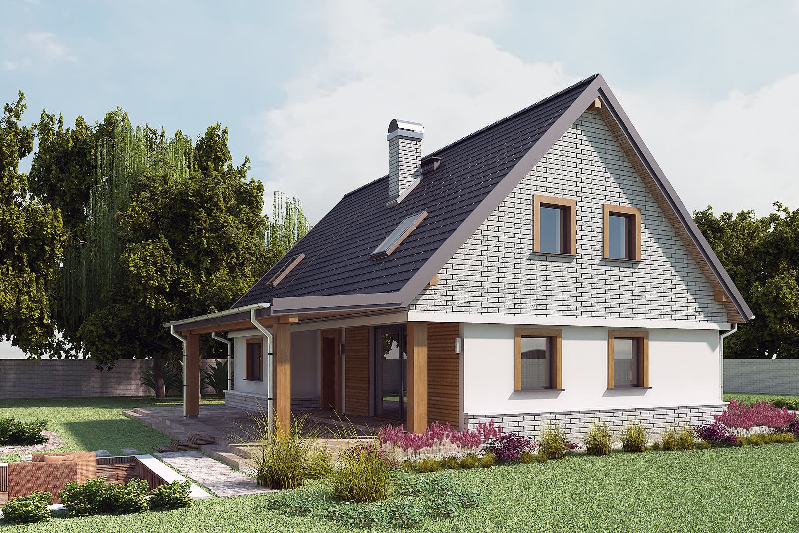 AJR_02 – tak wygląda dom na miarę twoich marzeń, znajdziesz w nim wszystko czego potrzebujesz. Z zewnątrz wyważony i proporcjonalny klasyk, dobrze dobrane materiały i ciepłe wykończenie drewniane to eleganckie i przytulne oblicze tego domu. Wejście główne zaakcentowane zadaszonym portykiem. Salon z wyjściem na taras jest otwarty na ogród, zadaszenie będzie Cię chroniło przed deszczem i upałem, tu zawsze będziesz mógł wyjść i poczuć się bezpiecznie. Dalej w głąb ogrodu możesz przenieść się z przyjaciółmi do części rekreacyjnej, nieco obniżonej względem terenu.