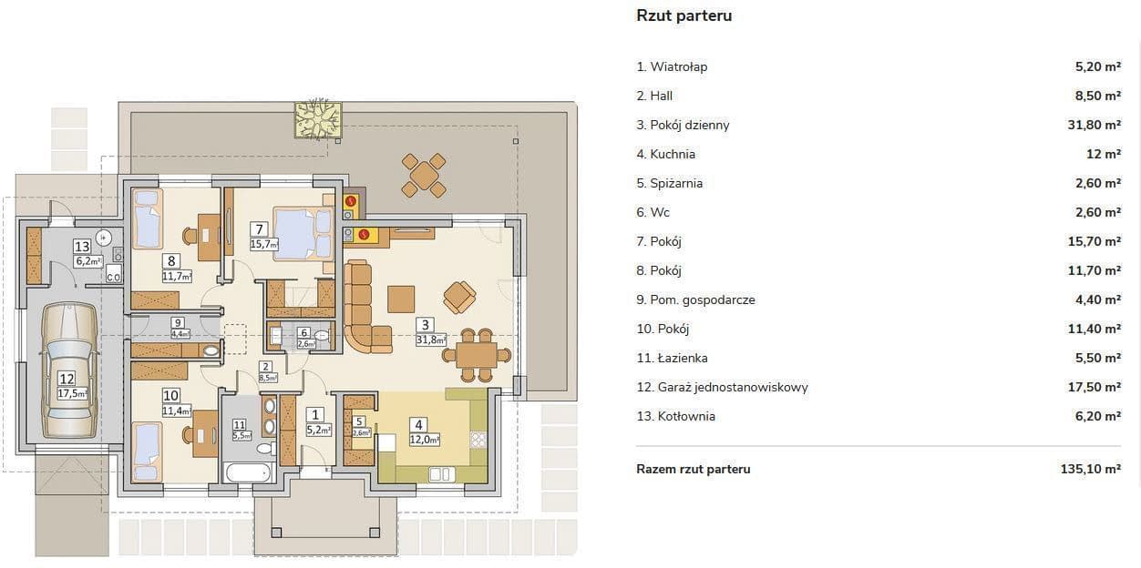 Klasyczny, prosty dom z dachem dwuspadowym. Powiększona wersja bardzo cenionego przez Inwestorów projektu AJR_03. Łatwy w wykonaniu i tani w budowie, duża swoboda w realizacji systemem gospodarczym. Dzięki wyglądowi zewnętrznemu, łatwości wykonania, bardzo wygodnie rozplanowanej powierzchni - nadaje się dla standardowej 4-os. rodziny w zabudowie miejskiej. To również dobry pomysł na podmiejską daczę. Miłośnicy klasyki znajdą w nim funkcjonalnie rozwiązane wnętrze oraz ciekawe detale wykończenia domu. Na parterze została wyodrębniona część dzienna z przestronnym salonem, jadalnią, kuchnią i spiżarnią. Druga część domu to strefa nocna i indywidualne pokoje dla domowników. W środkowej części dostępna jest łazienka oraz dodatkowy WC. W tym miejscu można zaplanować schody na ewentualne poddasze (możliwość adaptacji części poddasza na użytkowe – nad sypialniami powstanie dodatkowa powierzchnia użytkowa ok. 30m). Kotłownia z pralnią - suszarnią znajduje się po lewej stronie domu. Pomieszczenie to posiada wyjście na zewnątrz i stanowi dogodne przejście do wnętrza domu (w wersji z garażem). Wygodnym i przytulnym dopełnieniem Twojego Domu jest zadaszony taras. W połączeniu z dodatkowymi atrakcjami na działce stanowi eleganckie dopełnienie całości, naturalne materiały w postaci deskowania wyróżniają ten zakątek spośród całego domu. Budynek zalicza się do energooszczędnych. Można w nim zastosować również wentylację mechaniczną.