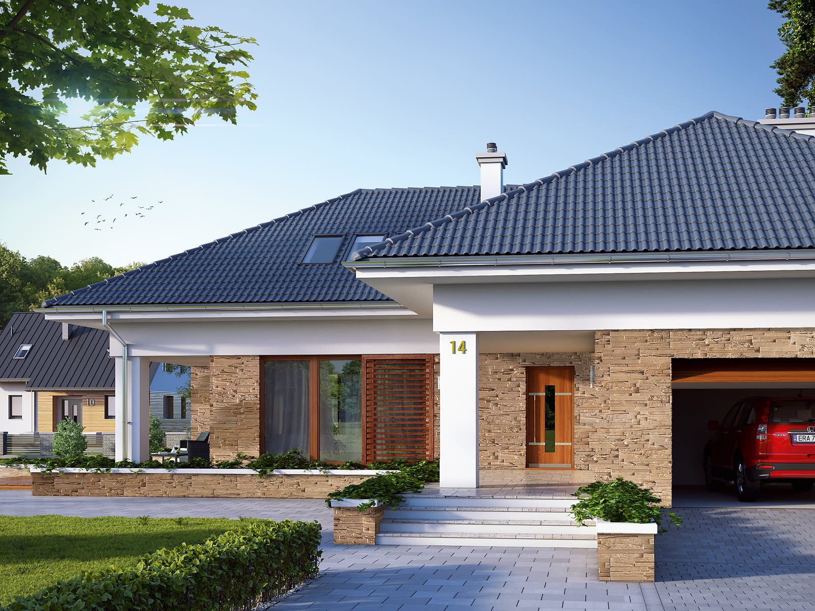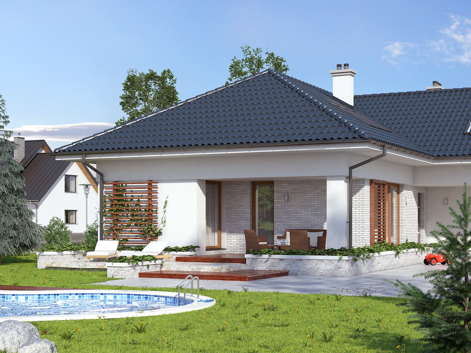 Jednorodzinny budynek mieszkalny, parterowy z użytkowym poddaszem, niepodpiwniczony, przeznaczony dla 6 - 7-osobowej rodziny. W części dziennej przewidziano salon z kominkiem oraz kuchnię z jadalnią. W części nocnej parteru zaprpjektowano trzy sypialnie z łazienką, zaś w gospodarczej garaż i kotłownię. Na poddaszu umieszczono trzy duże sypialnie i łazienkę. Elewacje budynku są utrzymane w nowoczesnej stylistyce. Rozległe tarasy harmonijnie łączą wnętrza domu z ogrodem.Konstrukcja