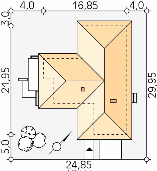 Jednorodzinny budynek mieszkalny, niepodpiwniczony, z wjazdem od południa. Dużym atutem projektu są cztery sypialnie, co umożliwia wygodne funkcjonowanie 5-osobowej rodziny. W części dziennej zaprojektowano salon oraz kuchnię z jadalnią, skąd prowadzi wyjście na zadaszony taras. Część nocną stanowią cztery sypialnie, w tym jedna z własną łazienką i garderobą oraz łazienka. W części gospodarczej przewidziano przestronną kotłownię oraz dwustanowiskowy garaż.Konstrukcja