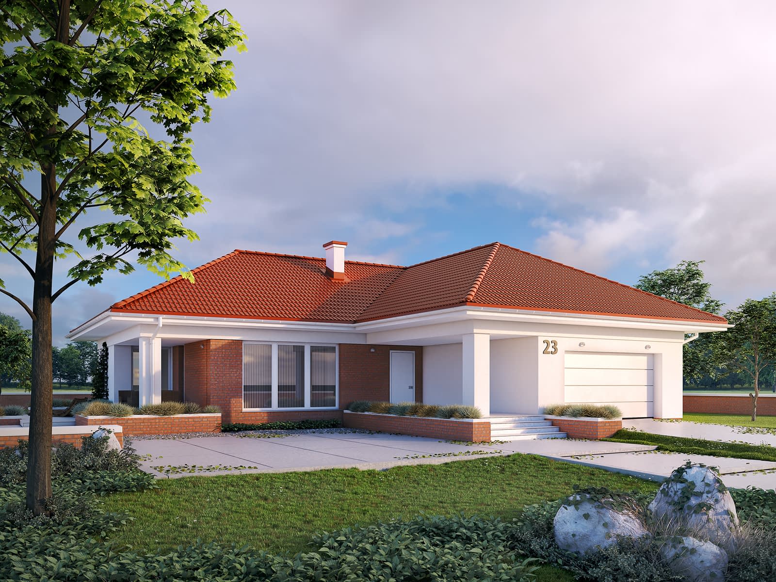 Jednorodzinny budynek mieszkalny, parterowy, niepodpiwniczony, przeznaczony dla 4-osobowej rodziny. W części dziennej przewidziano salon oraz kuchnię z jadalnią, w nocnej trzy sypialnie z łazienką, w gospodarczej garaż, kotłownię, wc oraz garderobę. Budynek został utrzymany w nowoczesnej stylistyce, której cechą charakterystyczną są duże przeszklenia. Budynek przeznaczono na działkę z wjazdem od południa.Konstrukcja