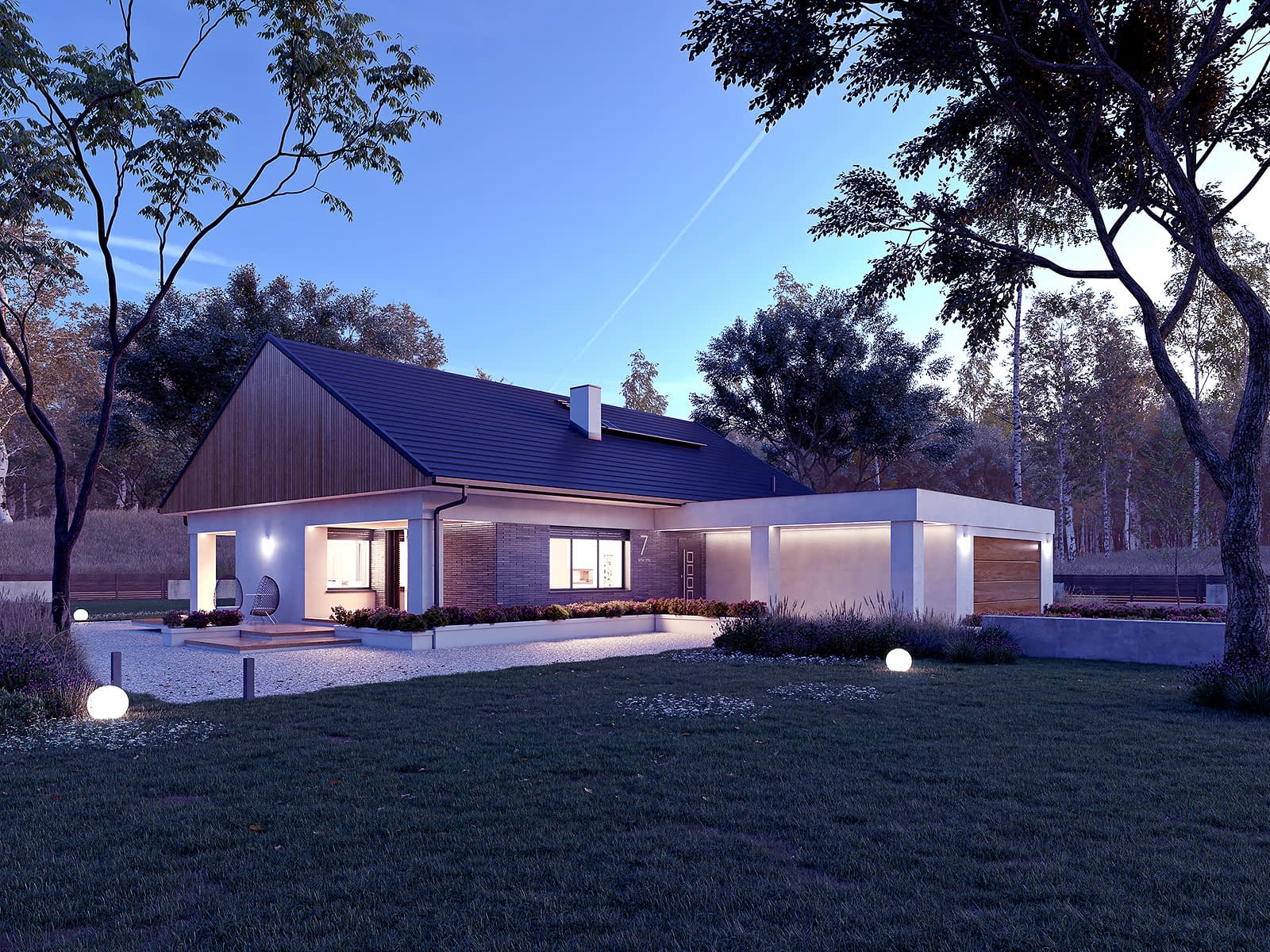 Budynek mieszkalny, parterowy, niepodpiwniczony, przeznaczony dla 4 -osobowej rodziny. Bryła budynku przykryta dachem dwuspadowym, zaś nad garażem i wejściem głównym znajduje się stropodach płaski. W części dziennej zaprojektowano salon połączony z kuchnią i jadalnią z wyjściem na zadaszony taras, okalający budynek z dwóch stron. W części nocnej znajdują się trzy sypialnie wraz z rodzinną łazienką. Do budynku przylega garaż na dwa stanowiska z przejściem do kotłowni. Ze względu na usytuowanie salonu budynek idealnie pasuje do działki z wjazdem od strony południowej.Konstrukcja